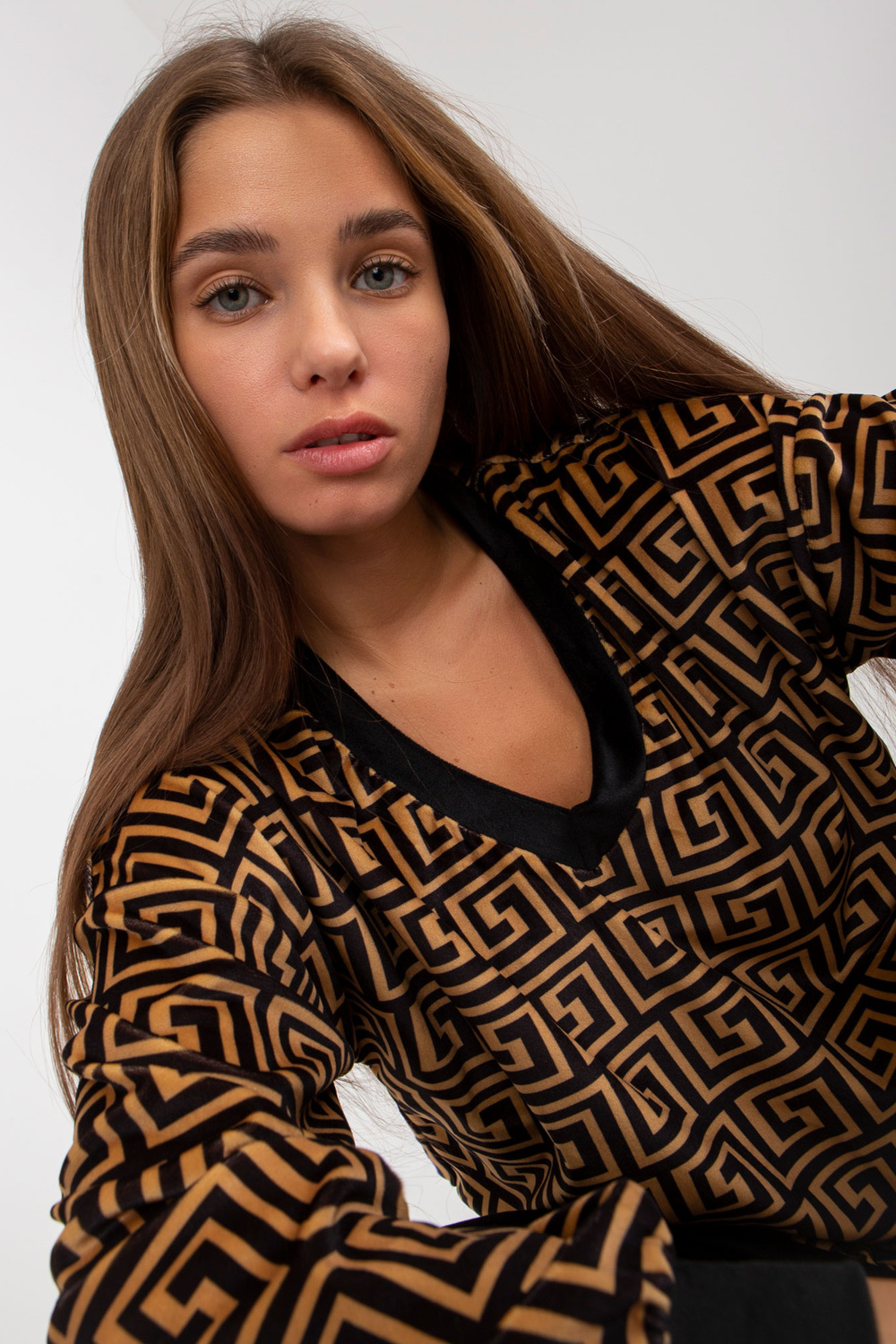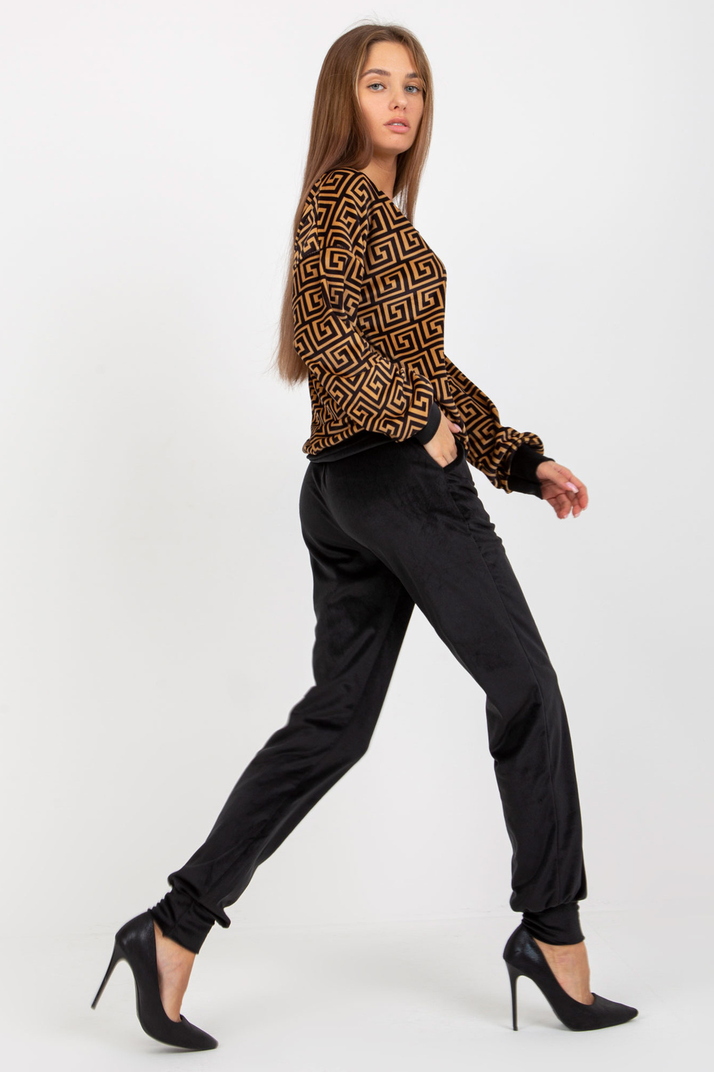 Komplekta izmēri S/M izmērā, mērot plakaniski: sporta krekla platums zem rokām - 57 cm, piedurknes garums - 60 cm, džempera garums - 60 cm, bikšu platums jostasvietā - 34 cm, vidukļa augstums - 31 cm, bikšu garums - 97 cm .<