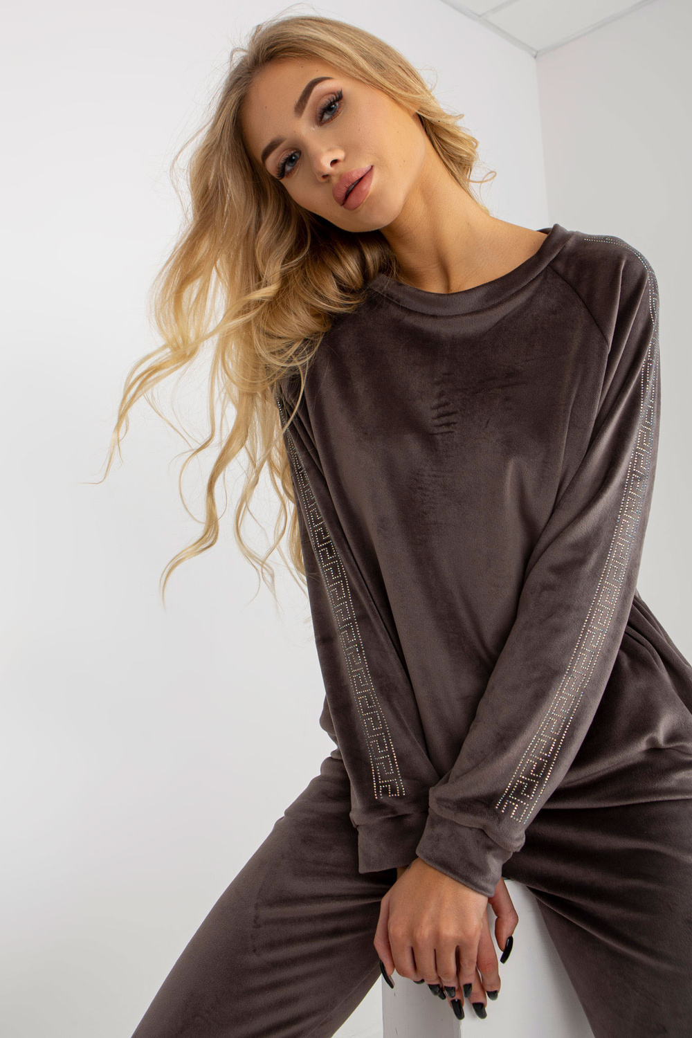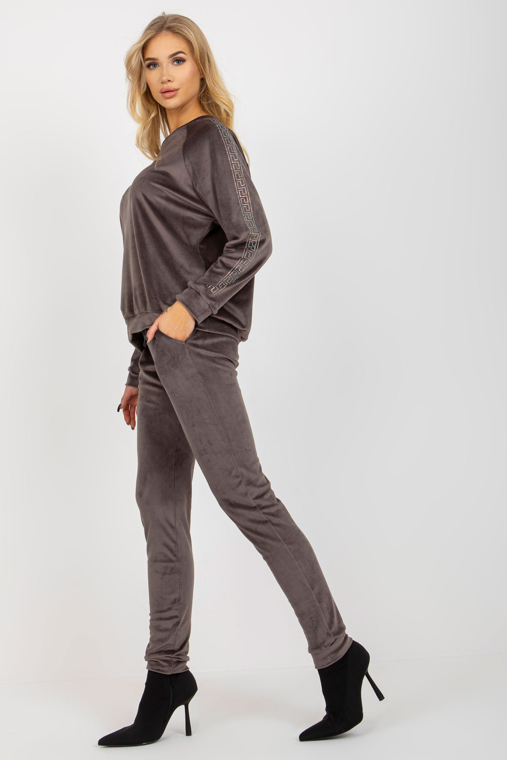 Tumši pelēks sieviešu velūra komplekts ar rhinestones aplikācijām.