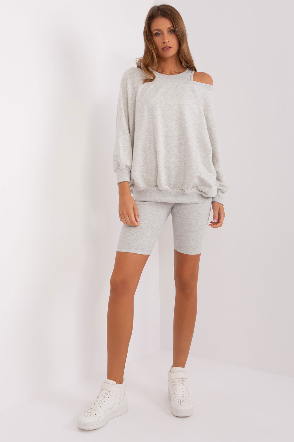 Komplekta izmēri viena izmēra izmērā, mērot plakanā: sporta krekla platums zem rokas - 69 cm, piedurknes garums - 56 cm, sporta krekla garums - 68 cm, augšdaļas platums zem rokām - 32 cm, augšdaļas garums - 41 cm, vidukļa platums - 30 cm, bikera garums - 46 cm.