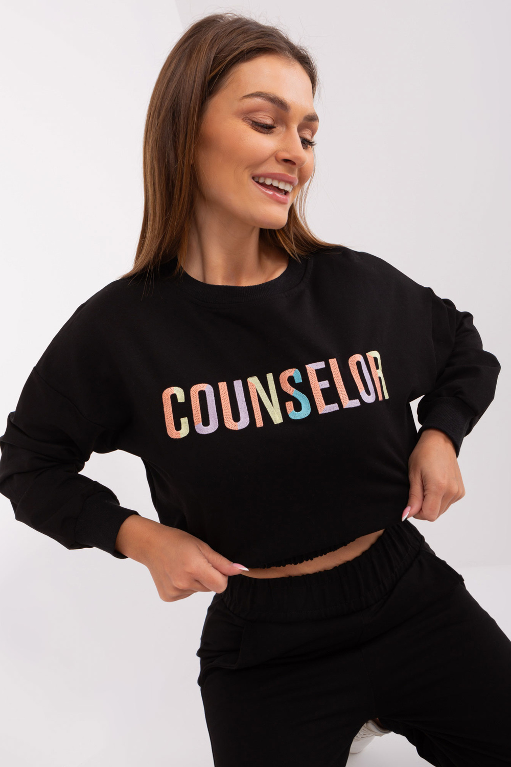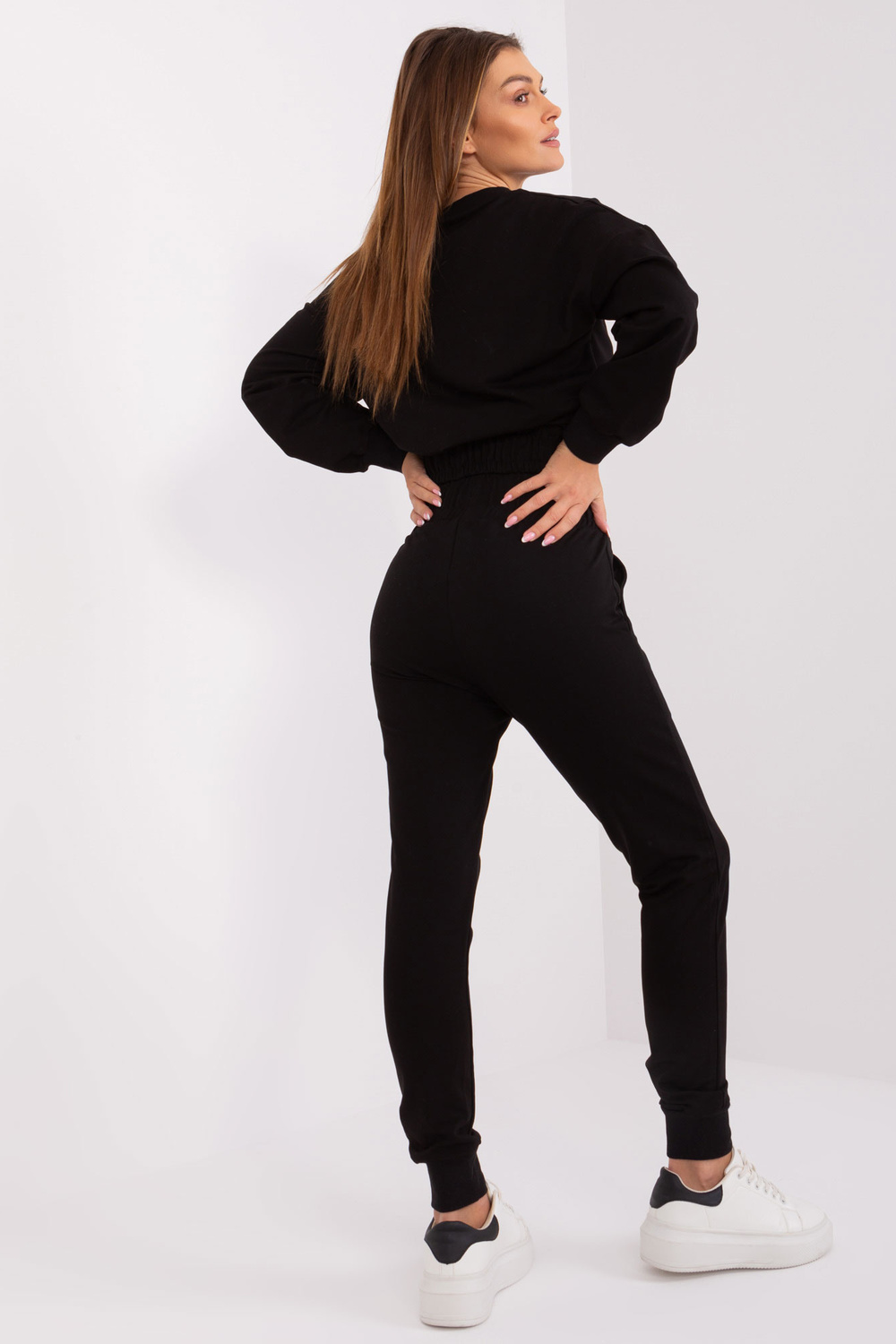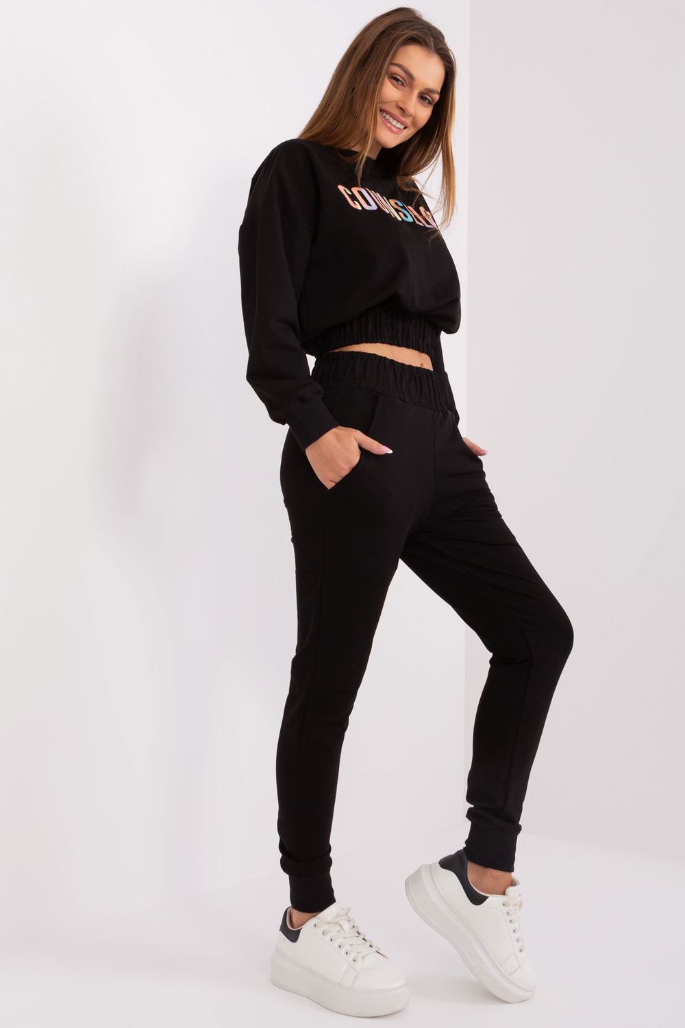 Melns kokvilnas komplekts ar sporta kreklu ar krāsainu uzrakstu .