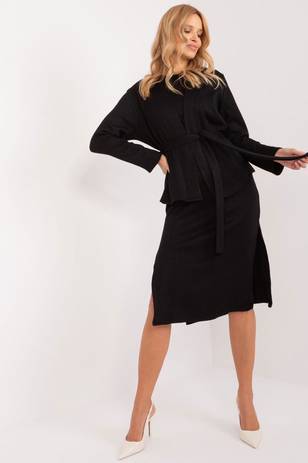 Komplekta izmēri S/M izmērā, mērot plakaniski: apmetņa platums zem padusēm - 57 cm, piedurknes garums - 59 cm, apmetņa garums - 58 cm, kleitas platums zem rokām - 41 cm, kleitas garums - 112 cm.