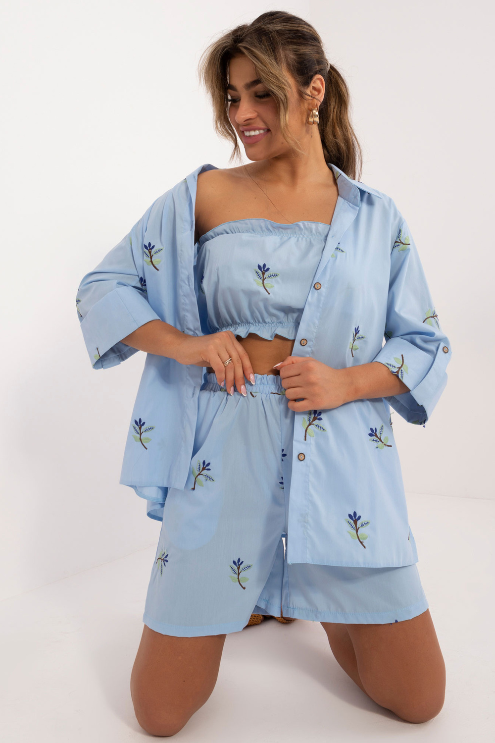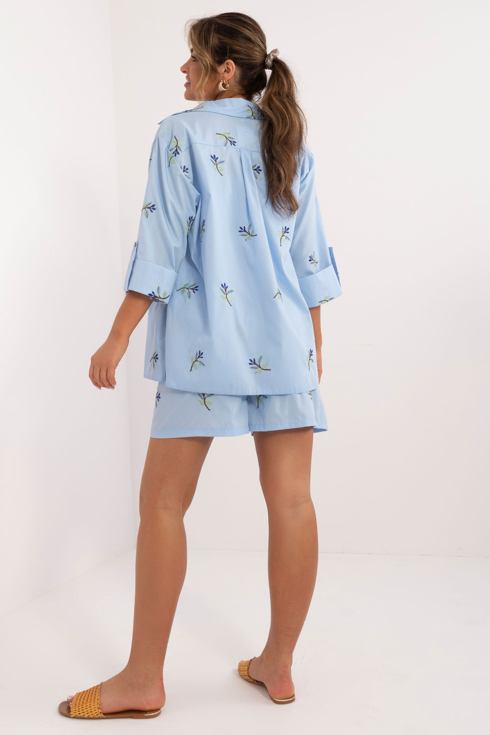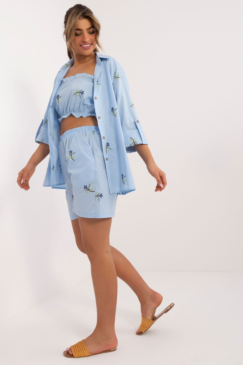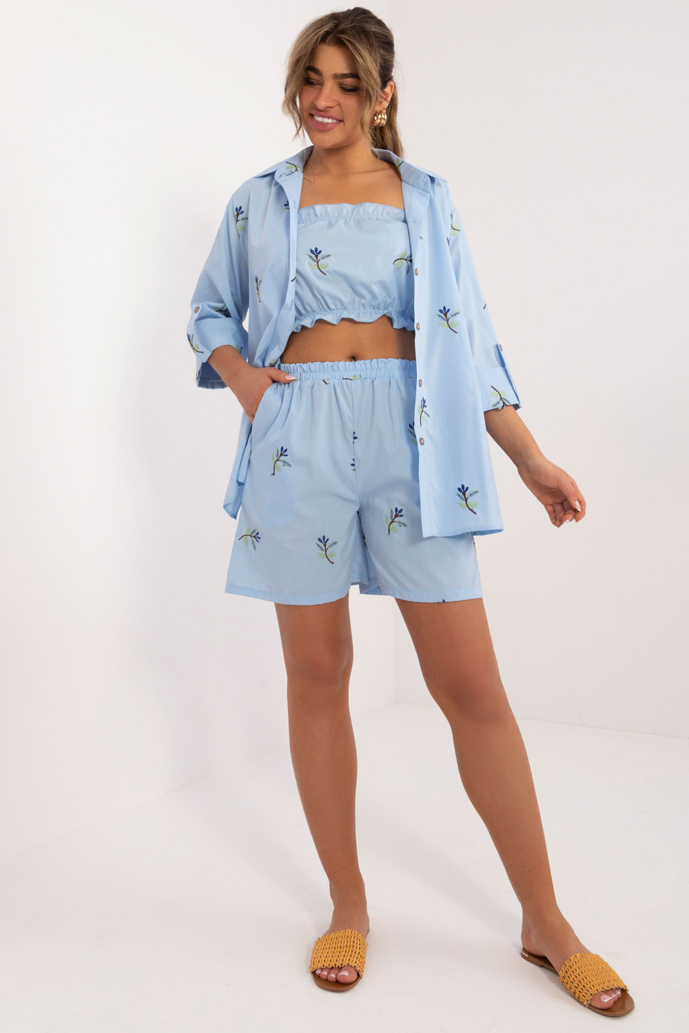 Komplekta izmēri S/M izmērā mērot plakanu: krekla platums zem padusēm - 45 cm, piedurknes garums - 40 cm, krekla garums - 72 cm, augšdaļas garums - 22 cm, augšdaļas platums zem rokām - 32 cm, šortu viduklis platums - 46 cm, šortu garums - 95 cm.