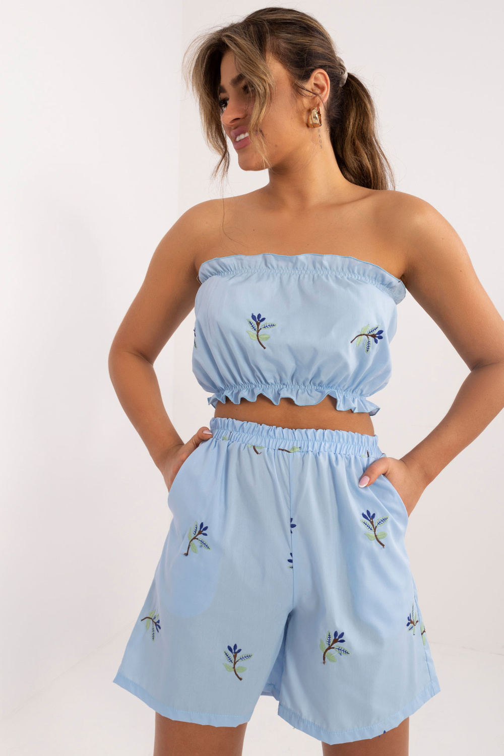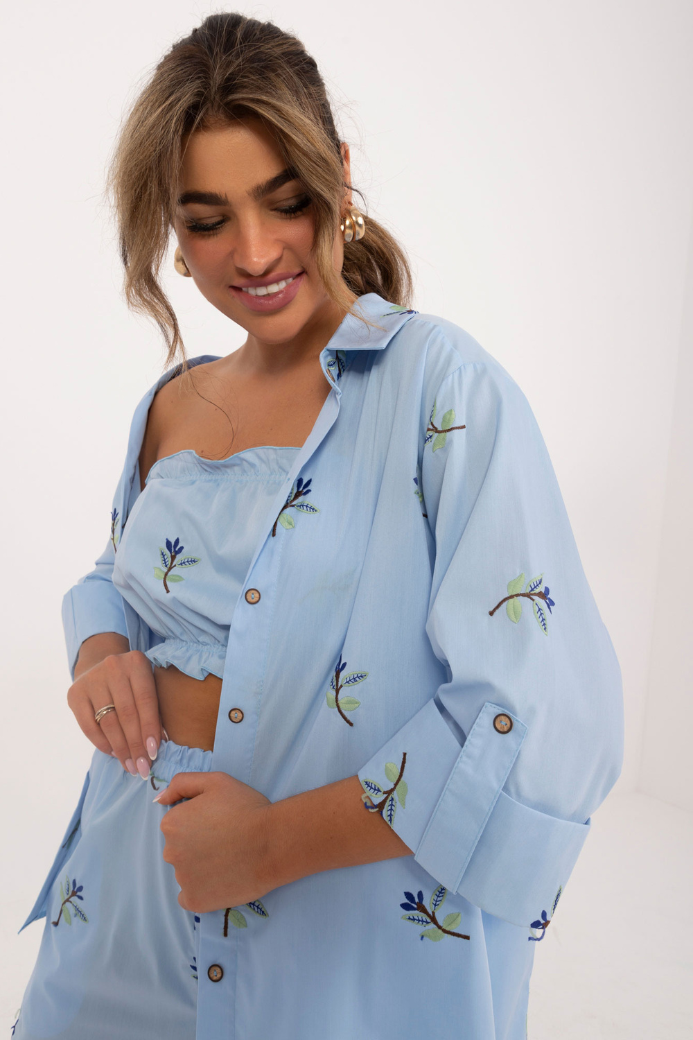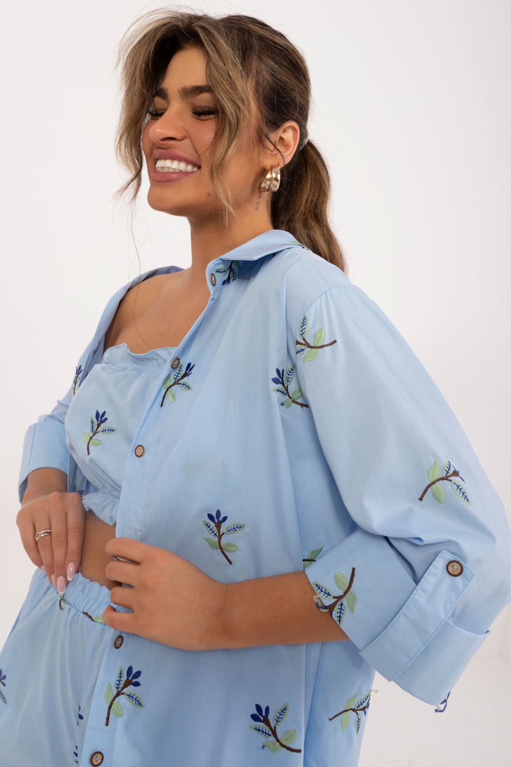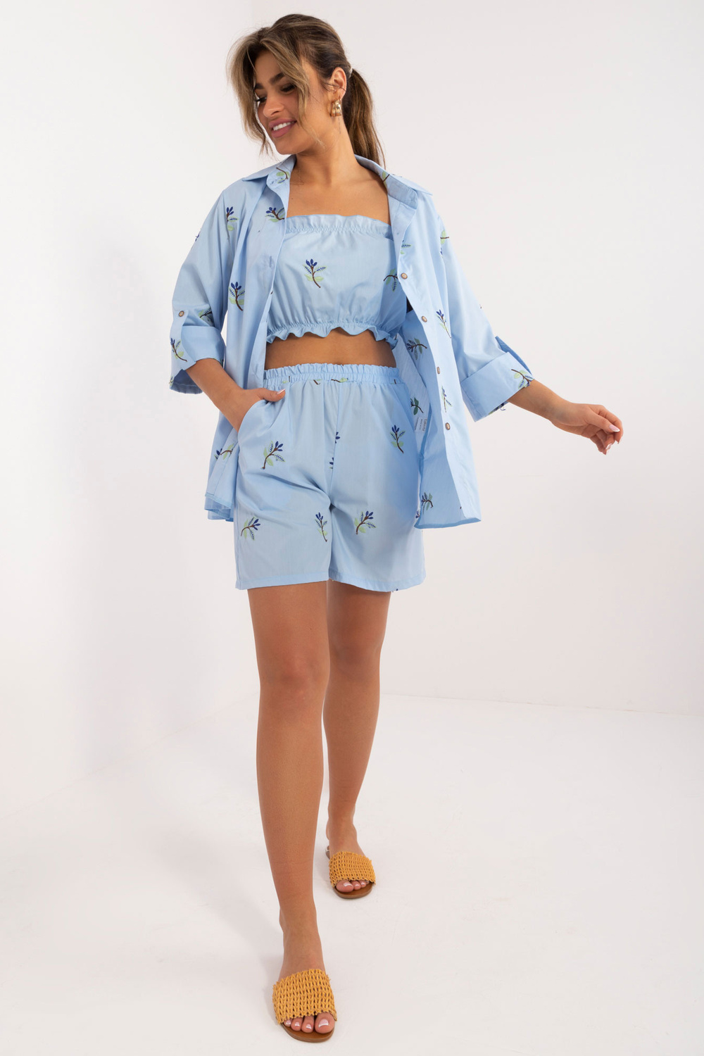 Komplekta izmēri S/M izmērā mērot plakanu: krekla platums zem padusēm - 45 cm, piedurknes garums - 40 cm, krekla garums - 72 cm, augšdaļas garums - 22 cm, augšdaļas platums zem rokām - 32 cm, šortu viduklis platums - 46 cm, šortu garums - 95 cm.