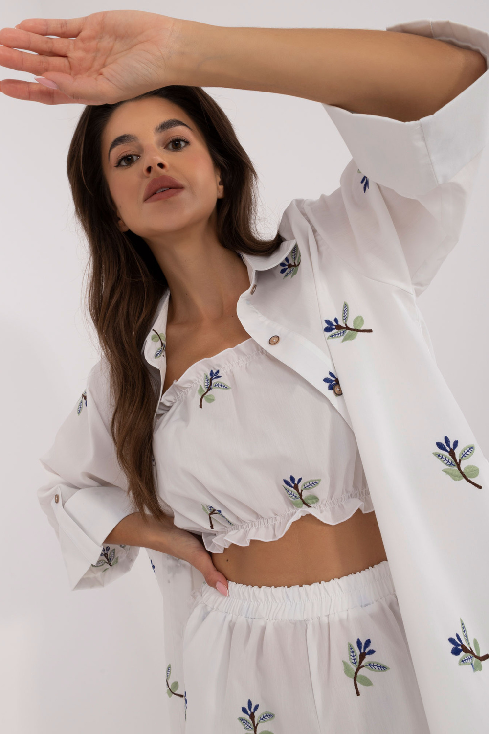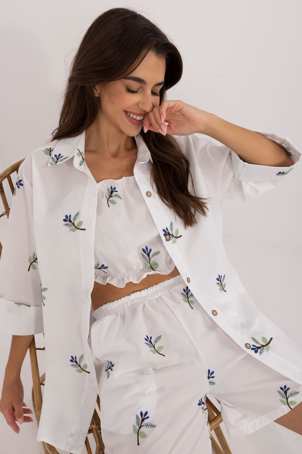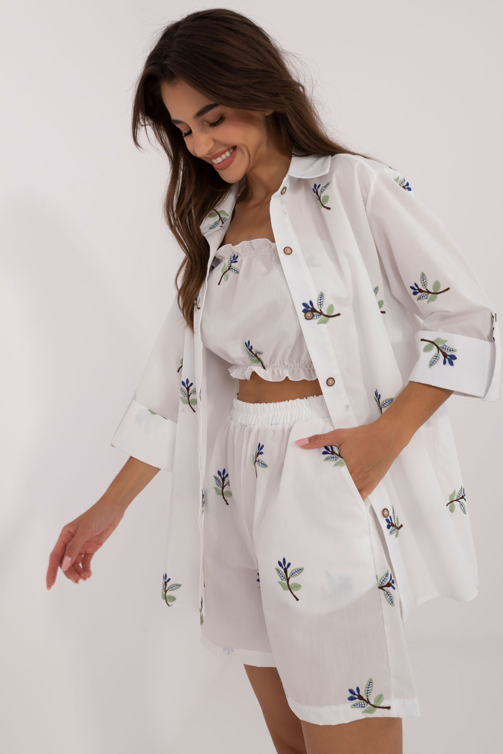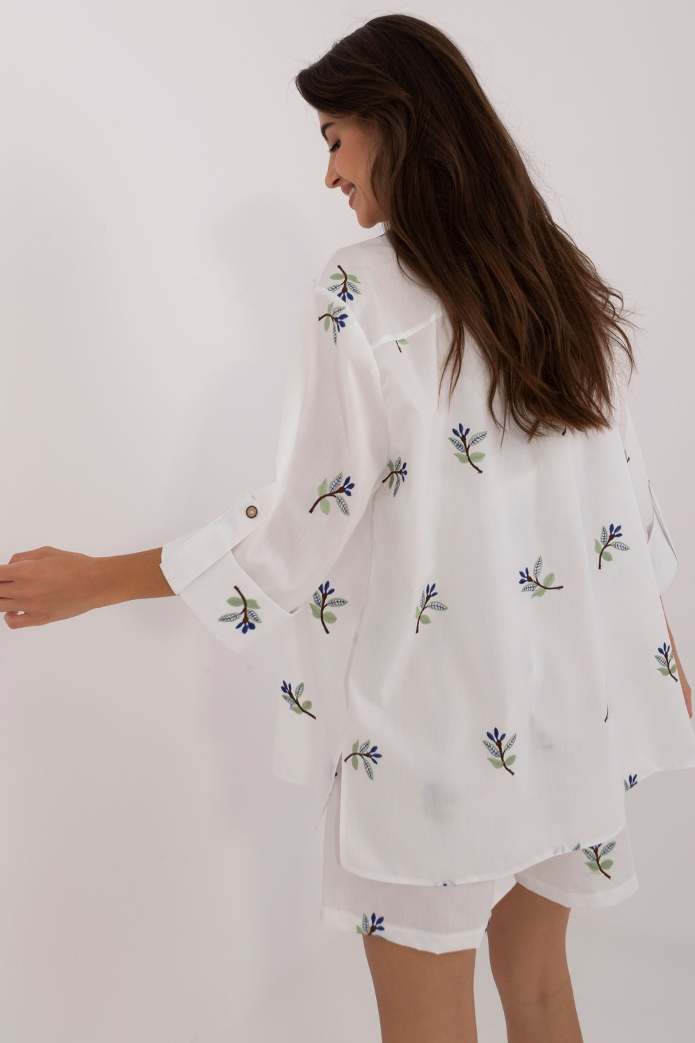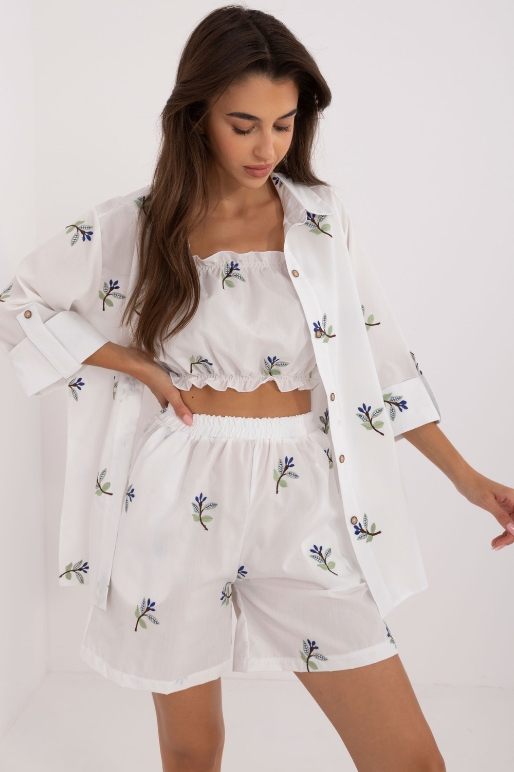 Komplekta izmēri S/M izmērā mērot plakanu: krekla platums zem padusēm - 45 cm, piedurknes garums - 40 cm, krekla garums - 72 cm, augšdaļas garums - 22 cm, augšdaļas platums zem rokām - 32 cm, šortu viduklis platums - 46 cm, šortu garums - 95 cm.