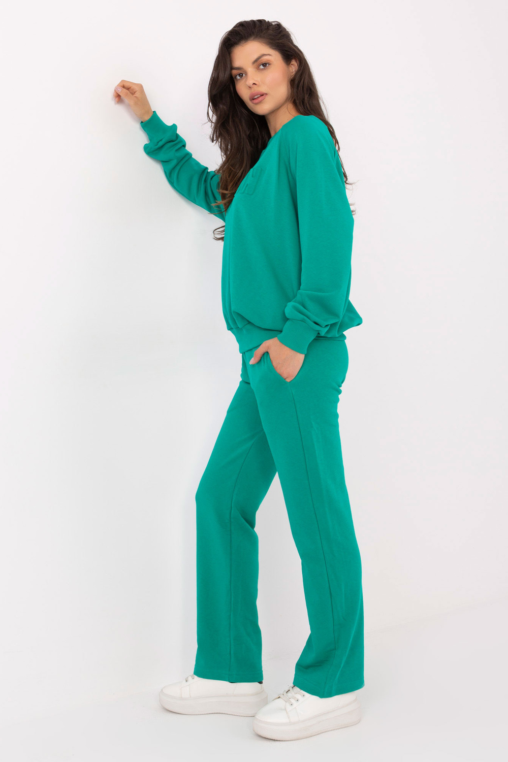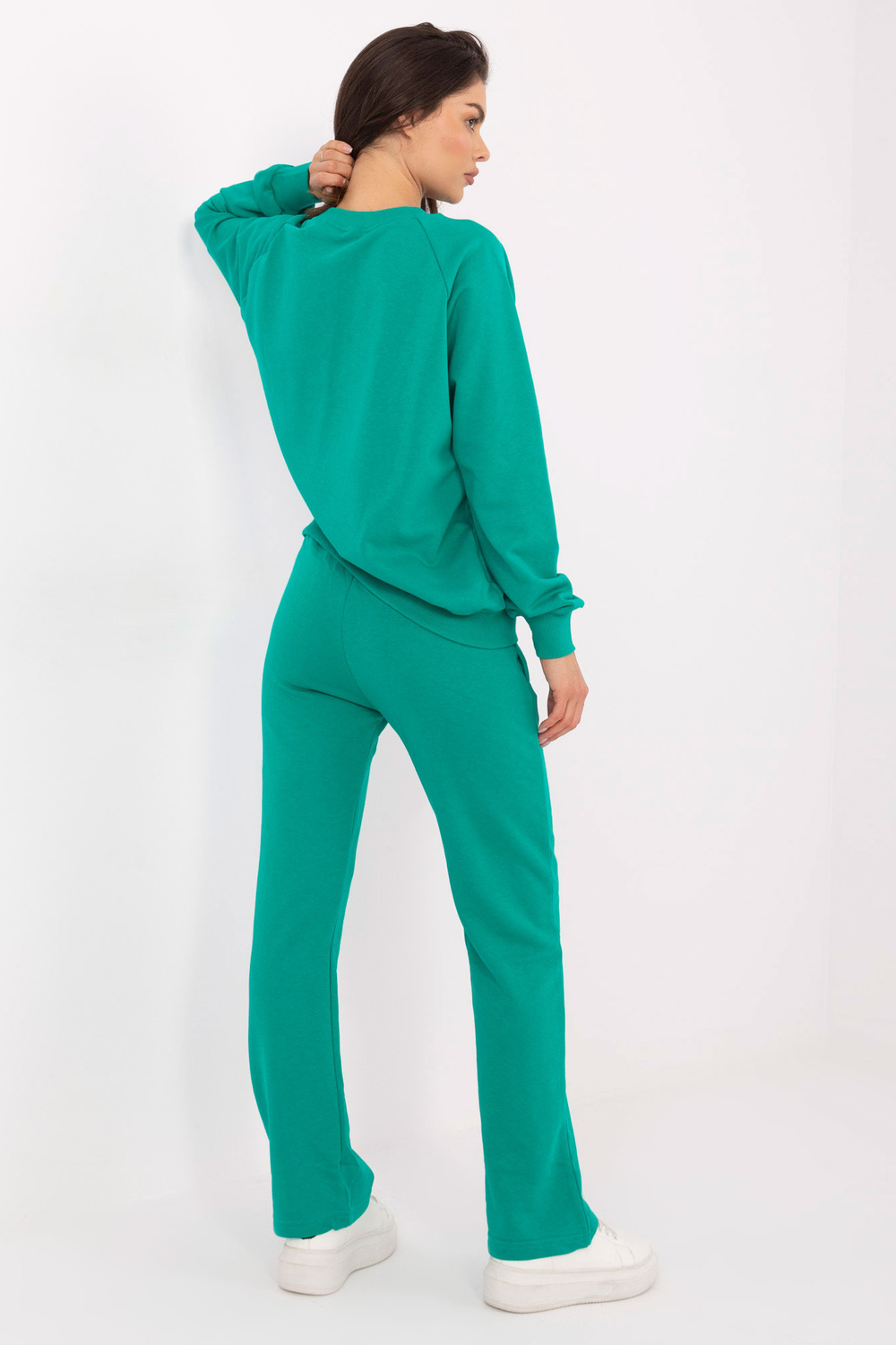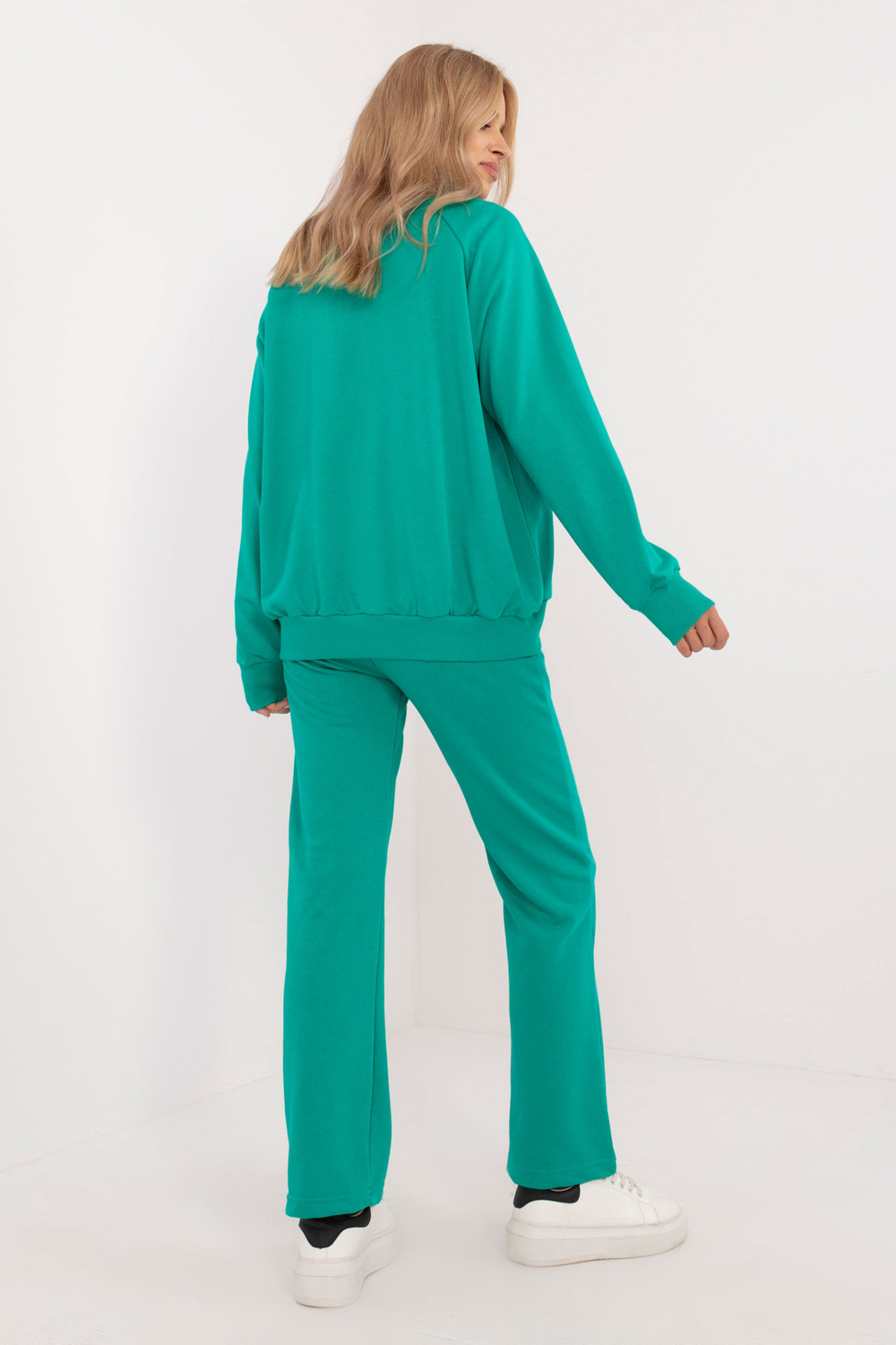 Komplekta izmēri vienā izmērā, mērot plakaniski: sporta krekla platums zem rokām - 68 cm, džempera garums - 67 cm, piedurknes garums - 64 cm, bikšu vidukļa platums - 33 cm, vidukļa augstums - 34 cm , bikšu garums - 105 cm.
