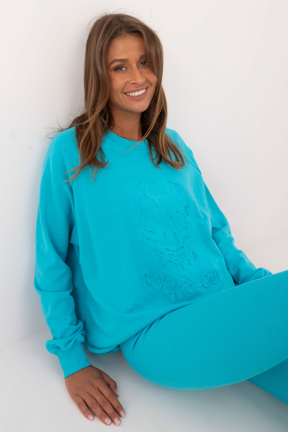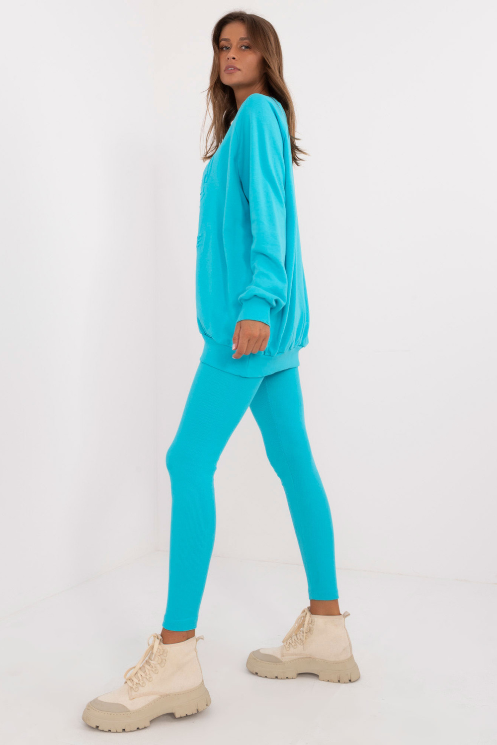 Komplekta izmēri vienā izmērā, mērot plakaniski: sporta krekla platums zem rokām - 70 cm, džempera garums - 74 cm, piedurknes garums - 64 cm, legingu platums jostasvietā - 30 cm, vidukļa augstums - 28 cm, legingu garums - 98 cm.