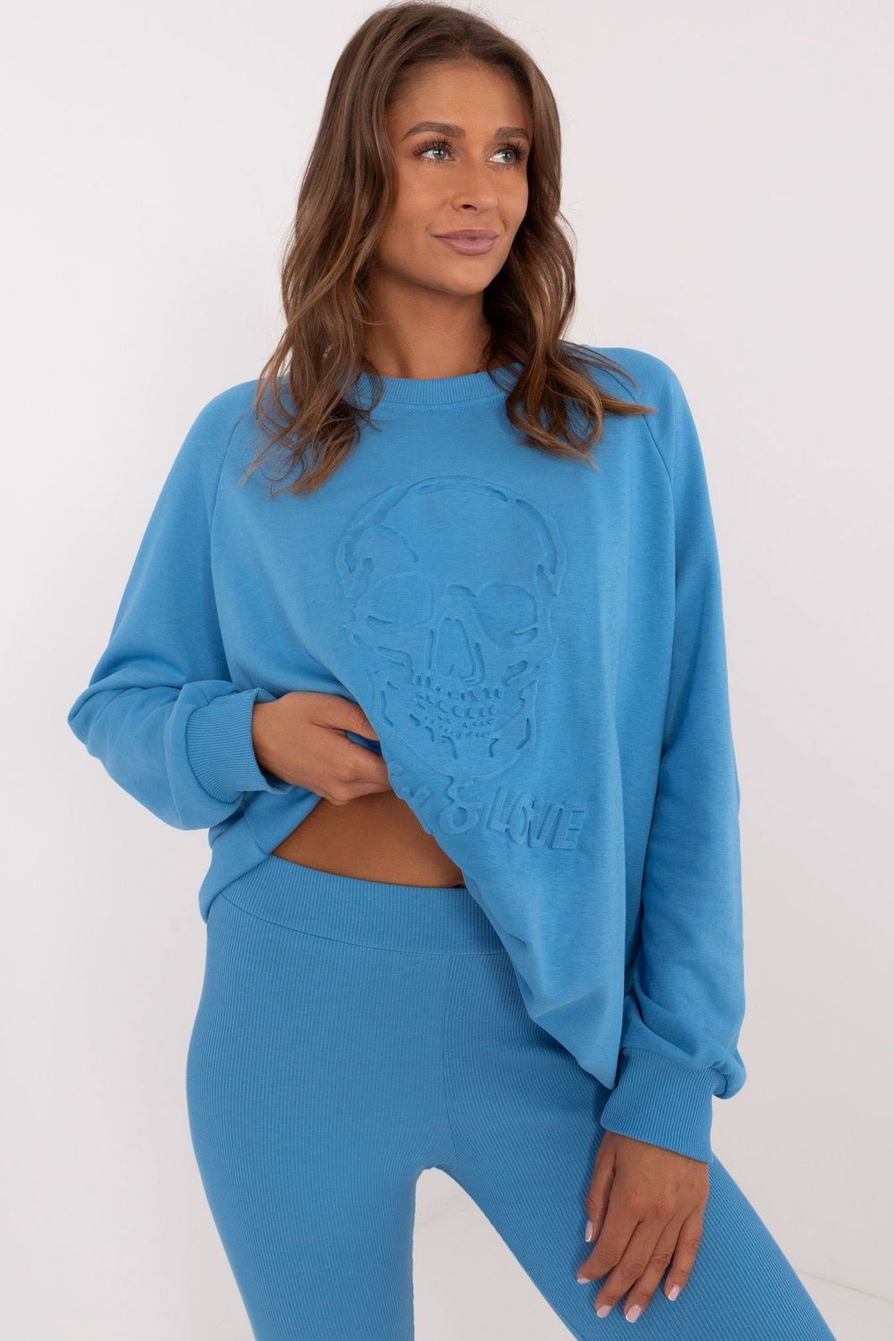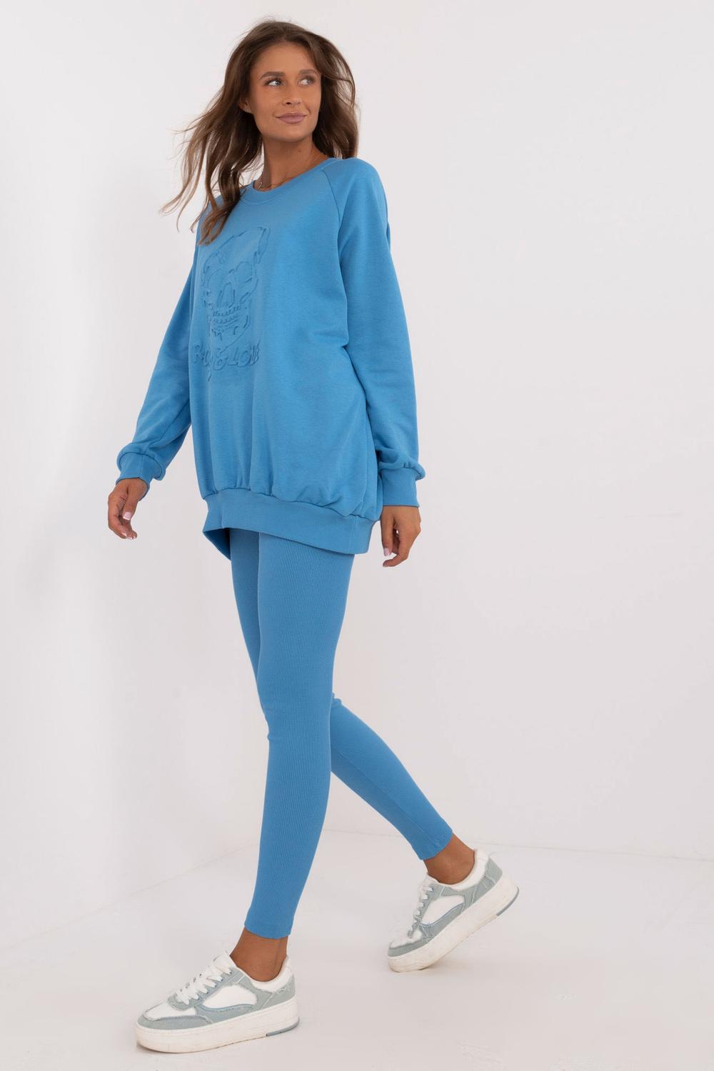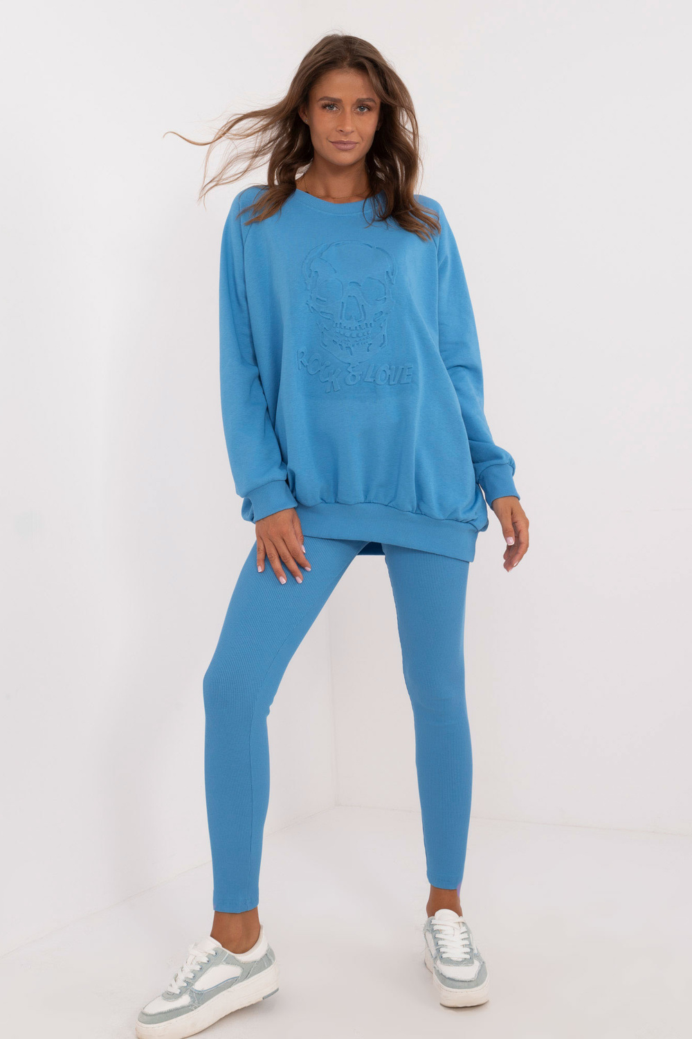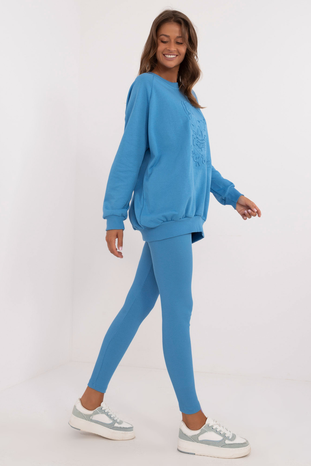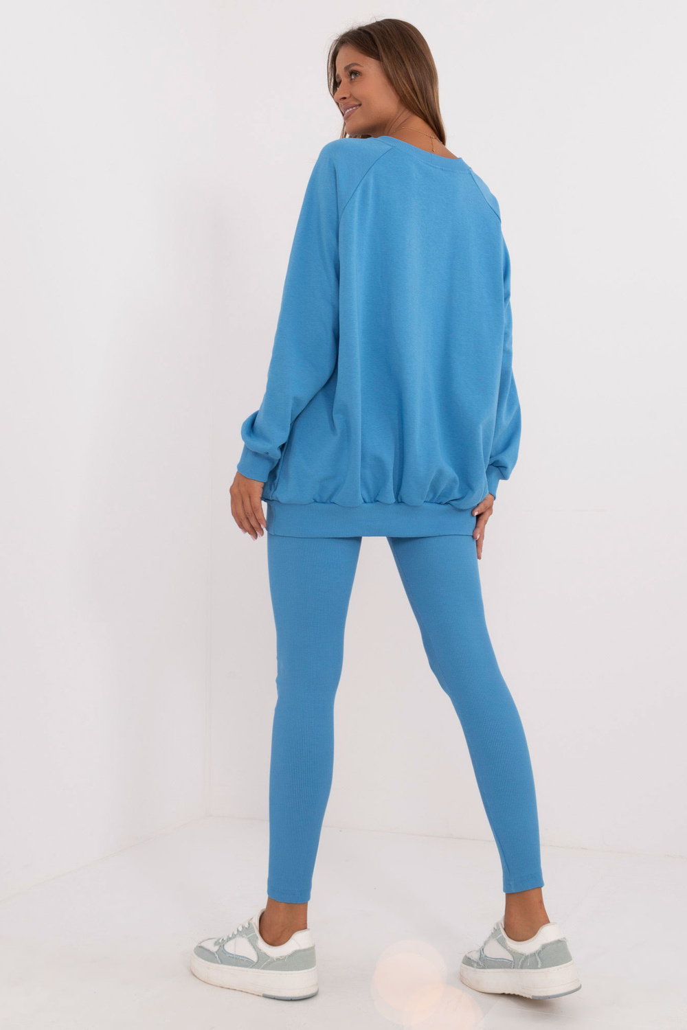 Komplekta izmēri vienā izmērā, mērot plakaniski: sporta krekla platums zem rokām - 70 cm, džempera garums - 74 cm, piedurknes garums - 64 cm, legingu platums jostasvietā - 30 cm, vidukļa augstums - 28 cm, legingu garums - 98 cm.