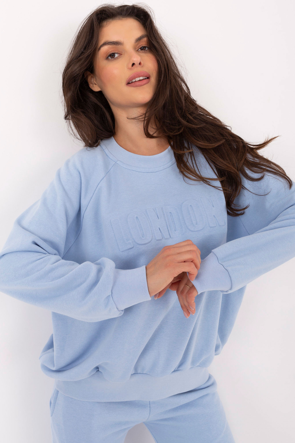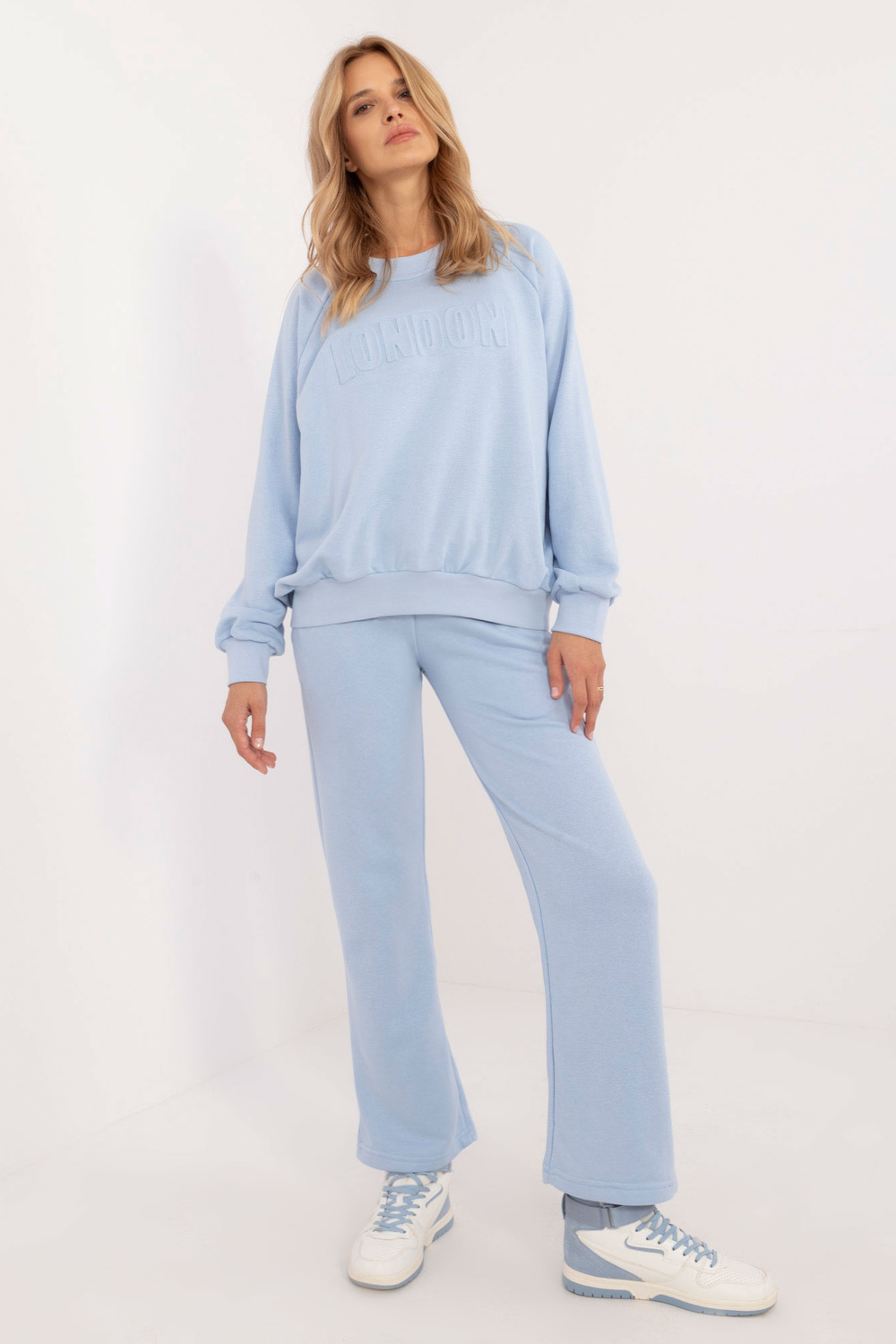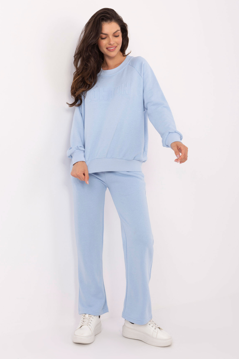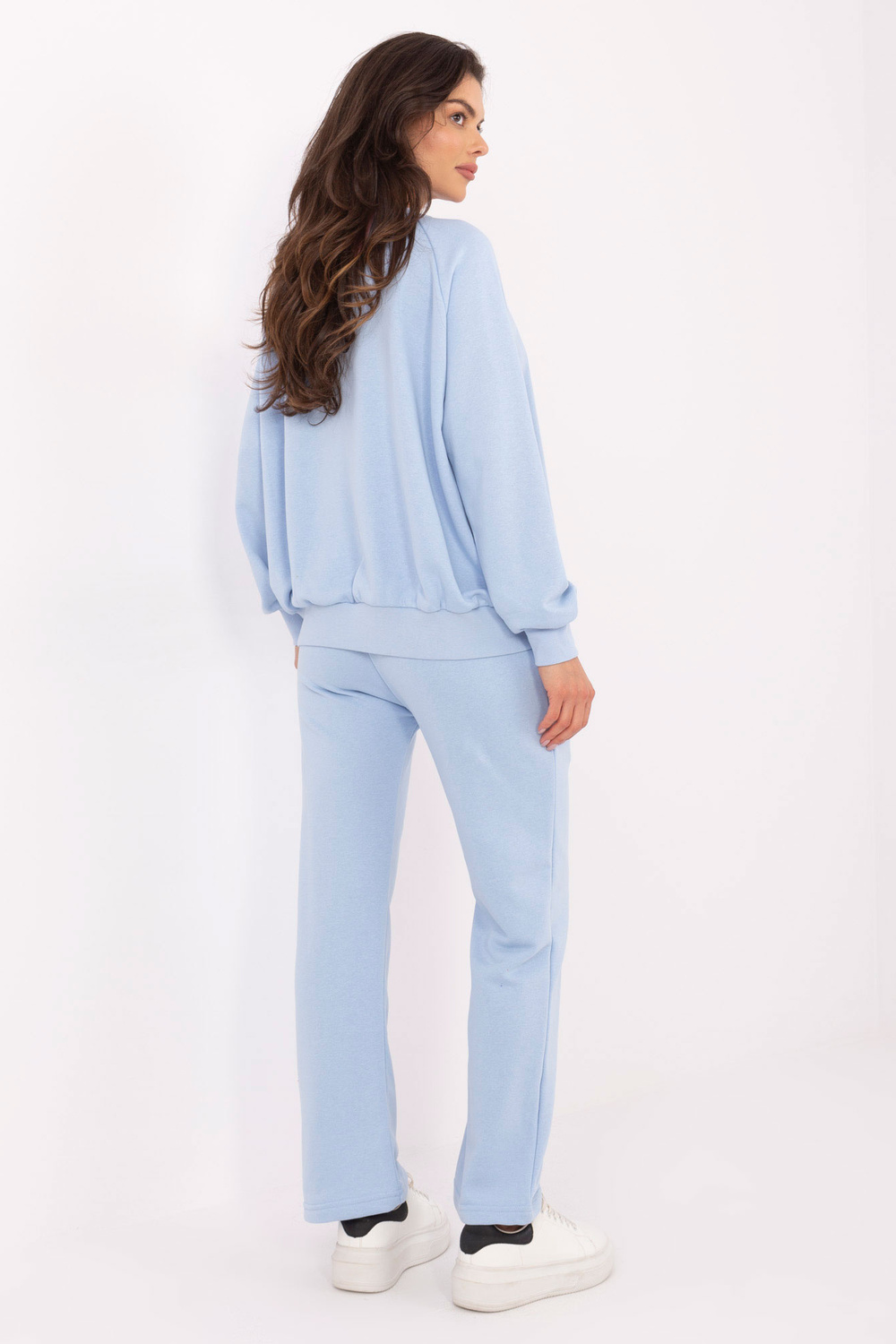 Komplekta izmēri vienā izmērā, mērot plakaniski: sporta krekla platums zem rokām - 68 cm, džempera garums - 67 cm, piedurknes garums - 64 cm, bikšu vidukļa platums - 33 cm, vidukļa augstums - 34 cm , bikšu garums - 105 cm.
