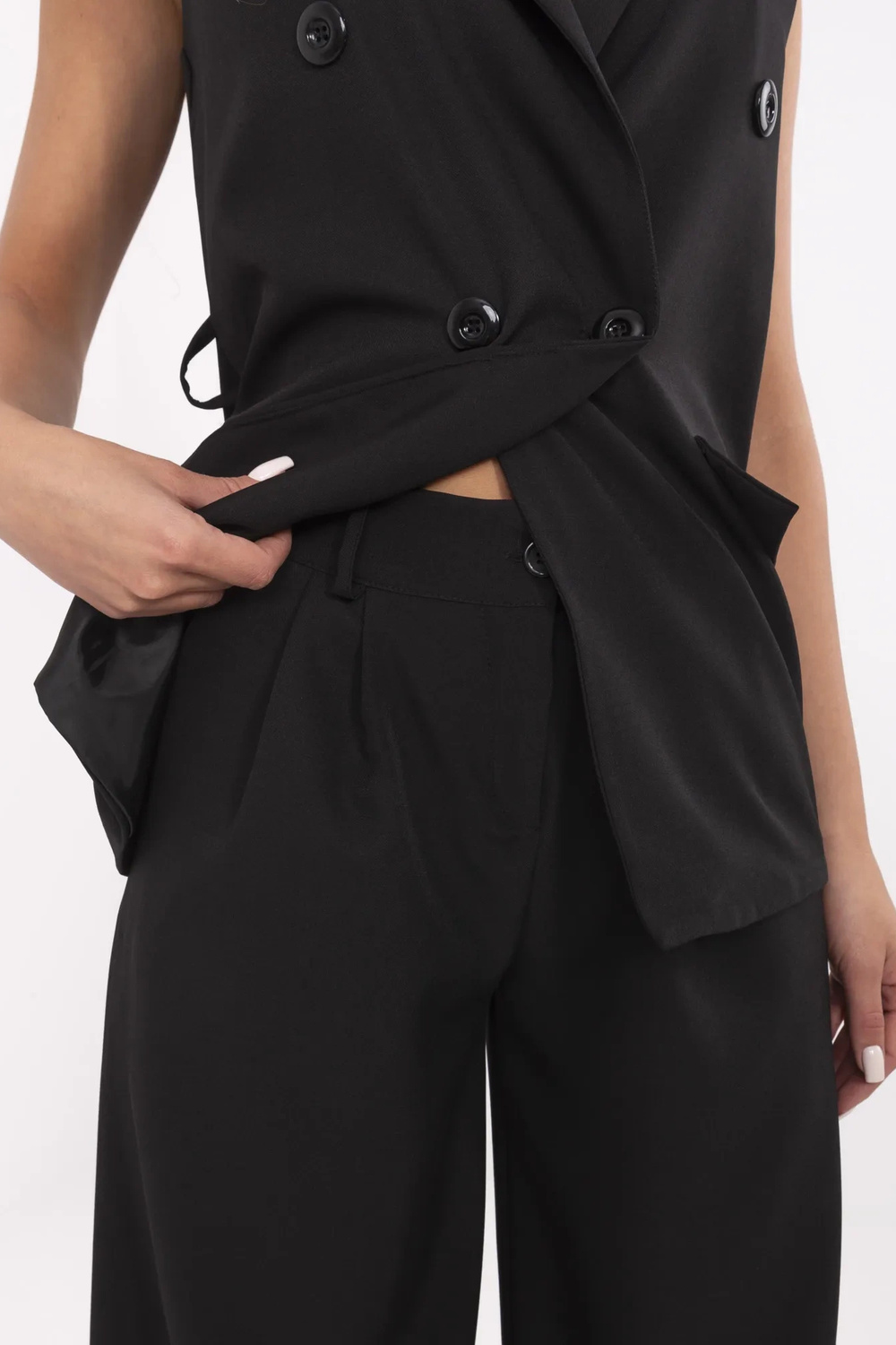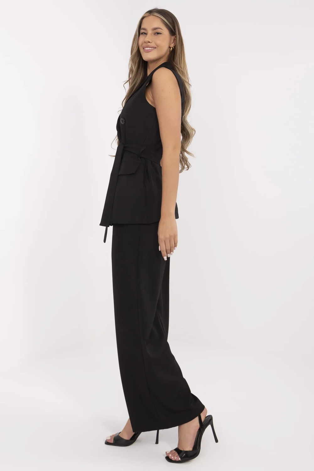Vestes izmēri S izmērā, mērot plakanā stāvoklī: platums padusēm - 47 cm, gurnu platums - 51 cm, kopējais izmērs