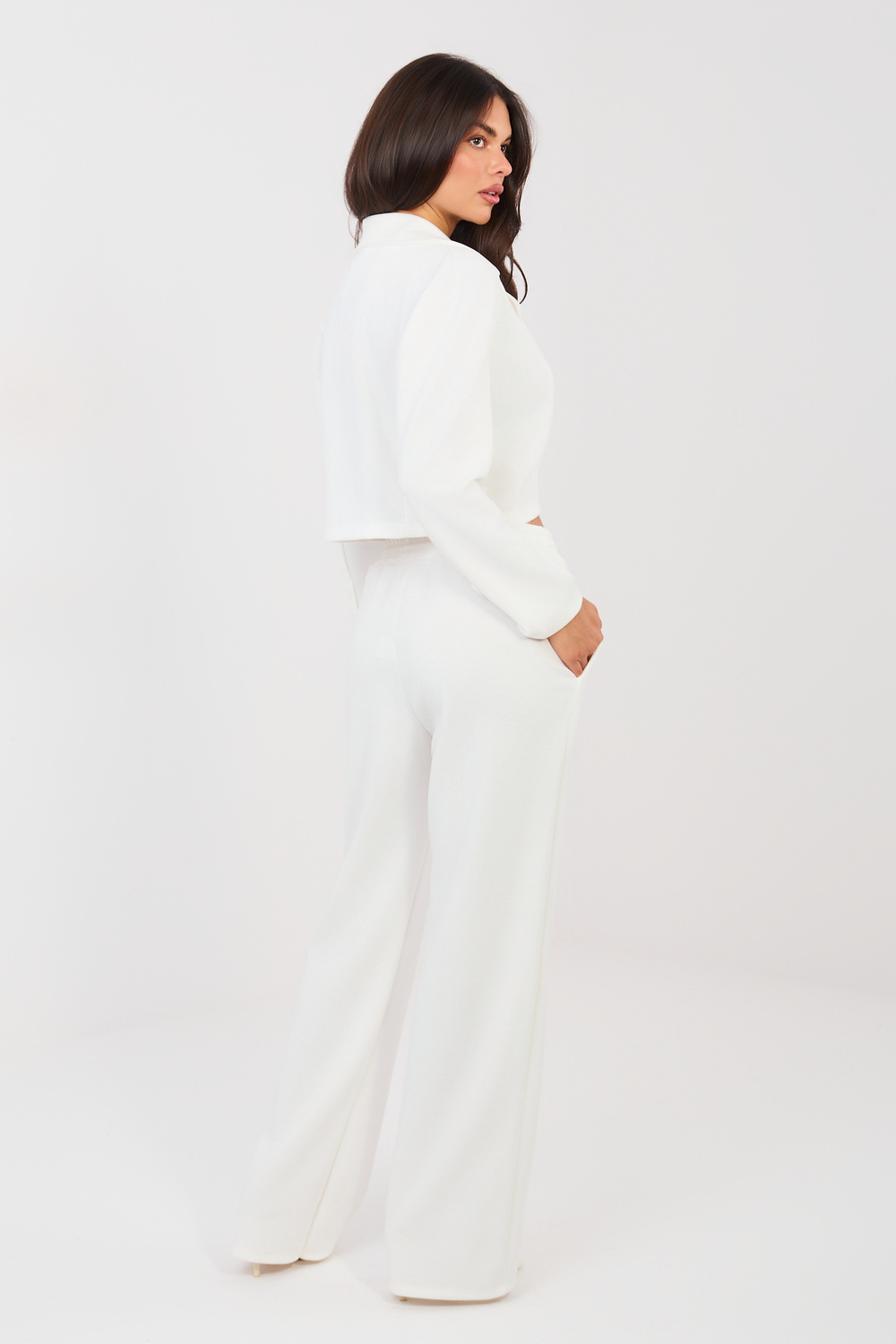 Modelis valkā viena izmēra apģērbu. Modeļa izmēri: augums 173 cm, krūtis 85 cm, viduklis 62 cm, gurni 95 cm.
