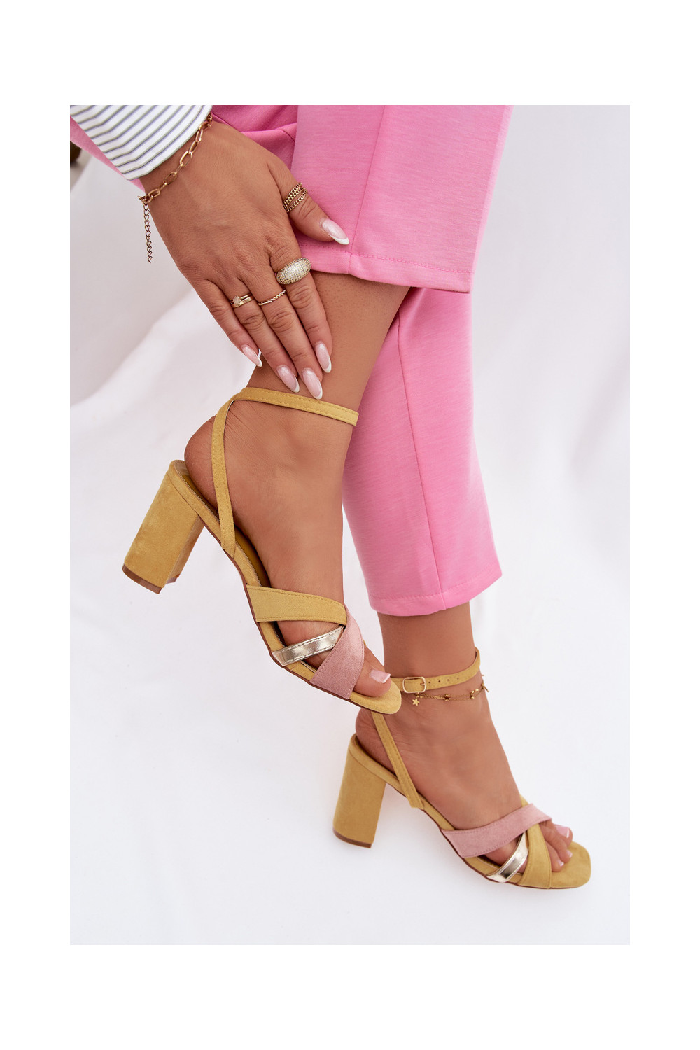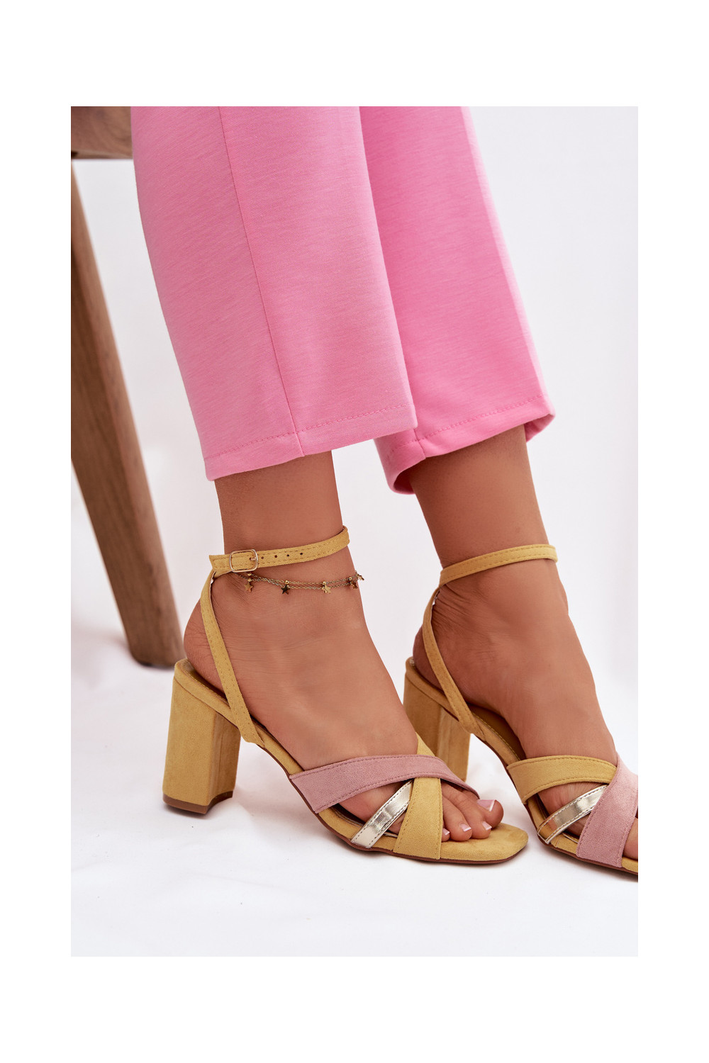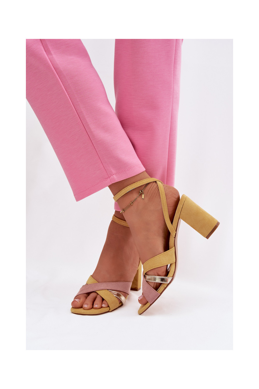Sieviešu augstpapēžu sandaļi ar lentītēm no mākslīgā zamša, dzeltenas krāsas Karilora