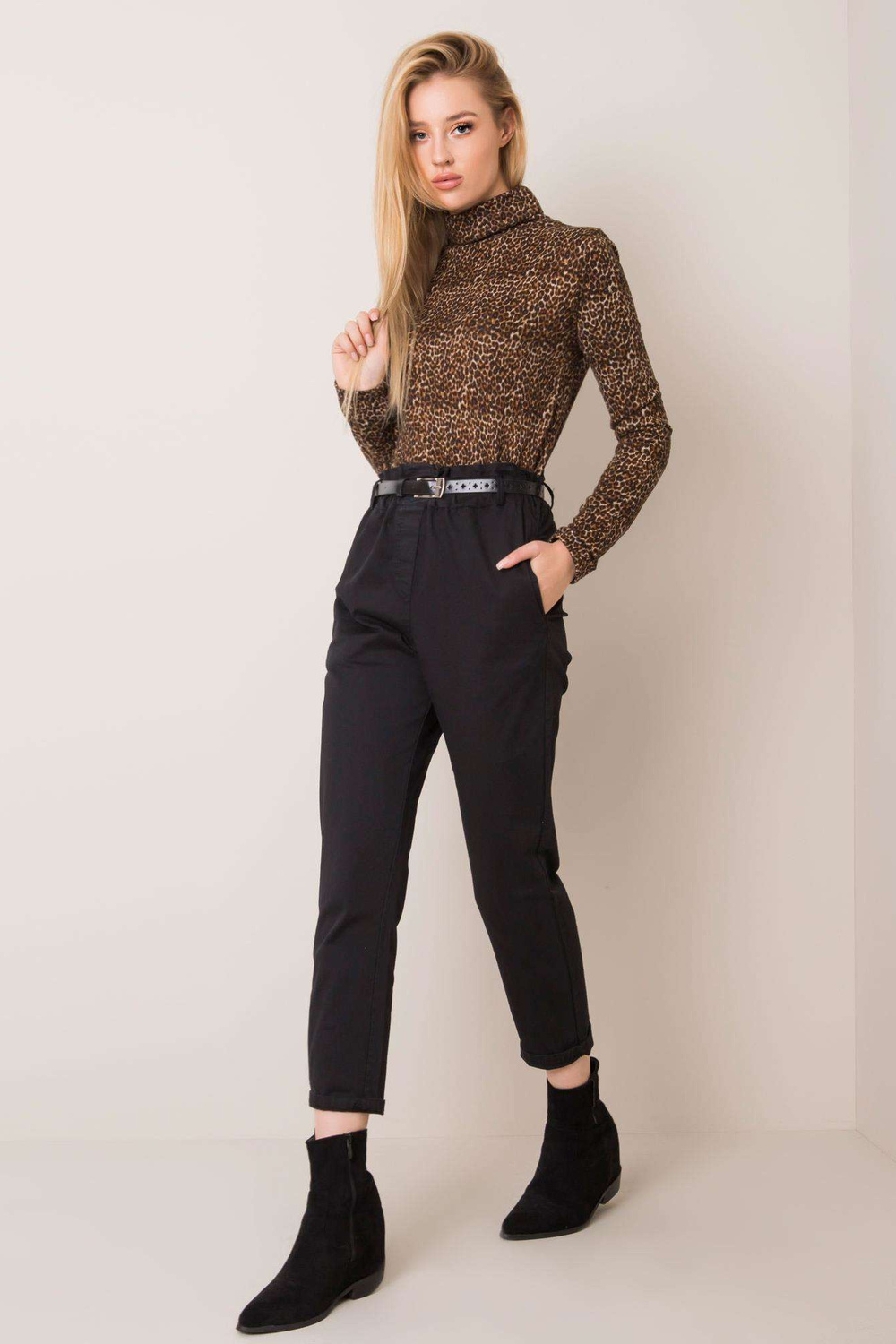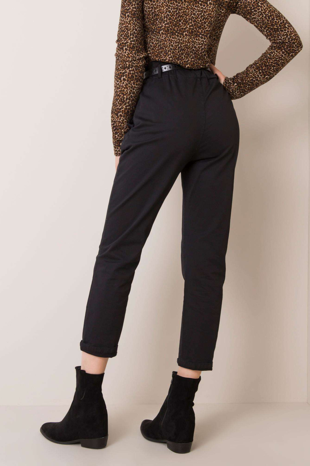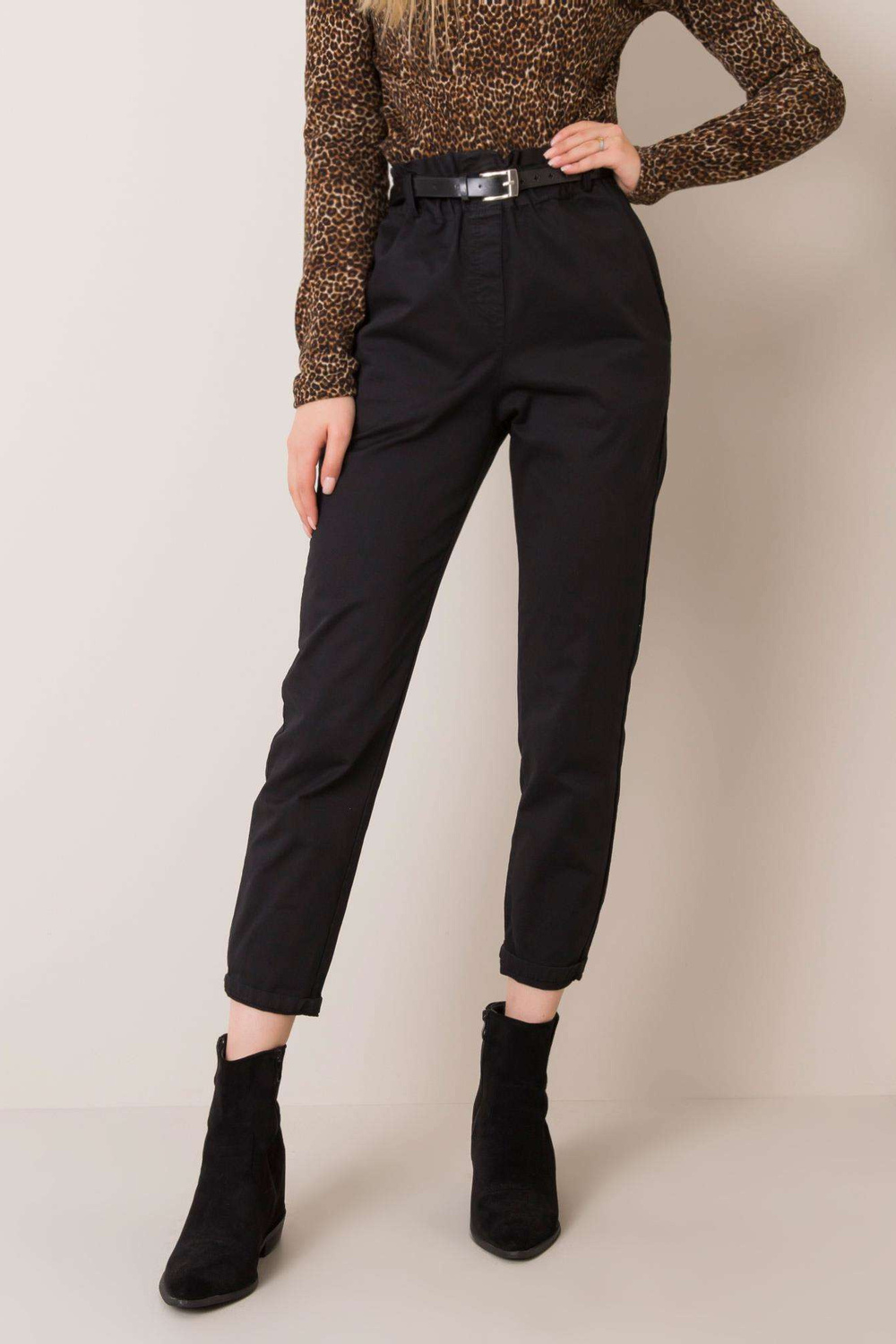 Kasijas melnās bikses. piederumi: josta, elastīga josla jostasvietā materiālssastāvs: 95% kokvilna, 5% elastāns mazgāšanas metode: veļas mašīna 30°C Modelis valkā S izmēru. Izmēri modeļa: augums 175 cm, krūtis 84 cm, viduklis 60 cm, gurni 90 cm.