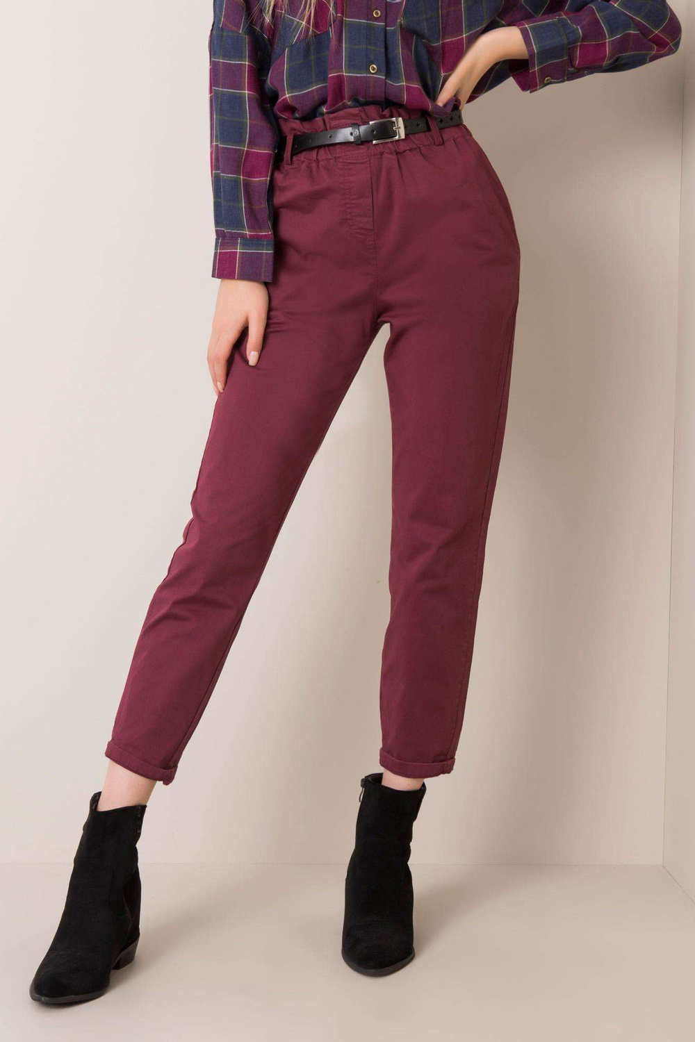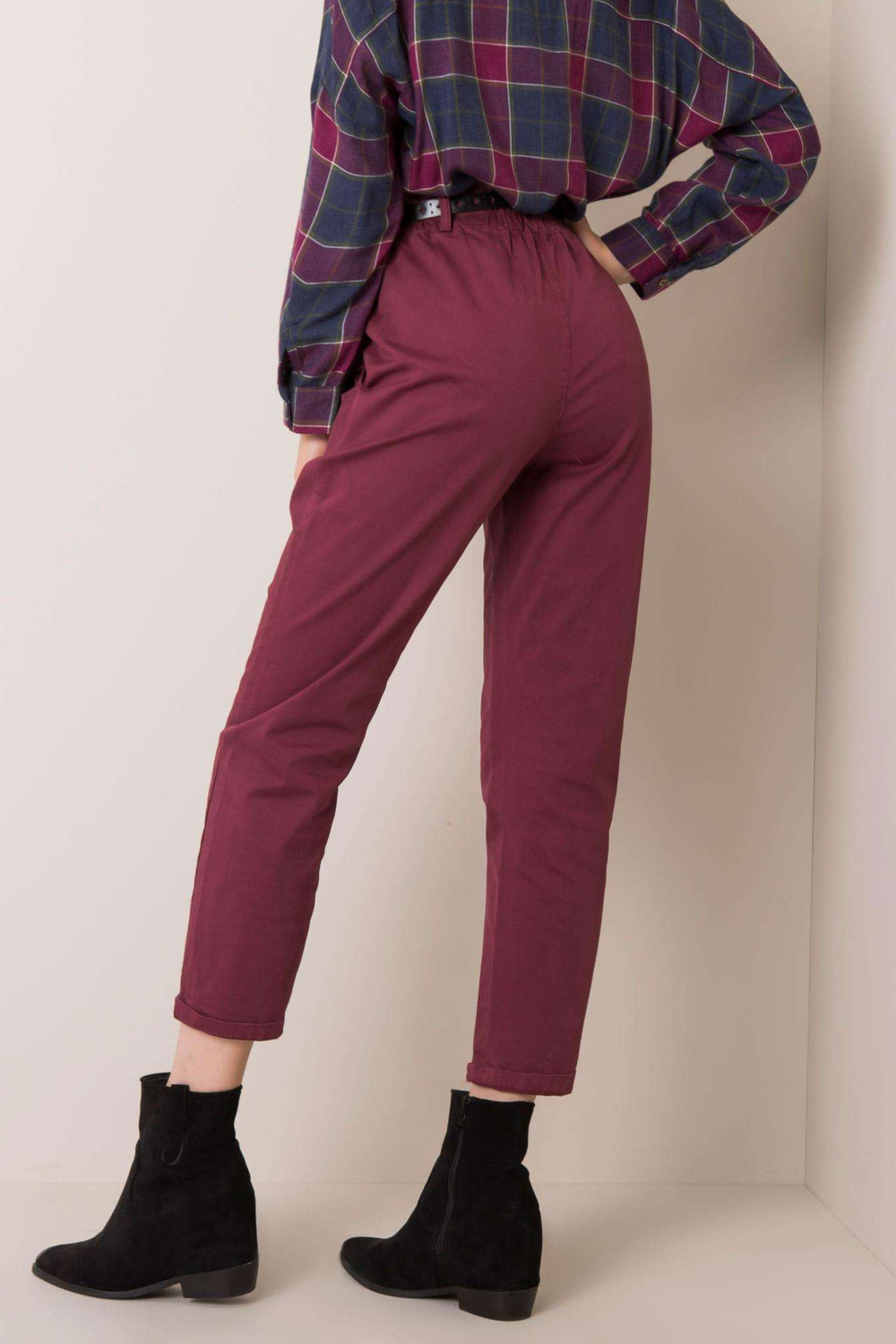 Kasijas sarkanbrūnās bikses. piederumi: josta, elastīga josla jostasvietā materiālssastāvs: 95% kokvilna, 5% elastāns mazgāšanas metode: veļas mašīna 30°C Modelis valkā S izmēru. Izmēri modeļa: augums 175 cm, krūtis 84 cm, viduklis 60 cm, gurni 90 cm.