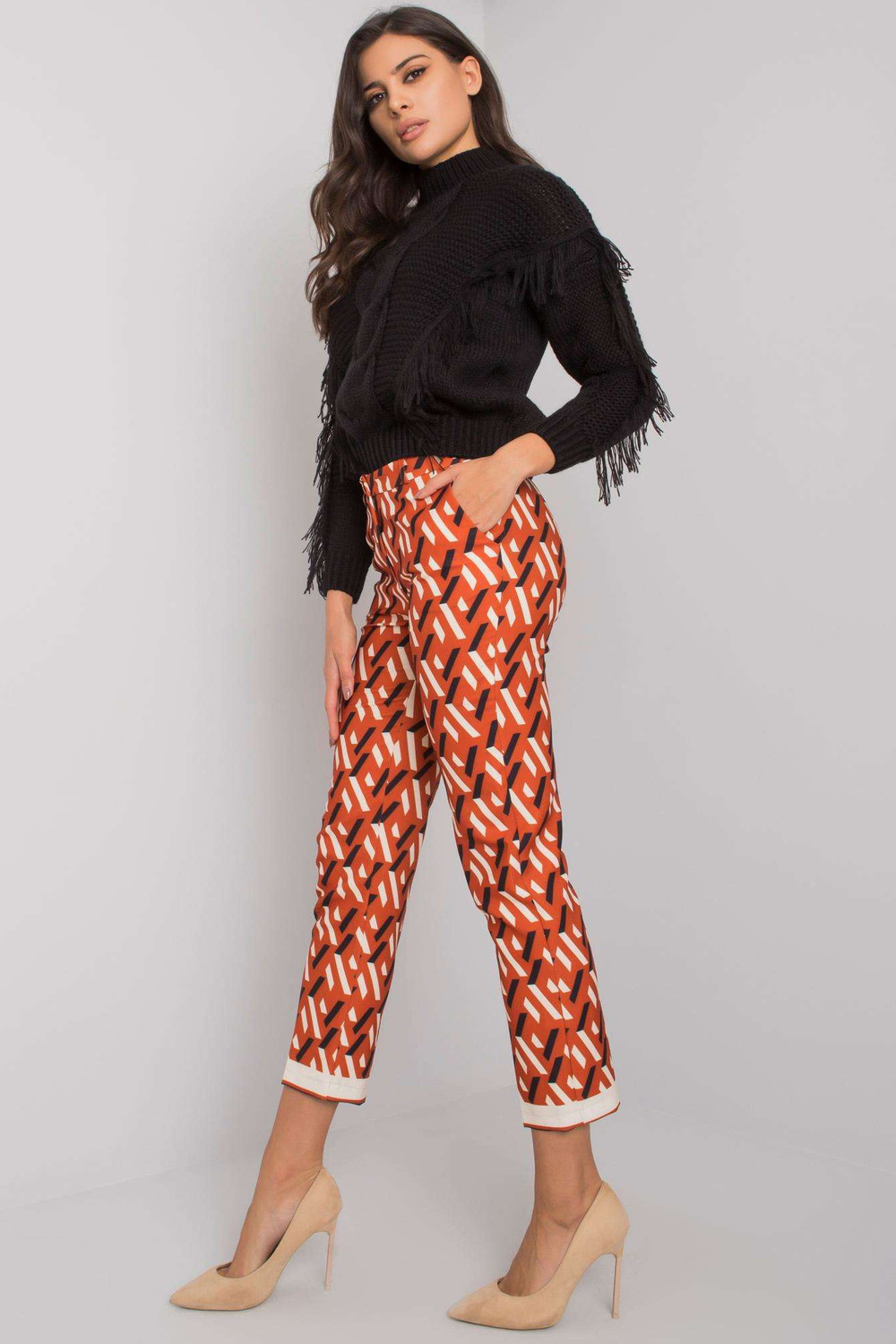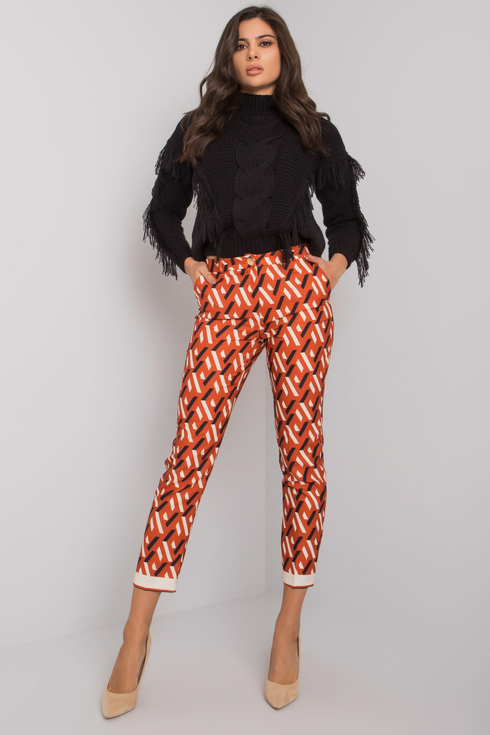 DarkOrange Dorchester rakstainas bikses . Materiālssastāvs: poliestera mazgāšanas metode: veļas mašīna 30°C Modelis valkā 36.izmēru. Modeļa izmēri: augums 176 cm, krūtis 86 cm, viduklis 60 cm, gurni 88 cm. Bikšu izmēri 36 izmēram mea