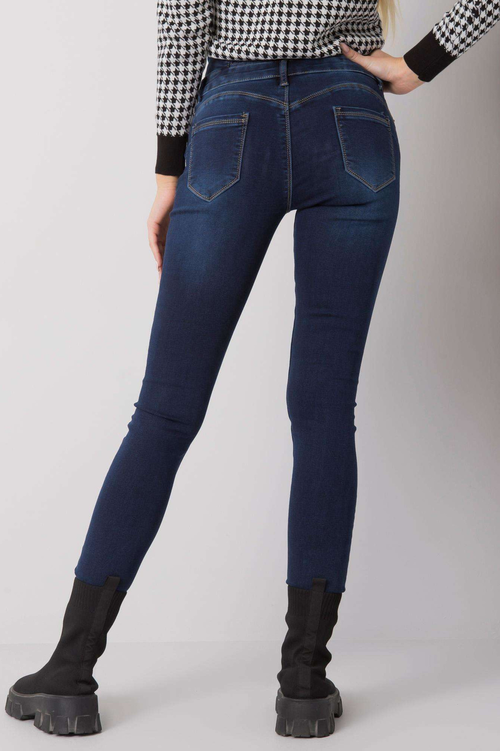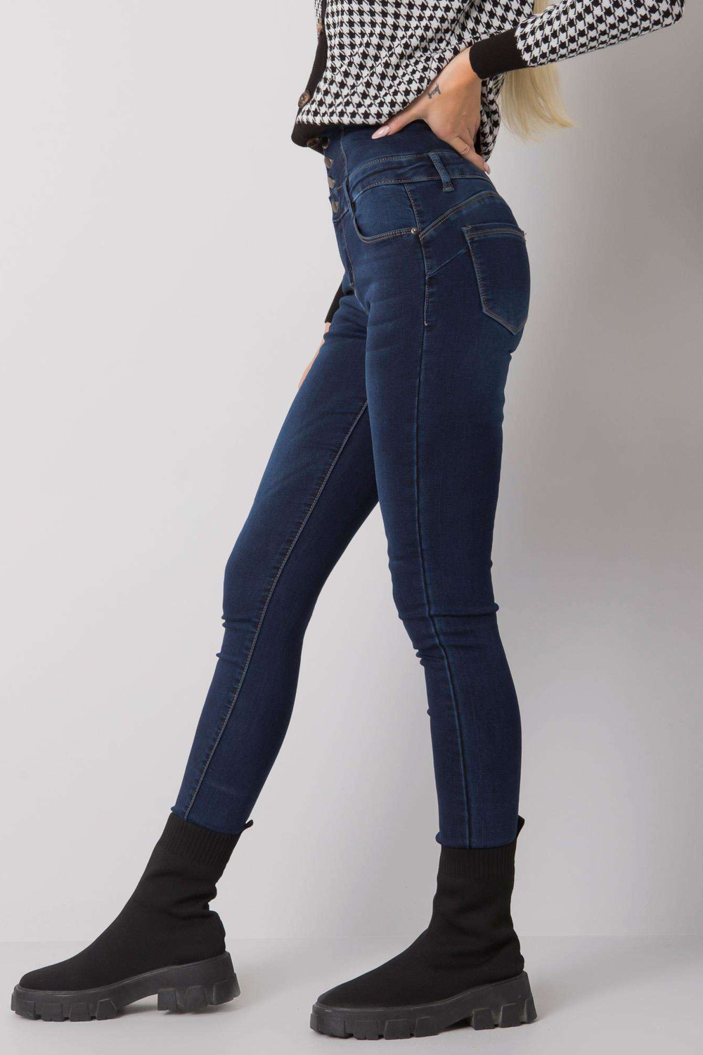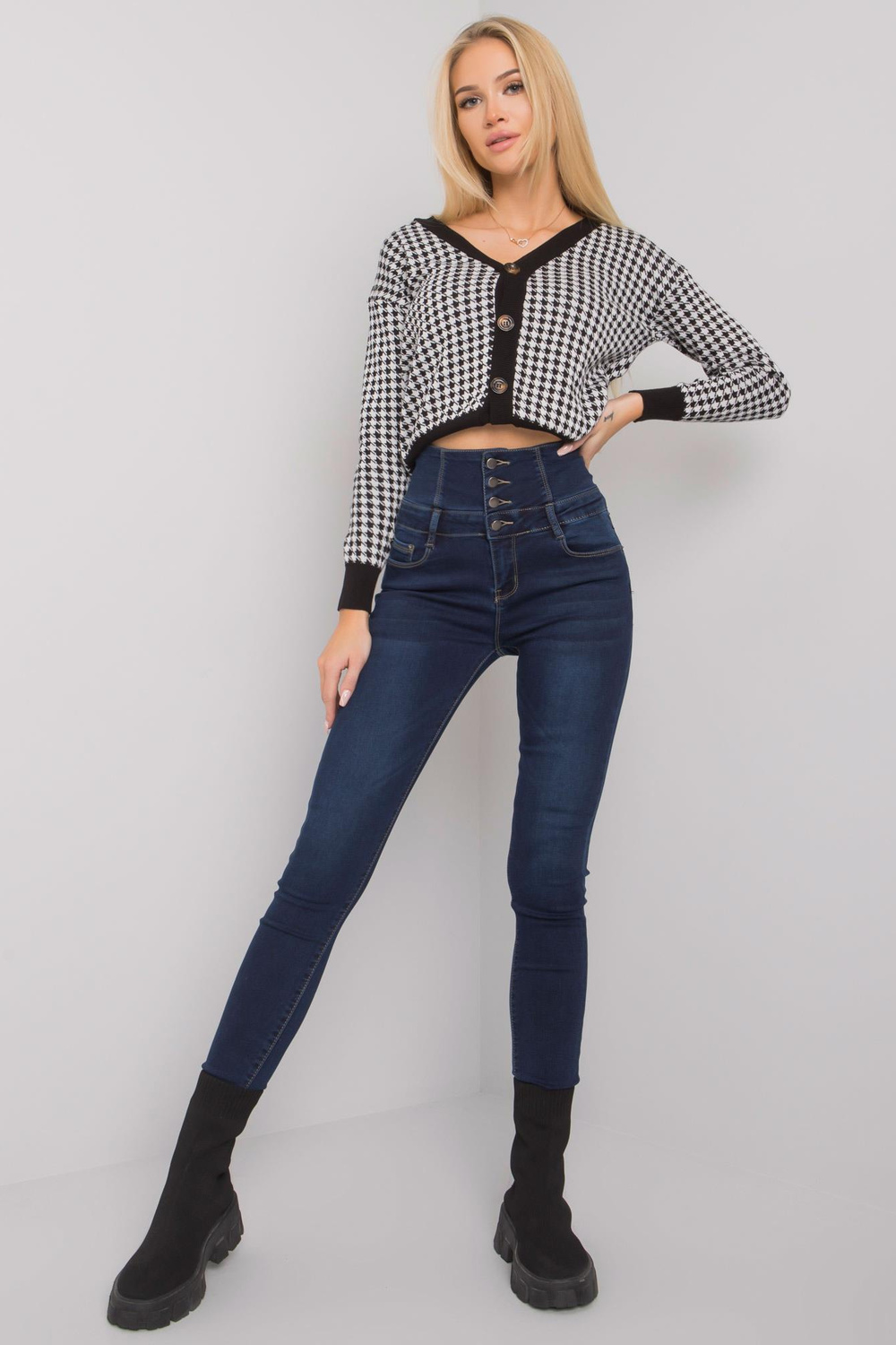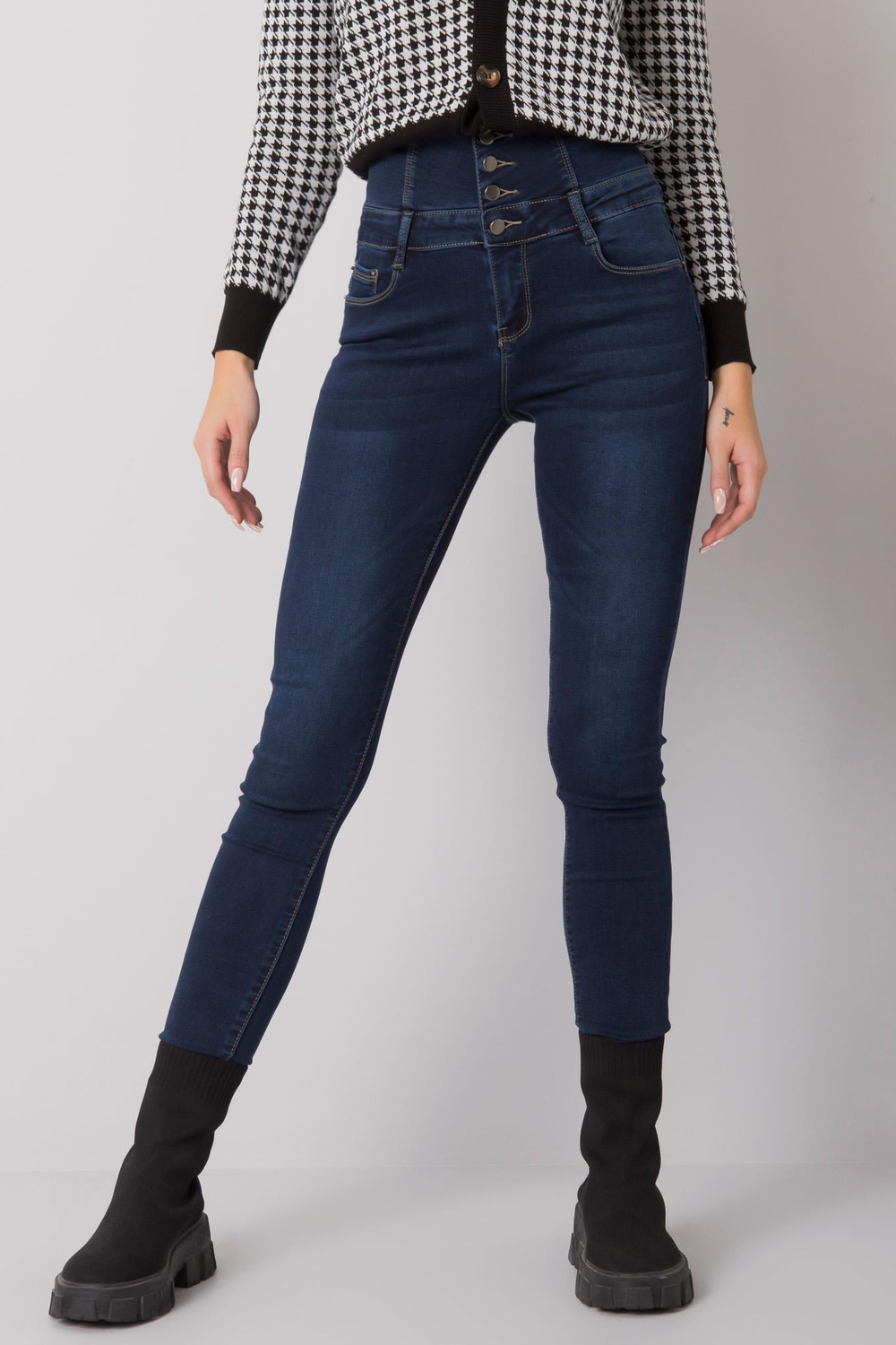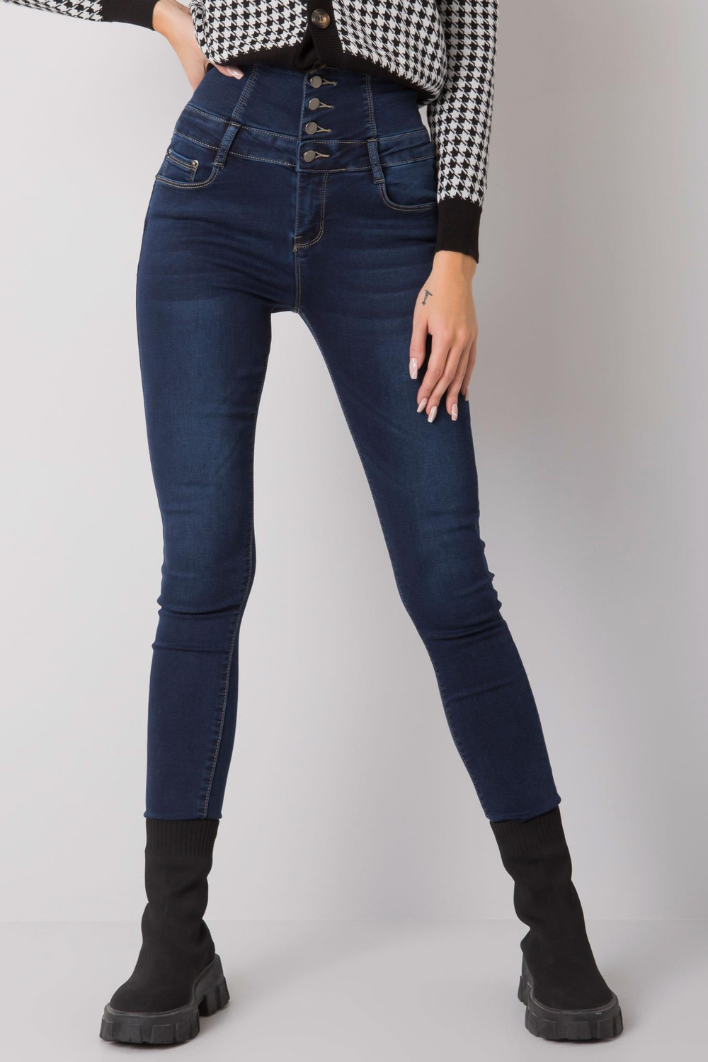 Tumši zili džinsi ar caurulīti ar augstu jostasvietu.