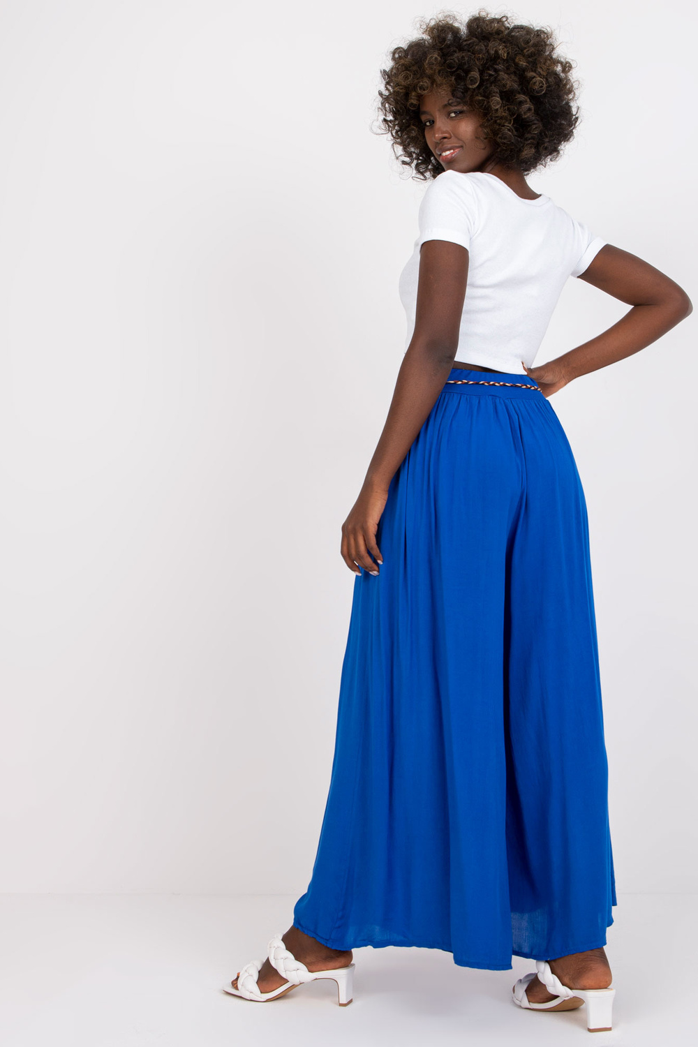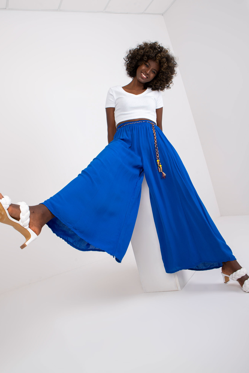 Tumši zilas platas bikses no auduma ar augstu jostasvietu Surie OCH BELLA. aksesuāri: josta, elastīga josla vidukļa daļā materiālssastāvs: 100% viskoze mazgāšanas metode: veļas mašīna 30°C Produkta kods: TW-SP-BI-81733.14 dominējošais raksts: bez raksta Stils: ikdienišķs, boho