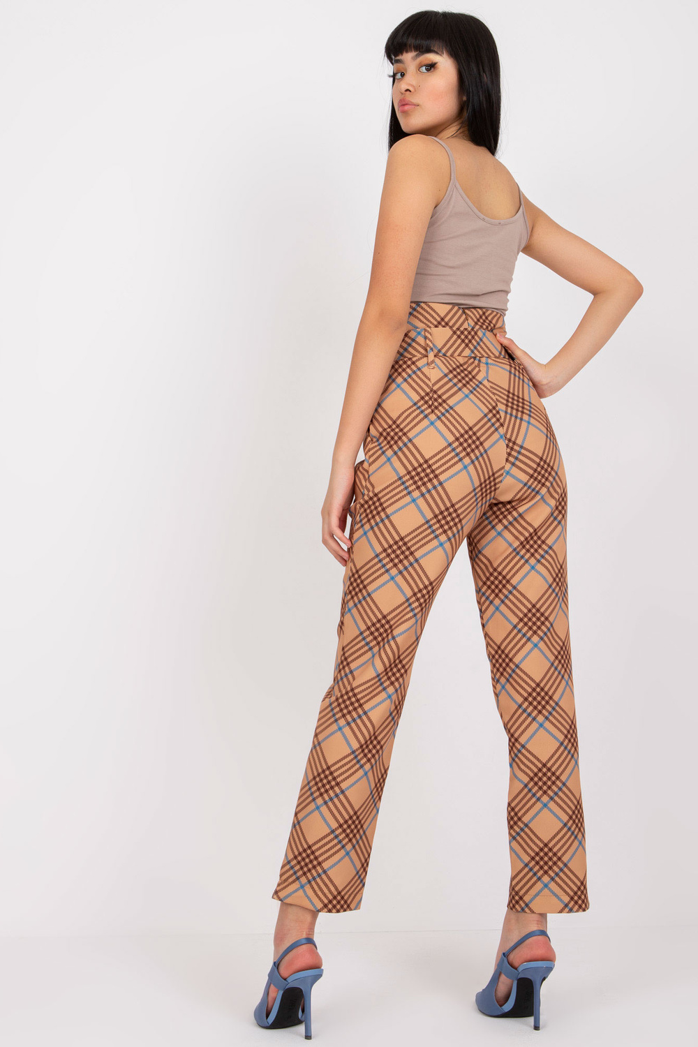 Bēša un zila rūtainu auduma bikses ar jostu.