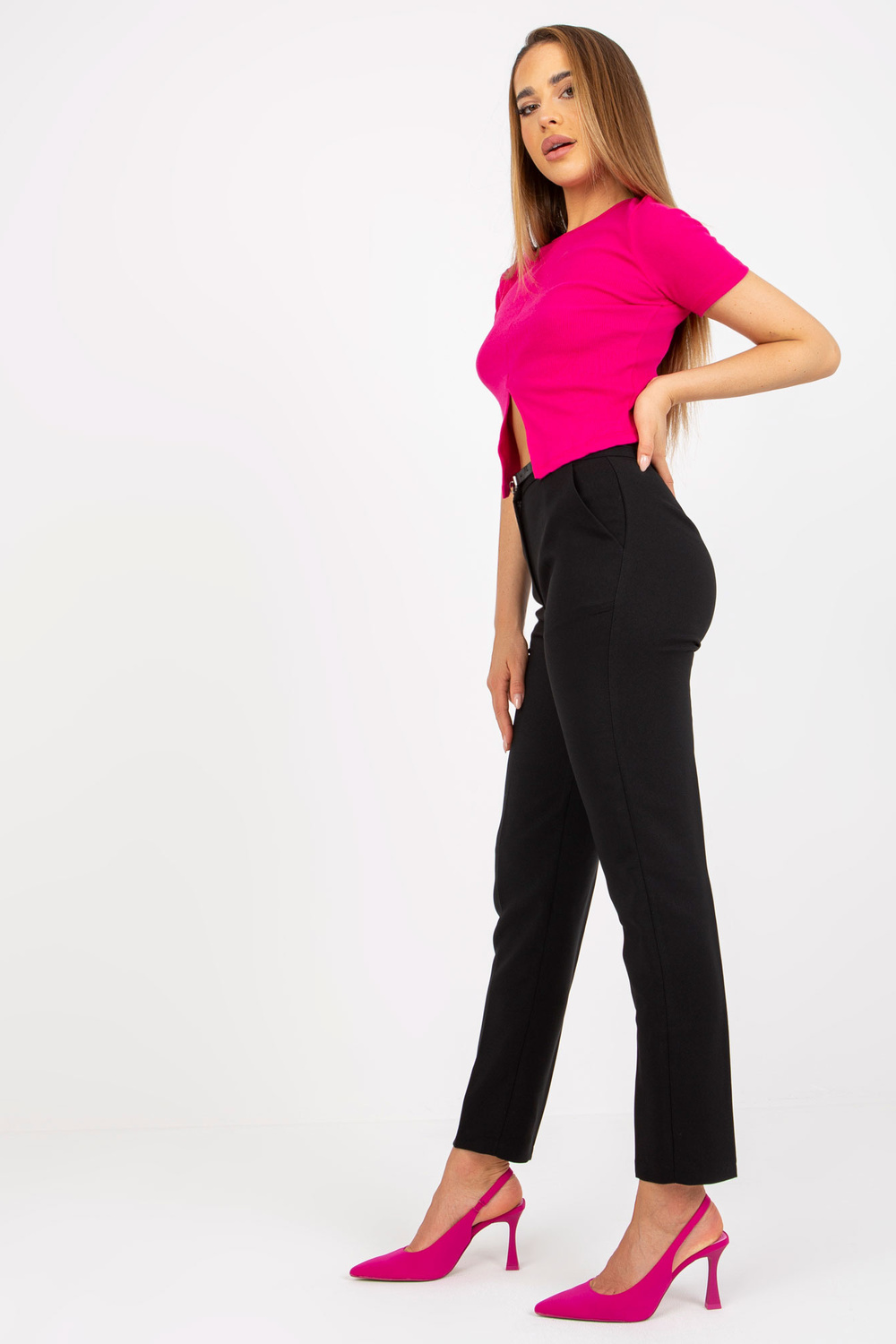 Melnas, pieguļošas auduma bikses ar kabatām.