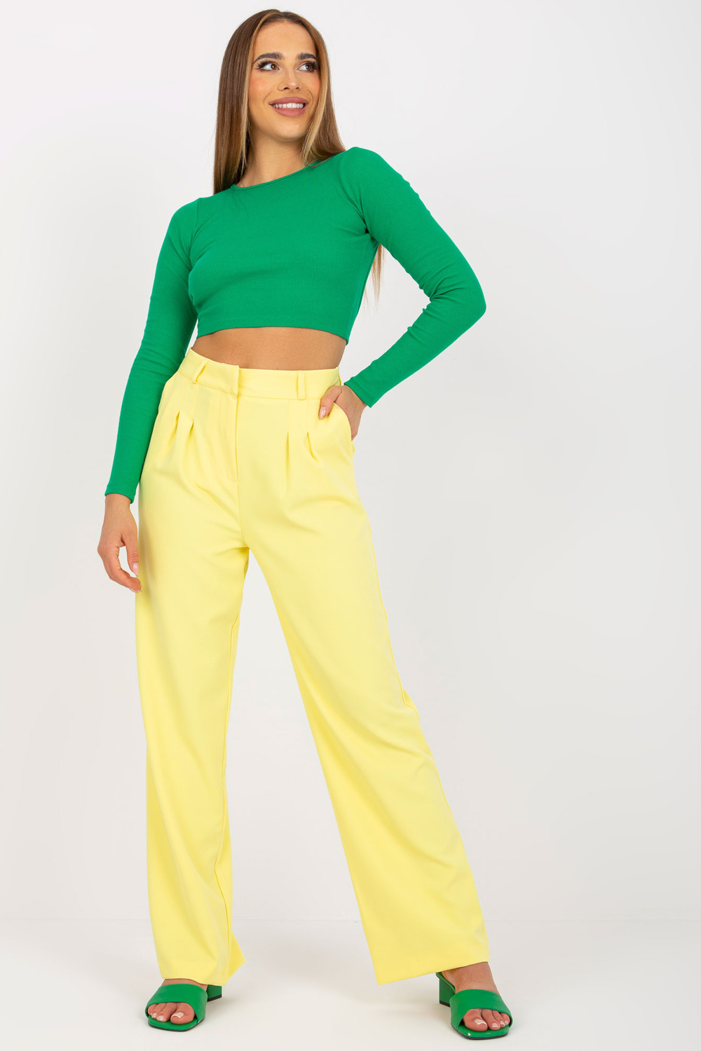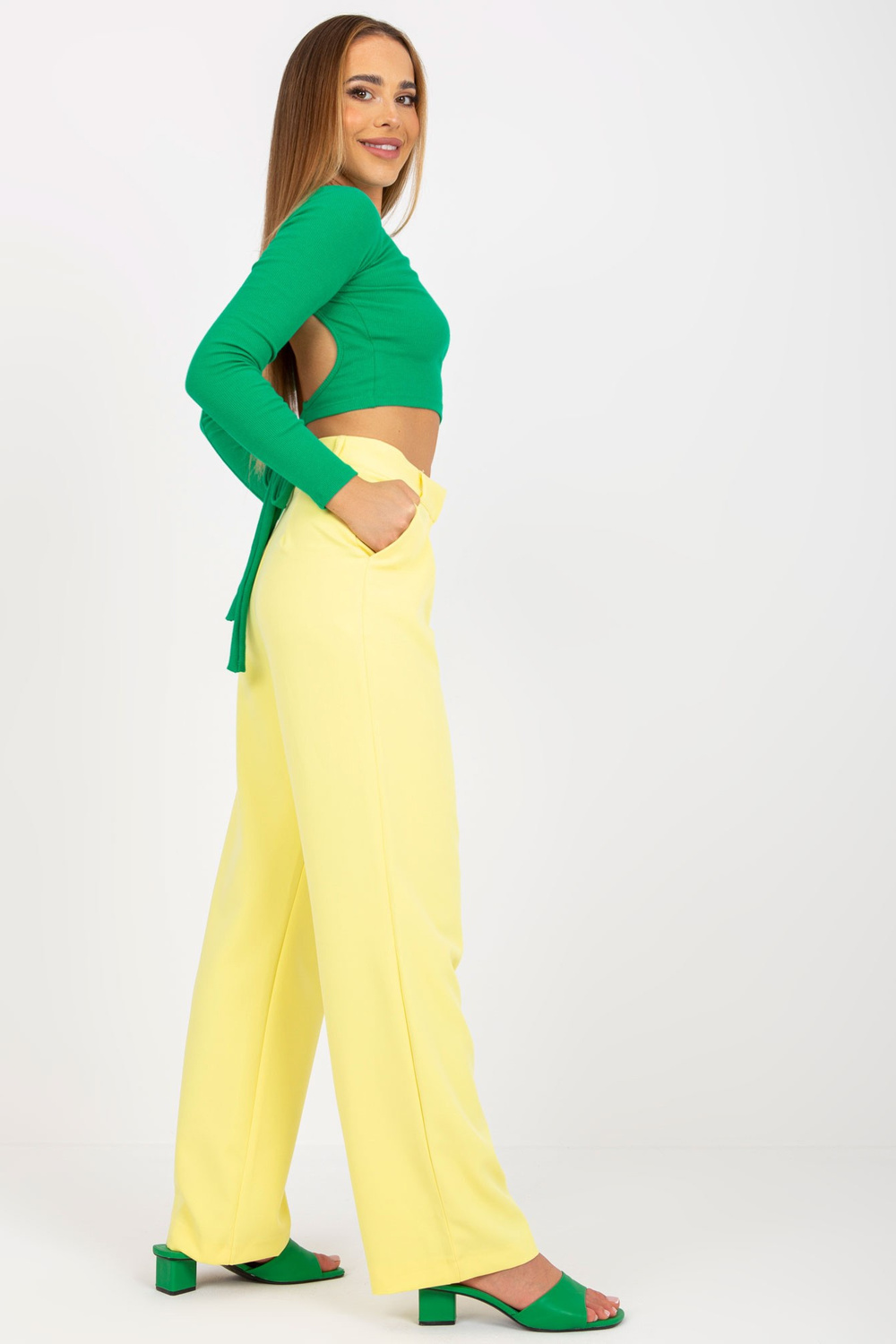 Gaiši dzeltenas bikses no auduma ar kabatām RUE PARIS . materiāla sastāvs: 88% poliesters, 12% elastāns mazgāšanas metode: mazgāšana veļasmašīnā 30°C Produkta kods: TO-SP-18155.21P dominējošais raksts: gluds Stils: gadījuma iespēja: strādāt ikdienā, priekš