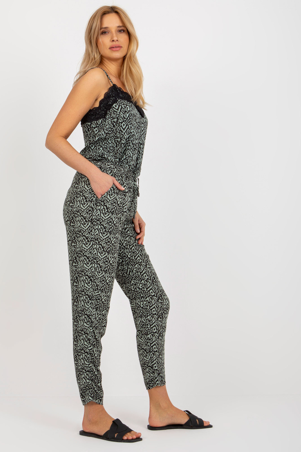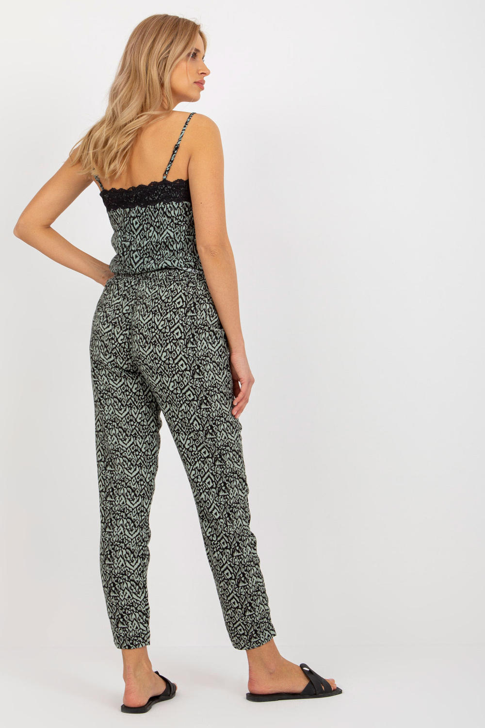 Haki krāsas viskozes bikses no apakšlīmeņa apdrukāta auduma