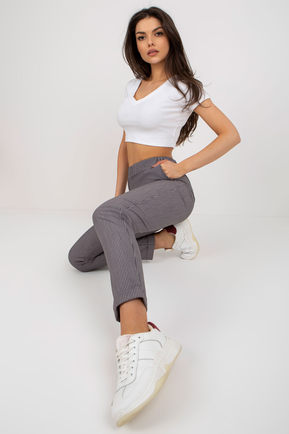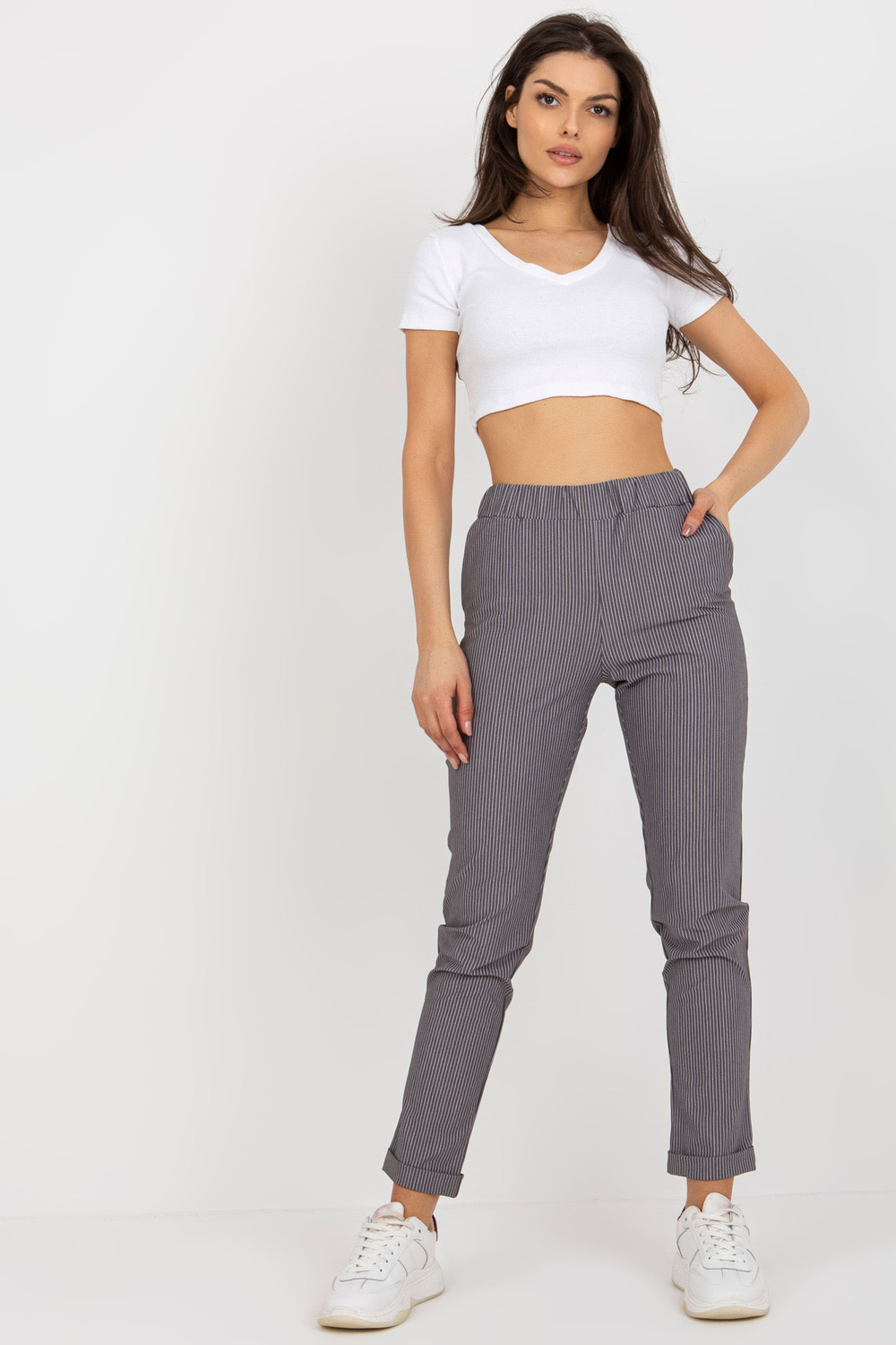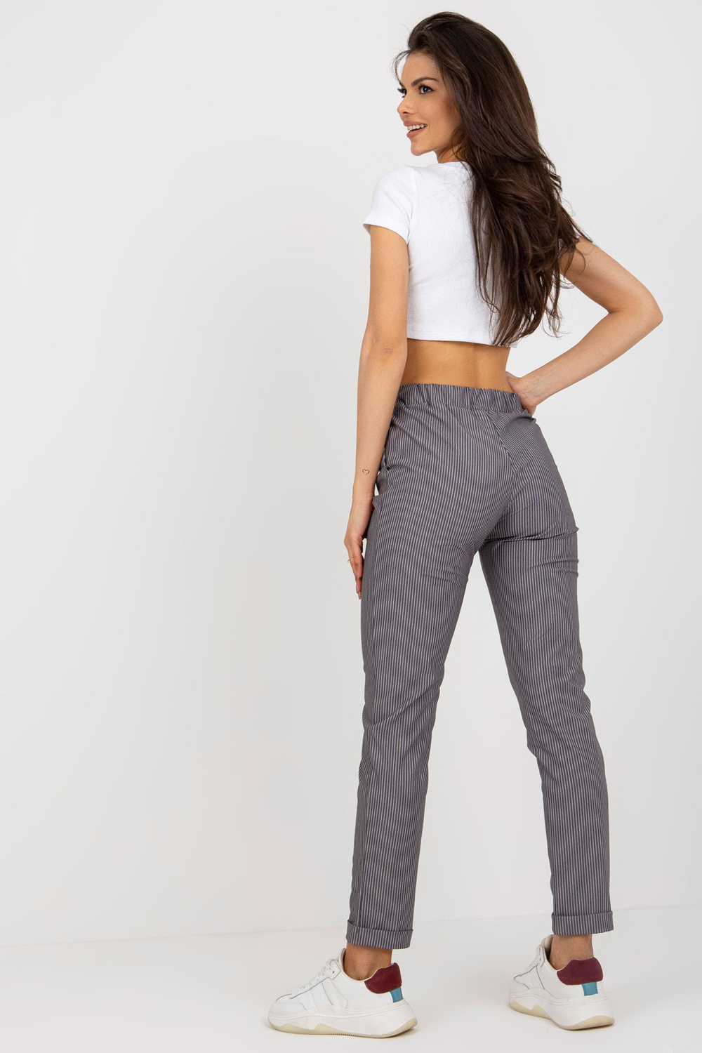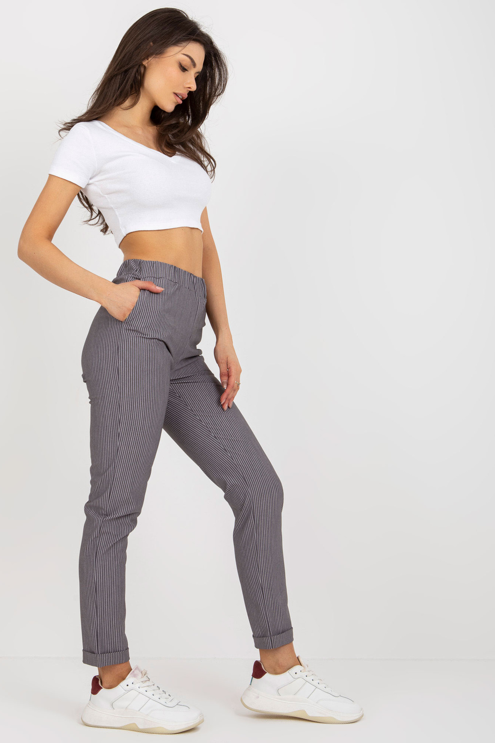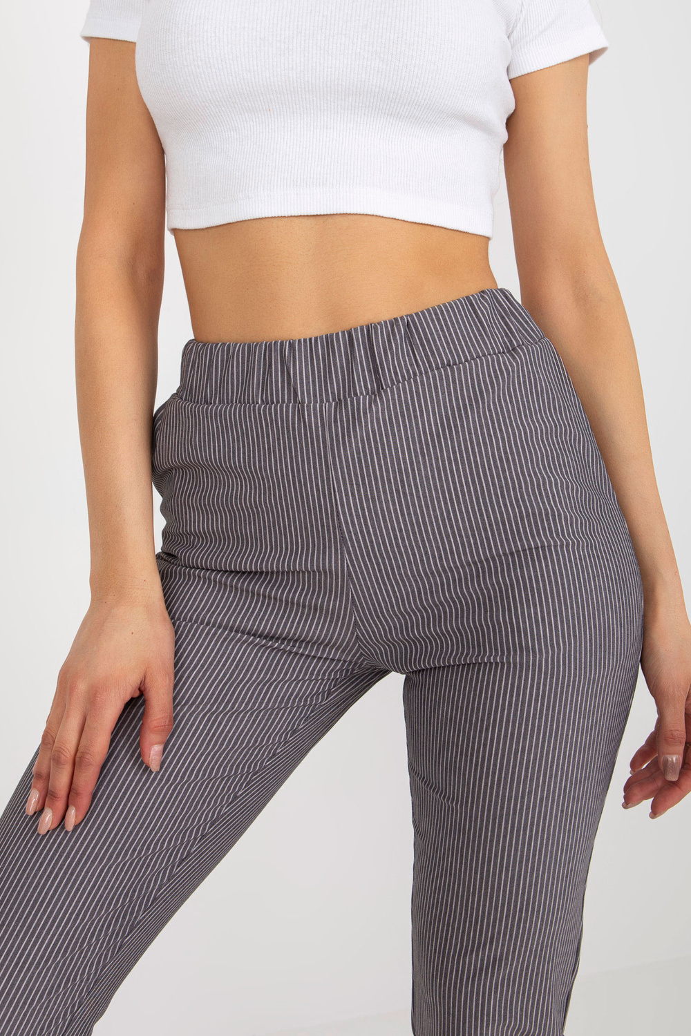 Violeta auduma svītrainas bikses bez aizdares.