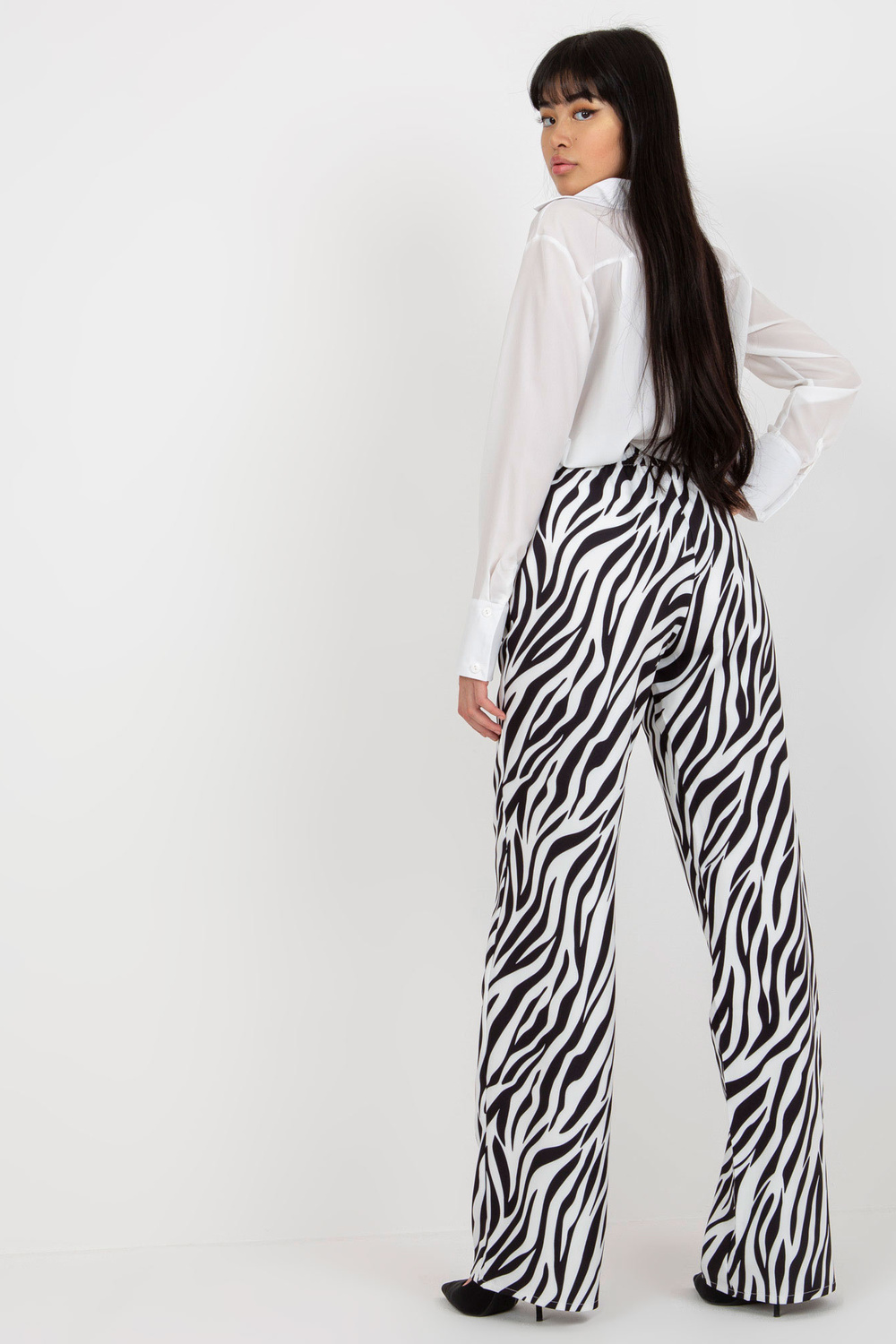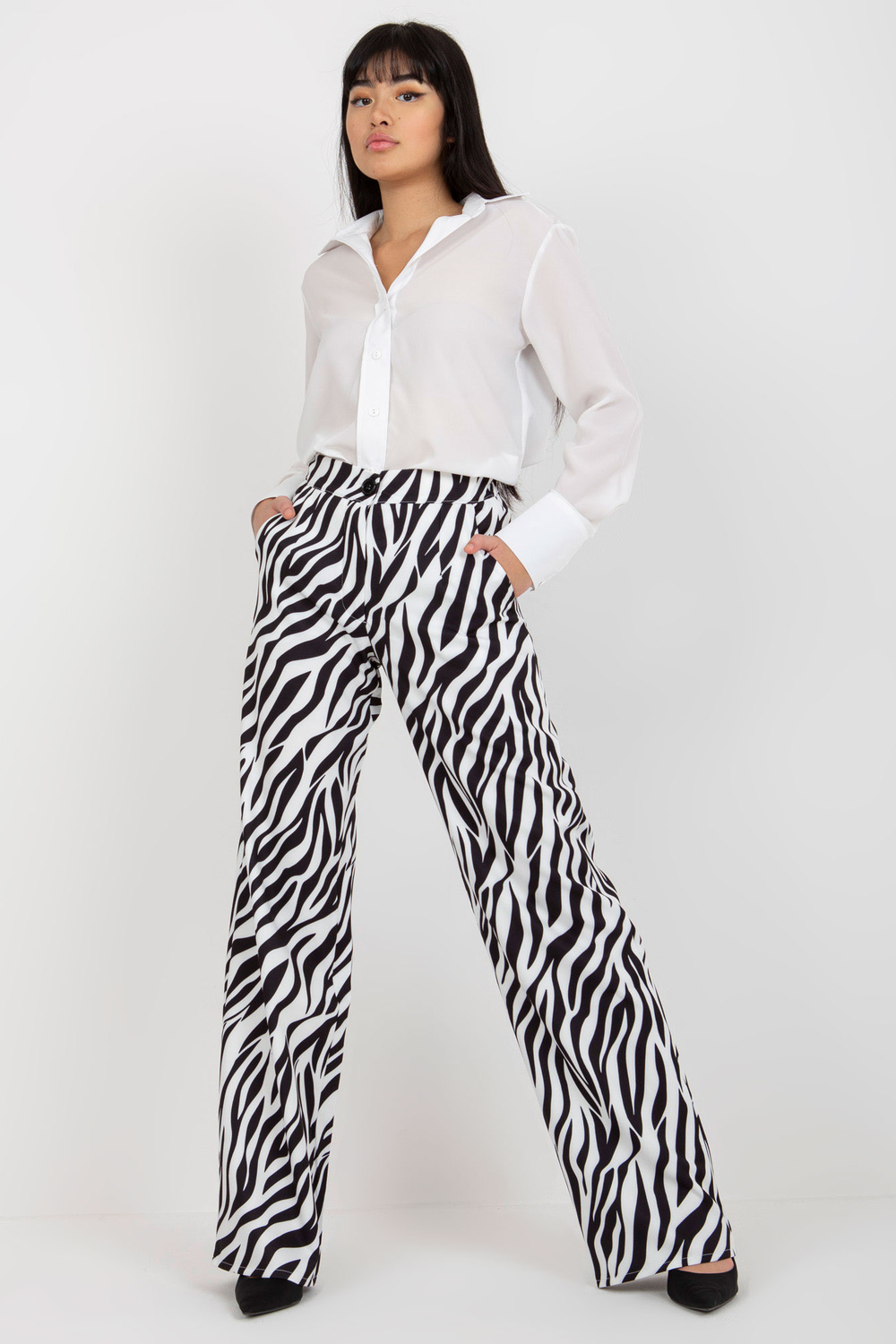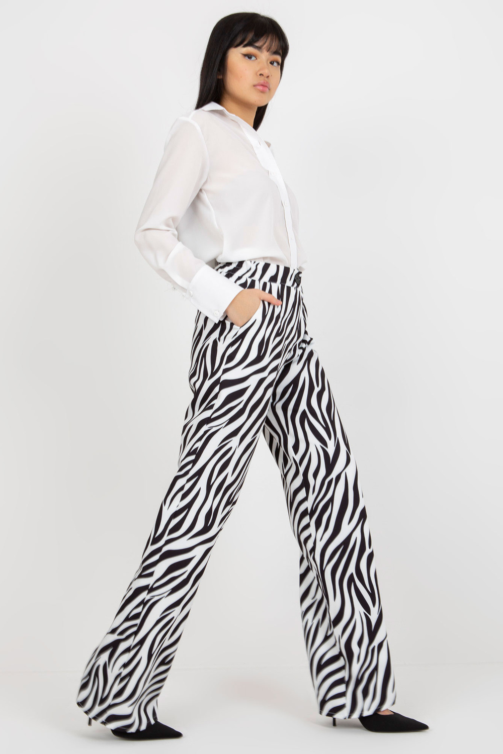 Melnbaltas platas bikses no dzīvnieku raksta auduma.