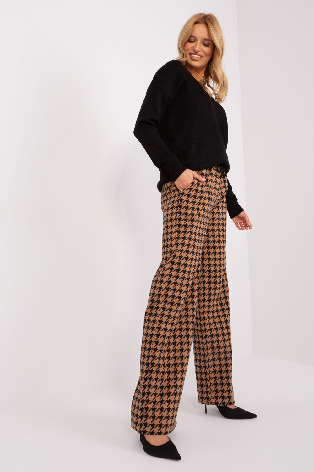 Melnas un kamieļu suņu zoba trikotāžas bikses .