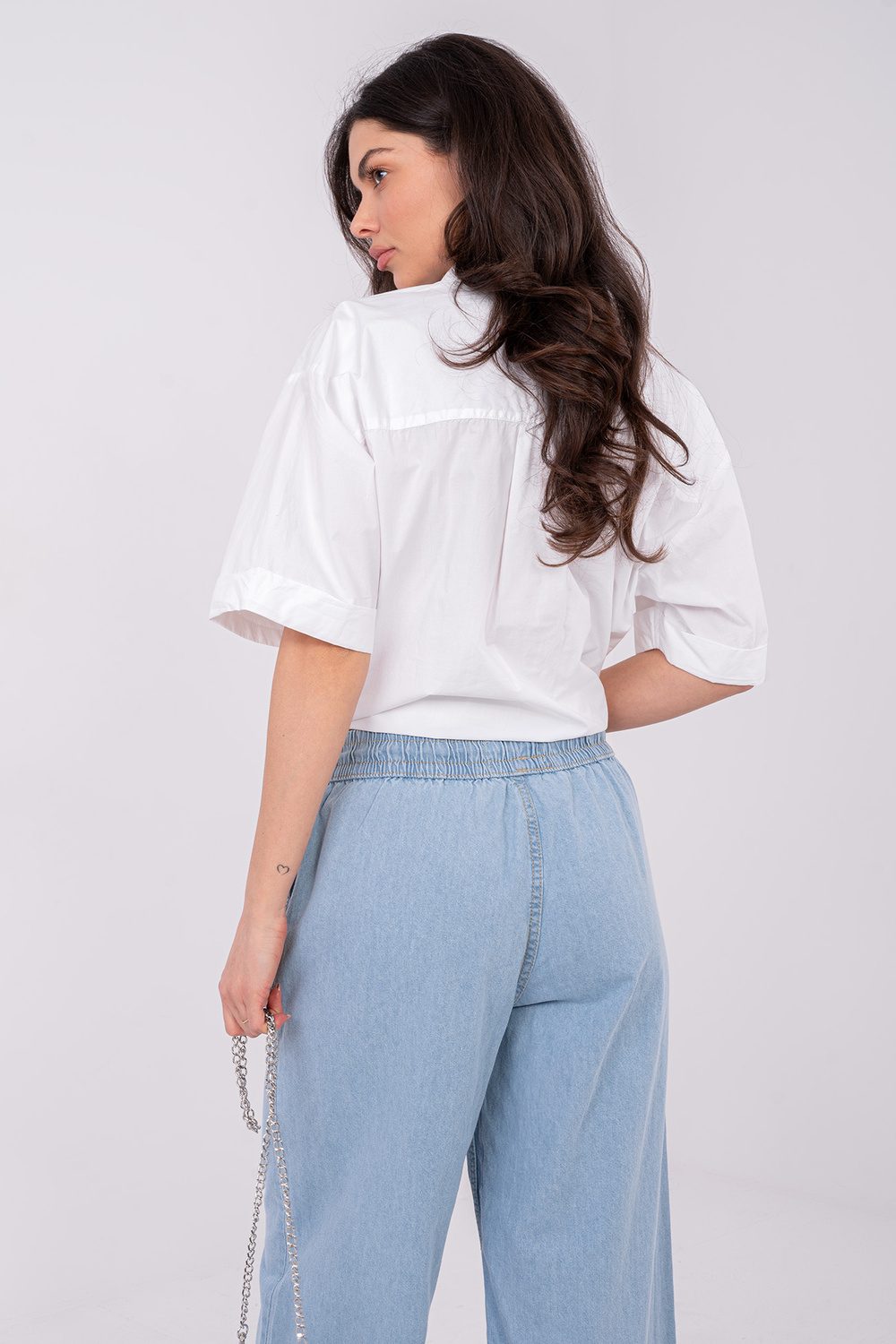 Modelis valkā S izmēru. Modeļa izmēri: augums 173 cm, krūtis 85 cm, viduklis 62 cm, gurni 95 cm.