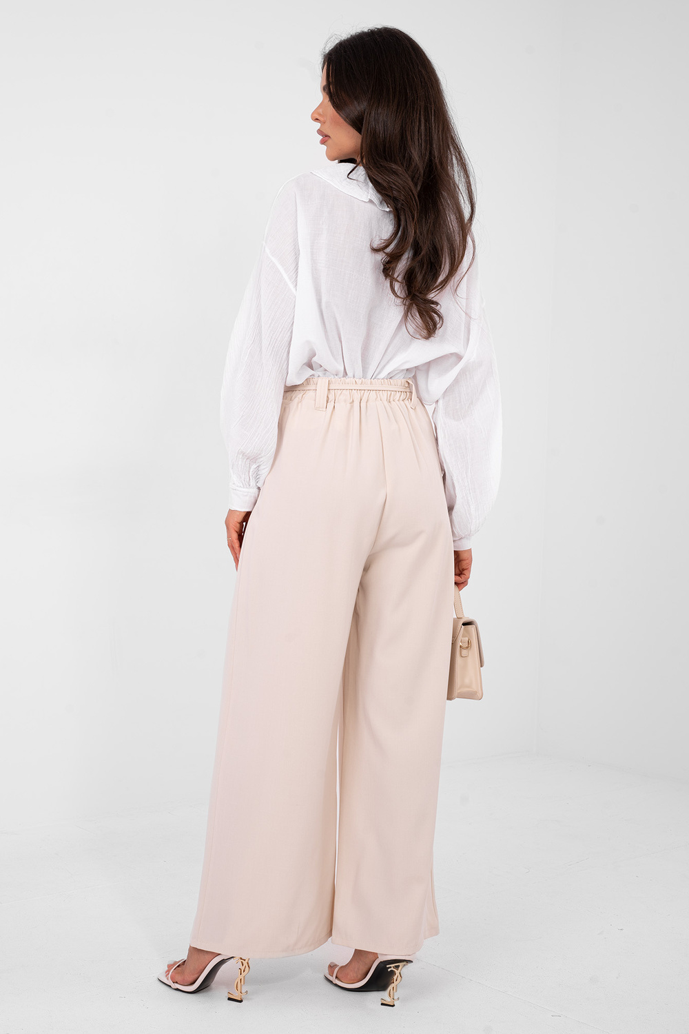 Modelis valkā viena izmēra apģērbu. Modeļa izmēri: augums 173 cm, krūtis 85 cm, viduklis 62 cm, gurni 95 cm .