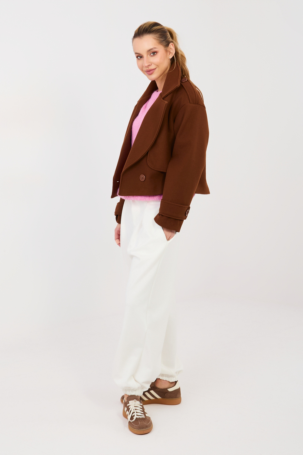 Modelis valkā vienas izmēra apģērbu. Modeļa izmēri: augums 169 cm, krūtis 88 cm, viduklis 68 cm, gurni 89 cm.