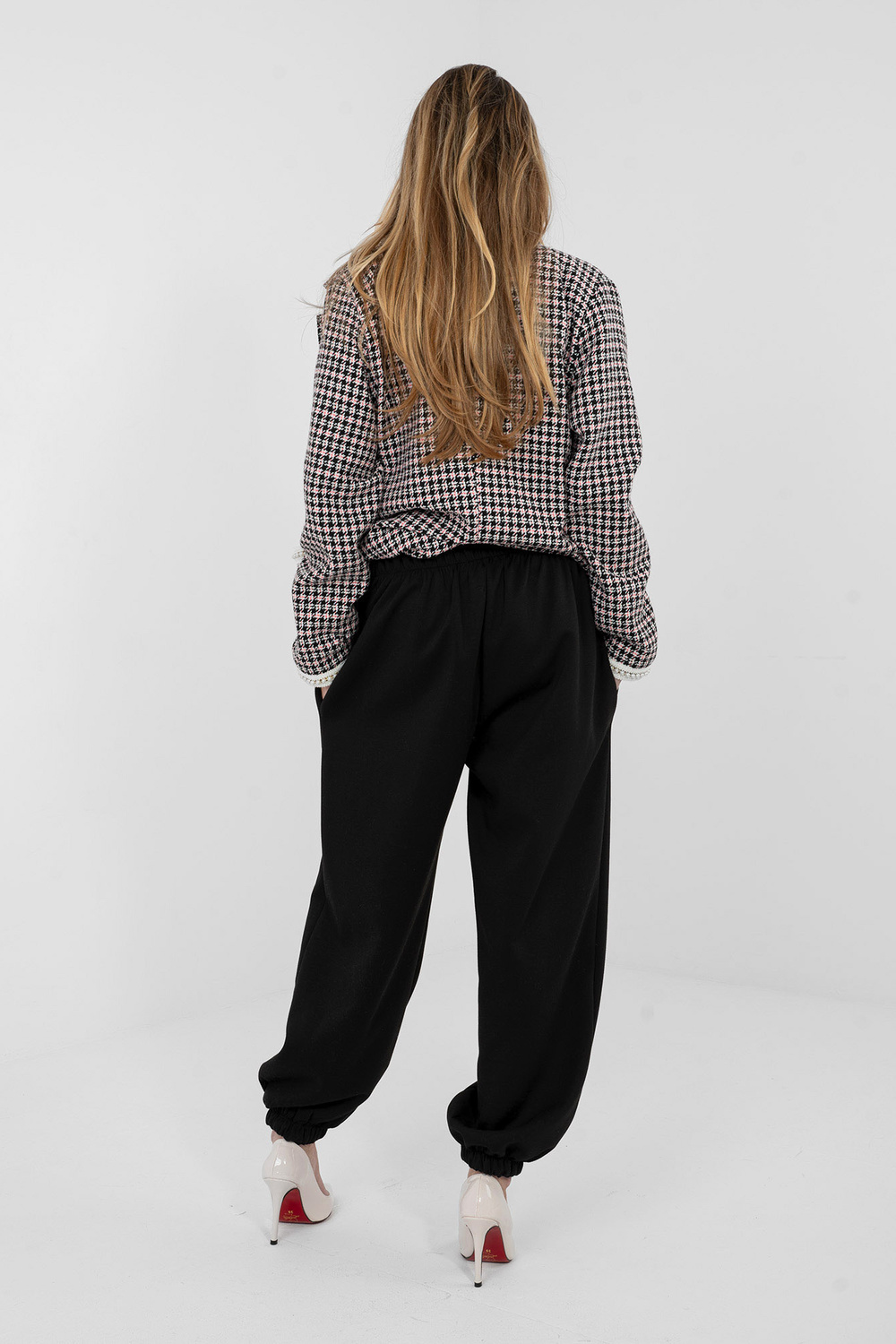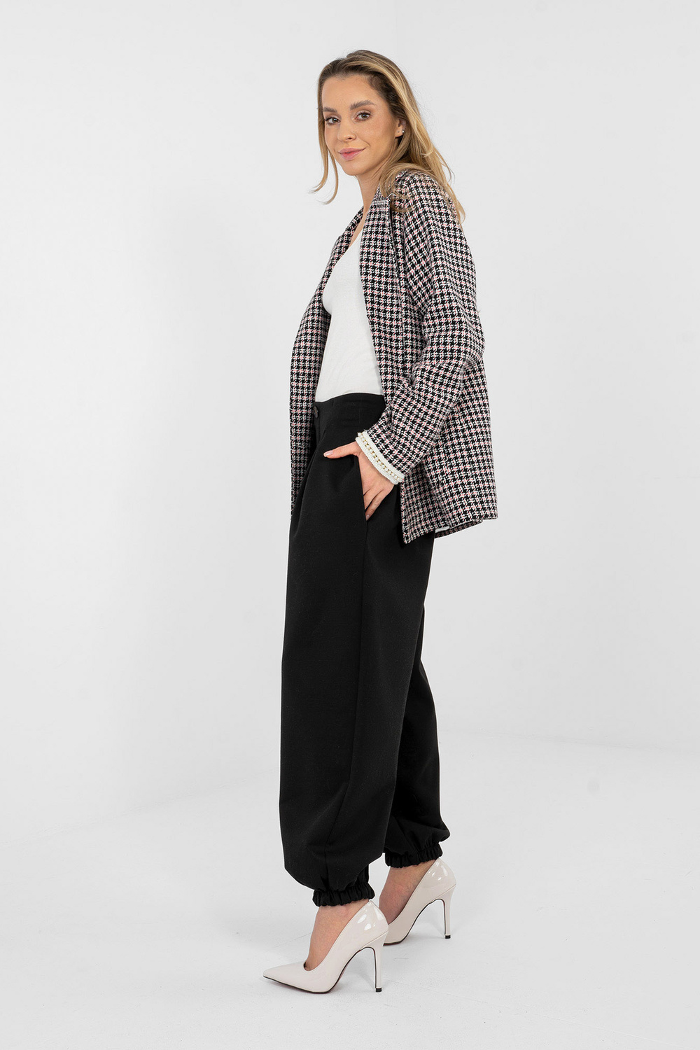 Modelis valkā viena izmēra apģērbu. Modeļa izmēri: augums 169 cm, krūtis 88 cm, viduklis 68 cm, gurni 89 cm .