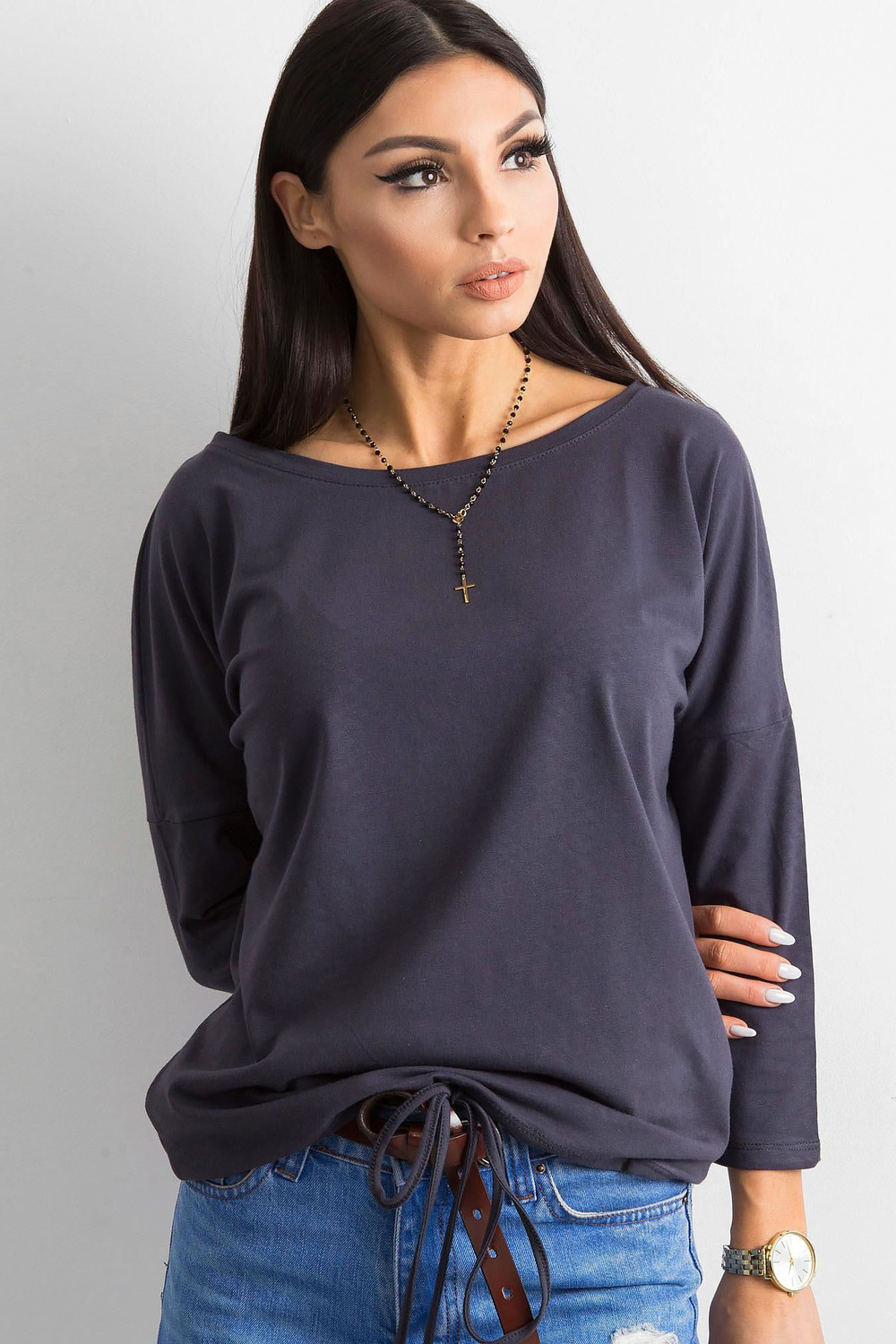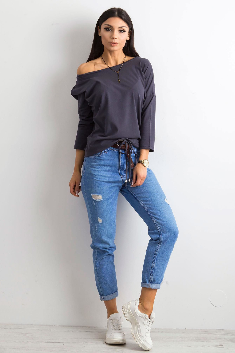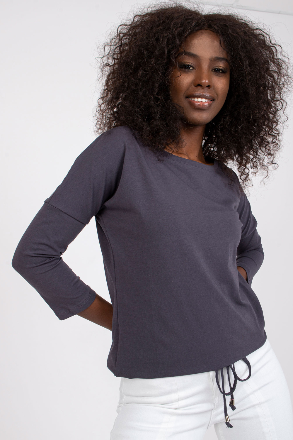 Fionas grafīta blūze . Vienkāršas, vienkrāsainas blūzes ir ļoti svarīgas sieviešu garderobē. Lielākā daļa sieviešu šādu apģērbu valkā katru dienu, katram iespējamam gadījumam, kad viņām nav jāizskatās formāli. Tādēļ mājās ir vērts parūpēties par blūžu krājumiem, kas noderēs teju ikvienā situācijā. Varat tos nēsāt uz skolu, darbu vai satikties ar draugiem, un katru reizi jutīsieties moderni un ērti. Tie ir lielisks sākumpunkts turpmākai stila veidošanai, ko varat izveidot atbilstoši savām vēlmēm. Lai iegūtu sportisku izskatu, kombinējiet šādu blūzi ar treniņbiksēm, rāvējslēdzēju un kedas un iegūsiet perfekti pilsētniecisku izskatu. Elegantajā versijā šī pamata blūze lieliski izskatīsies kopā ar augstiem papēžiem un moderniem mini svārkiem. Lai iegūtu klasisku neformālu izskatu, apvienojiet to ar džinsa biksēm un sporta apaviem vai kedas. Jūs paši redzat, cik daudz iespēju jums piedāvā moderns pamata apģērbs. Papildiniet savu blūžu kolekciju ar šo sievišķīgo modeli, kas izgatavots no gaisīgas kokvilnas, un ieprieciniet ar moderniem stiliem. Prezentētās blūzes brīvāks piegriezums ļoti labi pieguļ figūrai un ir ārkārtīgi ērts, un modīgās 3/4 piedurknes un dekoratīvās aproces ar aukliņu apakšā interesanti uzlabo tā vienkāršo dizainu. Piedāvātajai pamata blūzei ir arī ļoti glaimojošs laivas kakla izgriezums, kas izskatās ļoti pievilcīgi.