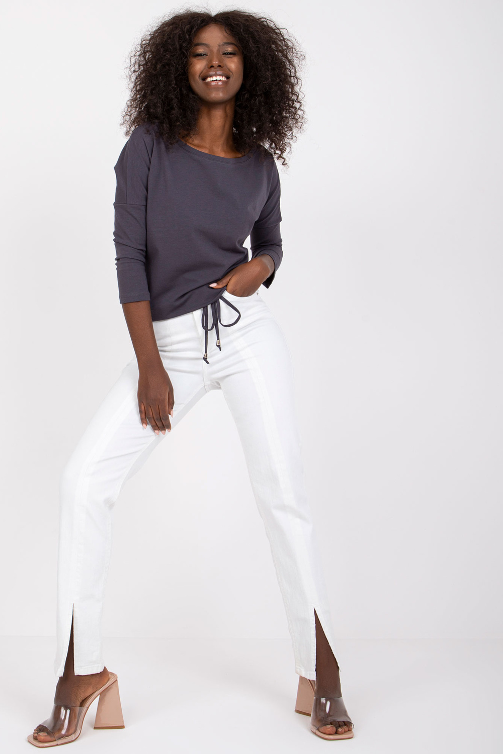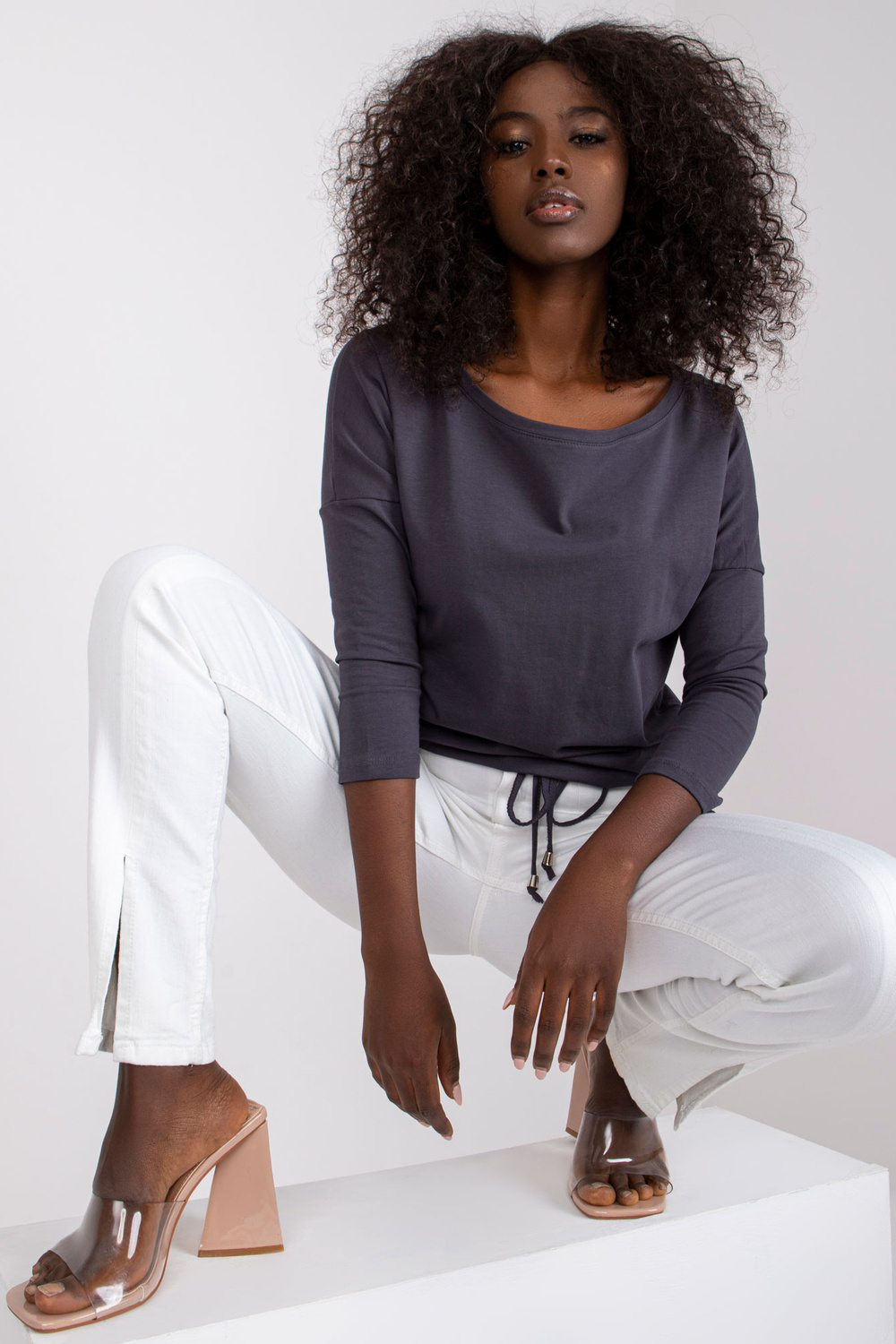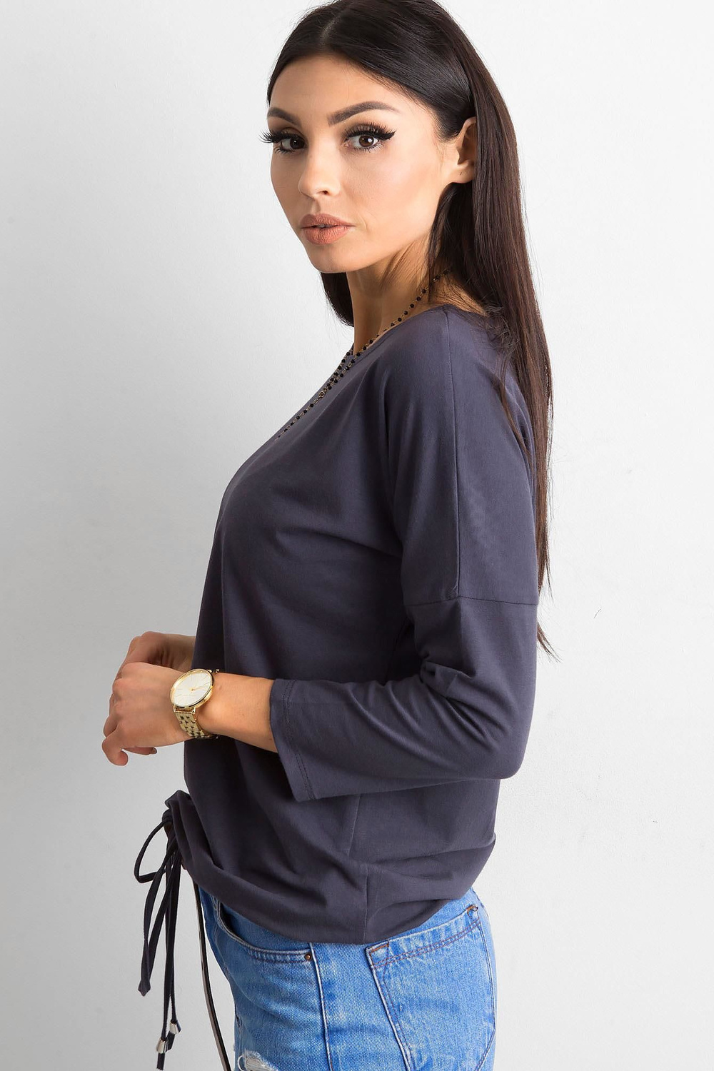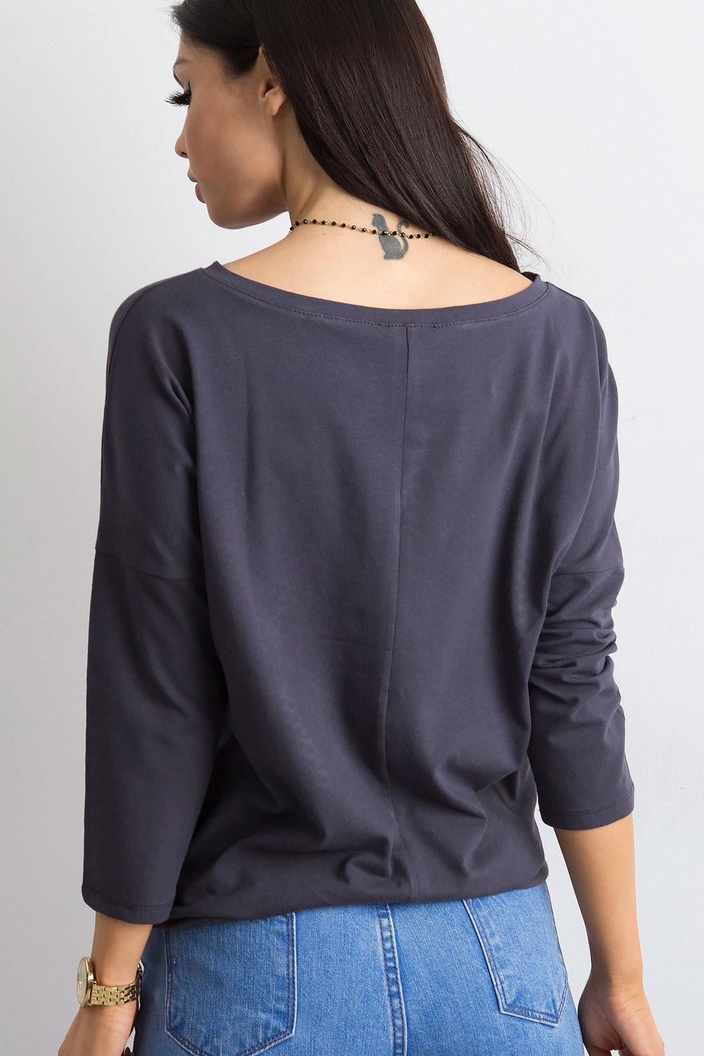 Fionas grafīta blūze . Vienkāršas, vienkrāsainas blūzes ir ļoti svarīgas sieviešu garderobē. Lielākā daļa sieviešu šādu apģērbu valkā katru dienu, katram iespējamam gadījumam, kad viņām nav jāizskatās formāli. Tādēļ mājās ir vērts parūpēties par blūžu krājumiem, kas noderēs teju ikvienā situācijā. Varat tos nēsāt uz skolu, darbu vai satikties ar draugiem, un katru reizi jutīsieties moderni un ērti. Tie ir lielisks sākumpunkts turpmākai stila veidošanai, ko varat izveidot atbilstoši savām vēlmēm. Lai iegūtu sportisku izskatu, kombinējiet šādu blūzi ar treniņbiksēm, rāvējslēdzēju un kedas un iegūsiet perfekti pilsētniecisku izskatu. Elegantajā versijā šī pamata blūze lieliski izskatīsies kopā ar augstiem papēžiem un moderniem mini svārkiem. Lai iegūtu klasisku neformālu izskatu, apvienojiet to ar džinsa biksēm un sporta apaviem vai kedas. Jūs paši redzat, cik daudz iespēju jums piedāvā moderns pamata apģērbs. Papildiniet savu blūžu kolekciju ar šo sievišķīgo modeli, kas izgatavots no gaisīgas kokvilnas, un ieprieciniet ar moderniem stiliem. Prezentētās blūzes brīvāks piegriezums ļoti labi pieguļ figūrai un ir ārkārtīgi ērts, un modīgās 3/4 piedurknes un dekoratīvās aproces ar aukliņu apakšā interesanti uzlabo tā vienkāršo dizainu. Piedāvātajai pamata blūzei ir arī ļoti glaimojošs laivas kakla izgriezums, kas izskatās ļoti pievilcīgi.