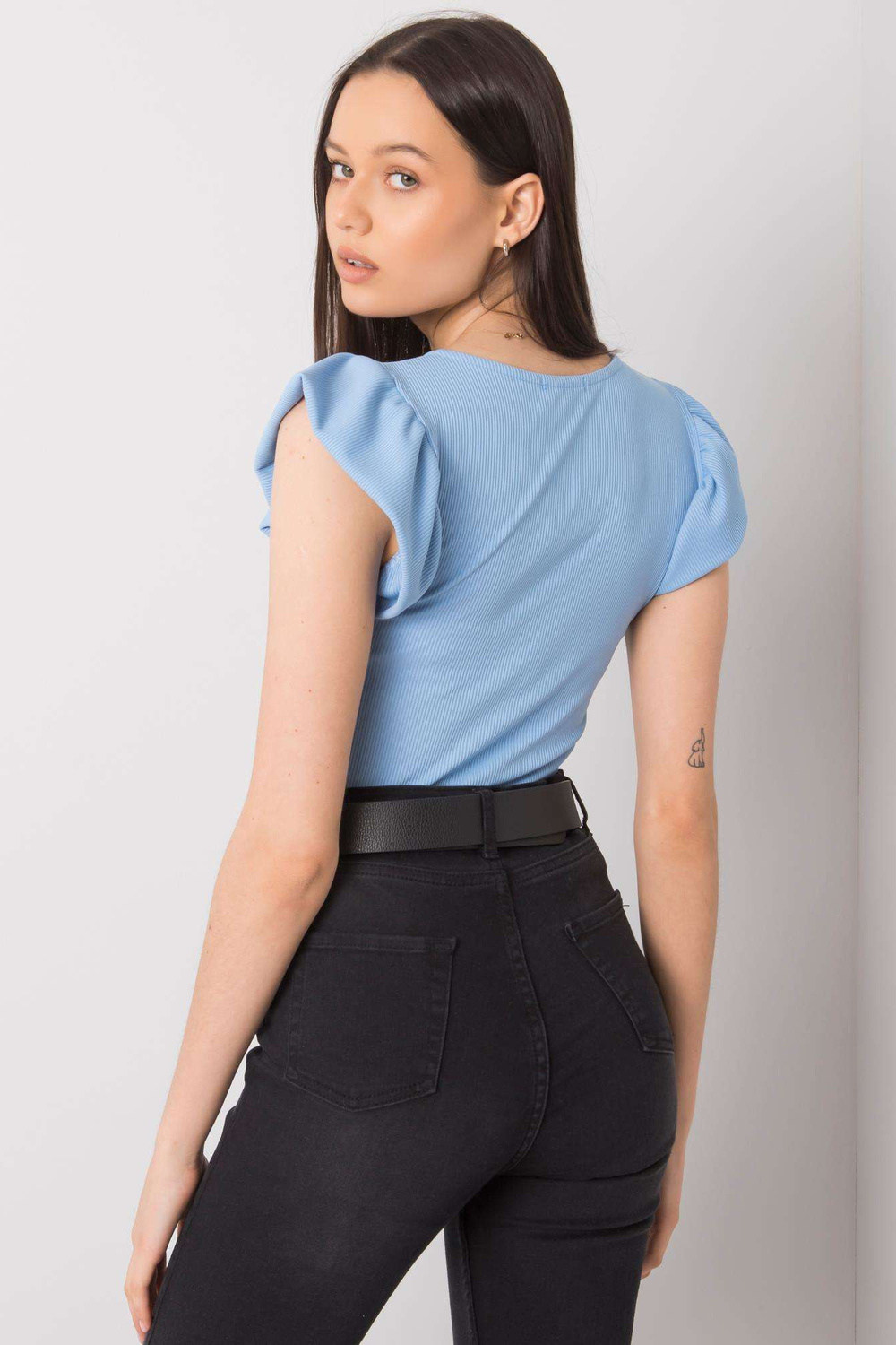 Gaiši zila blūze ar Waverly šņorēm. materiāla sastāvs: 95% kostīna nervure, 5% elastāns mazgāšanas metode: veļas mašīna 30°C. Modelis valkā vienu izmēru. Modeļa izmēri: augums 173 cm, krūtis 81 cm, viduklis 60 cm, gurni 90 cm. Viena s
