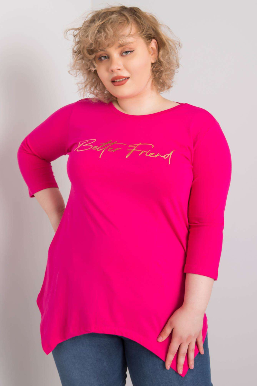 < p>Modele valkā viena izmēra izmēru. Modeļa izmēri: augums 179 cm, krūtis 116 cm, viduklis 98 cm, gurni 119 cm.Blūzes izmēri vienā izmērā, mērīti plakaniski: platums zem padusēm - 52 cm, kopējais garums - 82 cm, piedurkņu garums - 43 cm
