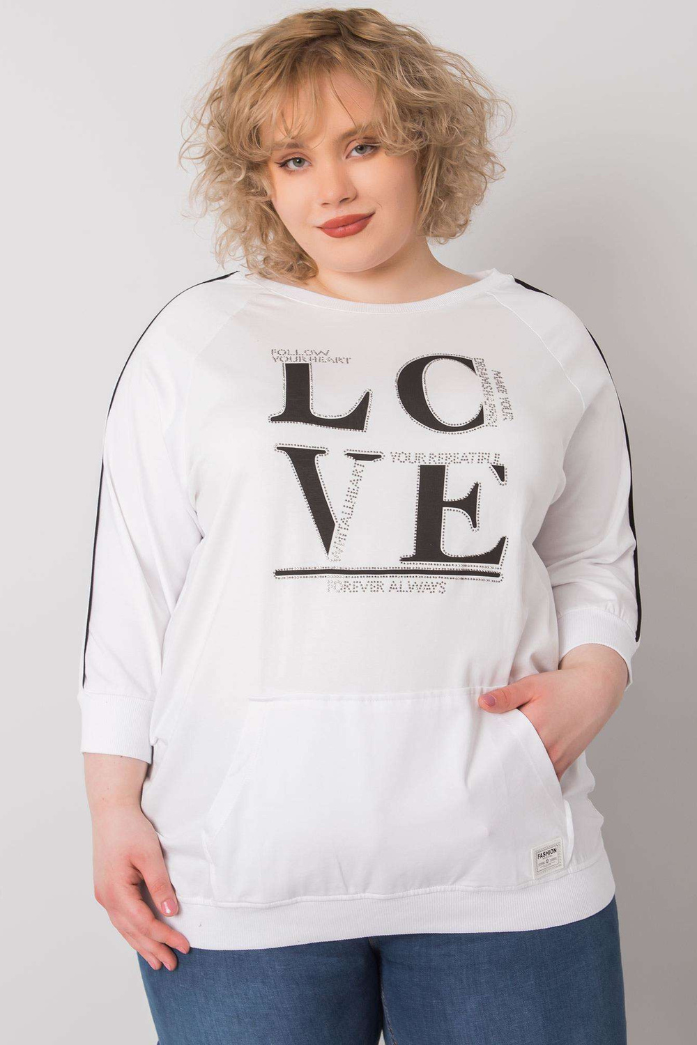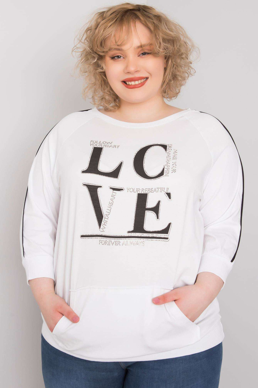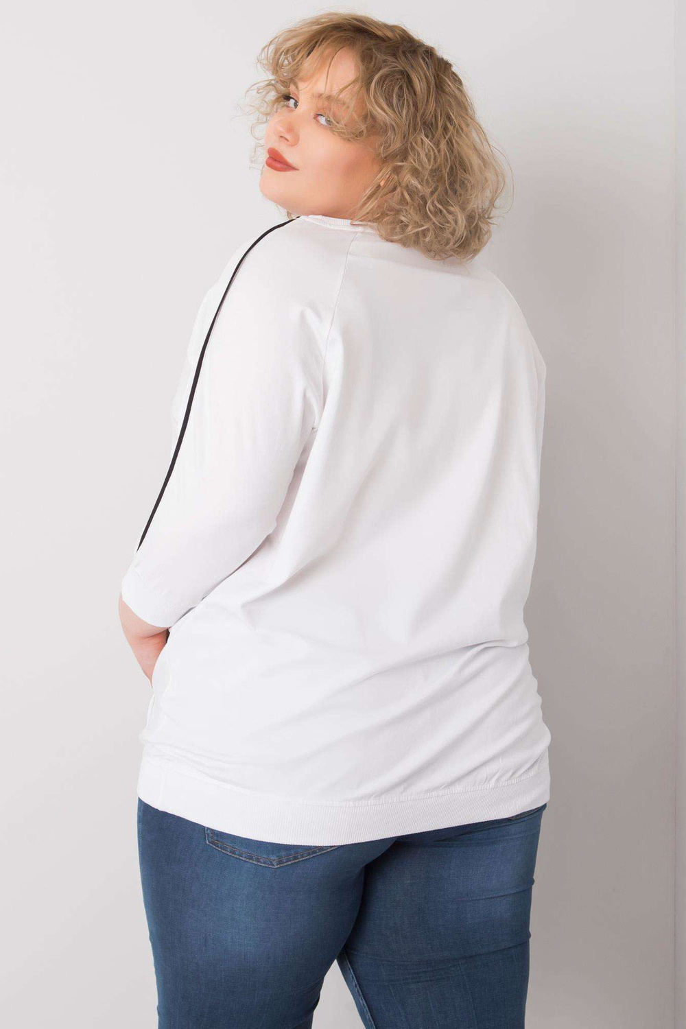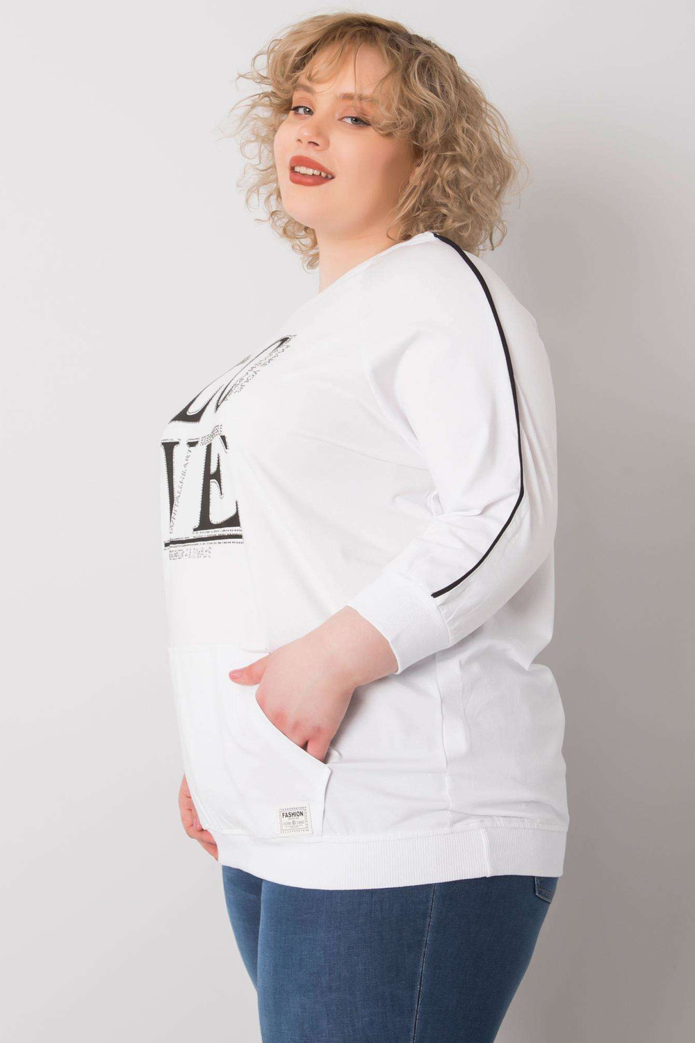 Whiteplus izmēra blūze ar Meg kabatu. Materiāla sastāvs: 90% kokvilna, 10% elastāns mazgāšanas metode: veļas mašīna 30°C. Modelis valkā viena izmēra izmēru. Modeļa izmēri: augums 179 cm, krūtis 116 cm, viduklis 98 cm, gurni 119 cm. Tunikas izmēri