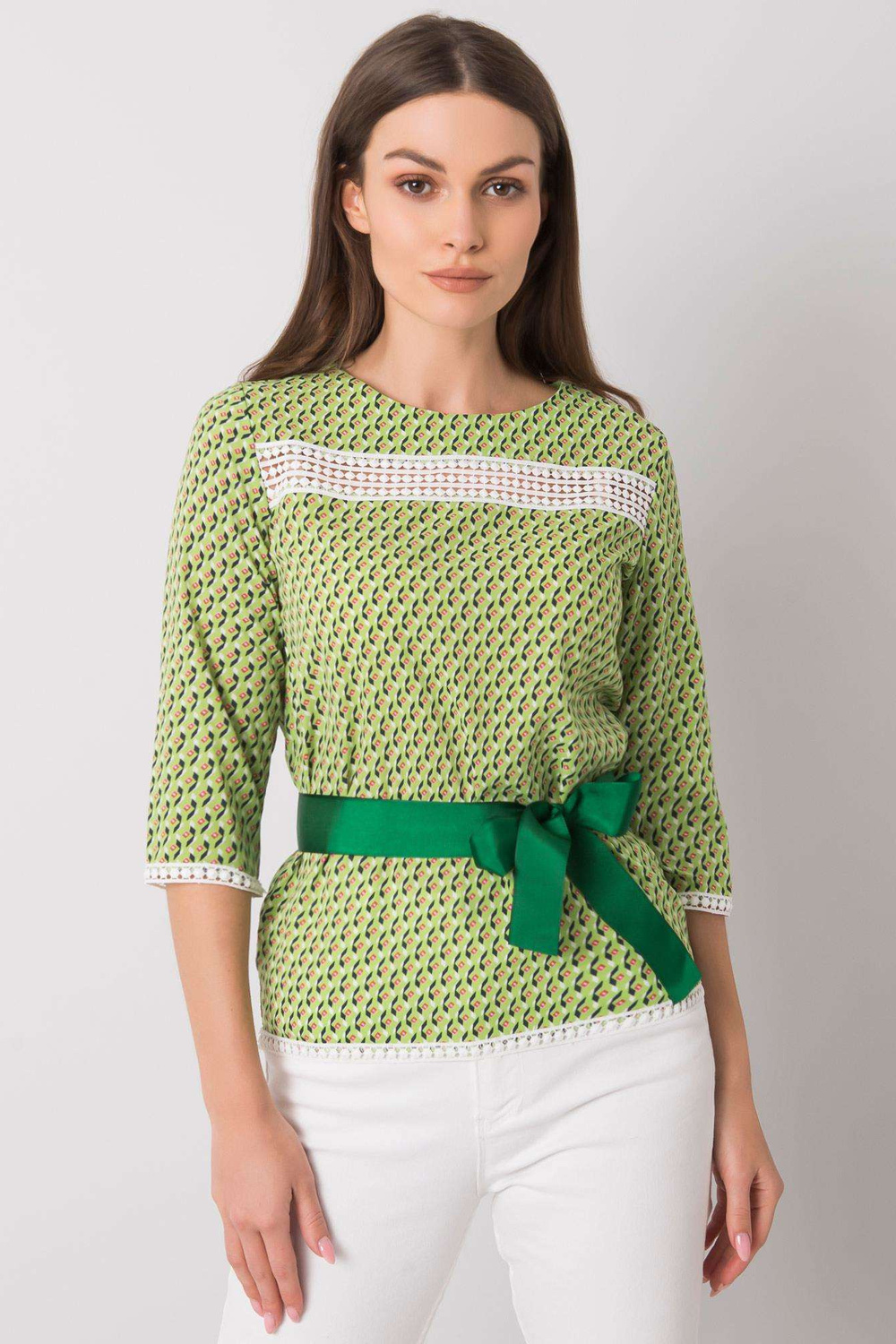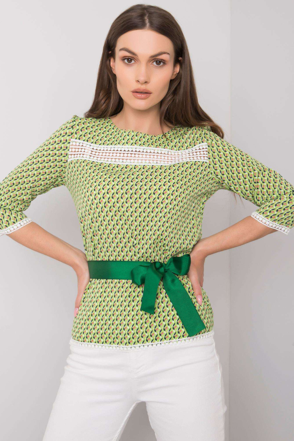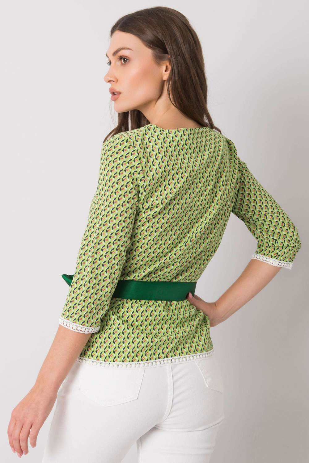 Zaļā blūze ar Ifrah rakstiem. ekstras: siksnas materiālssastāvs: 35% kokvilna 25% poliesters, 20% viskoze, 20% elastāns mazgāšanas metode: veļas mašīna 30°C Modelis valkā S izmēru. Modeļa izmēri: augstums 170 cm, krūtis 93 cm, viduklis 66 cm, gurni