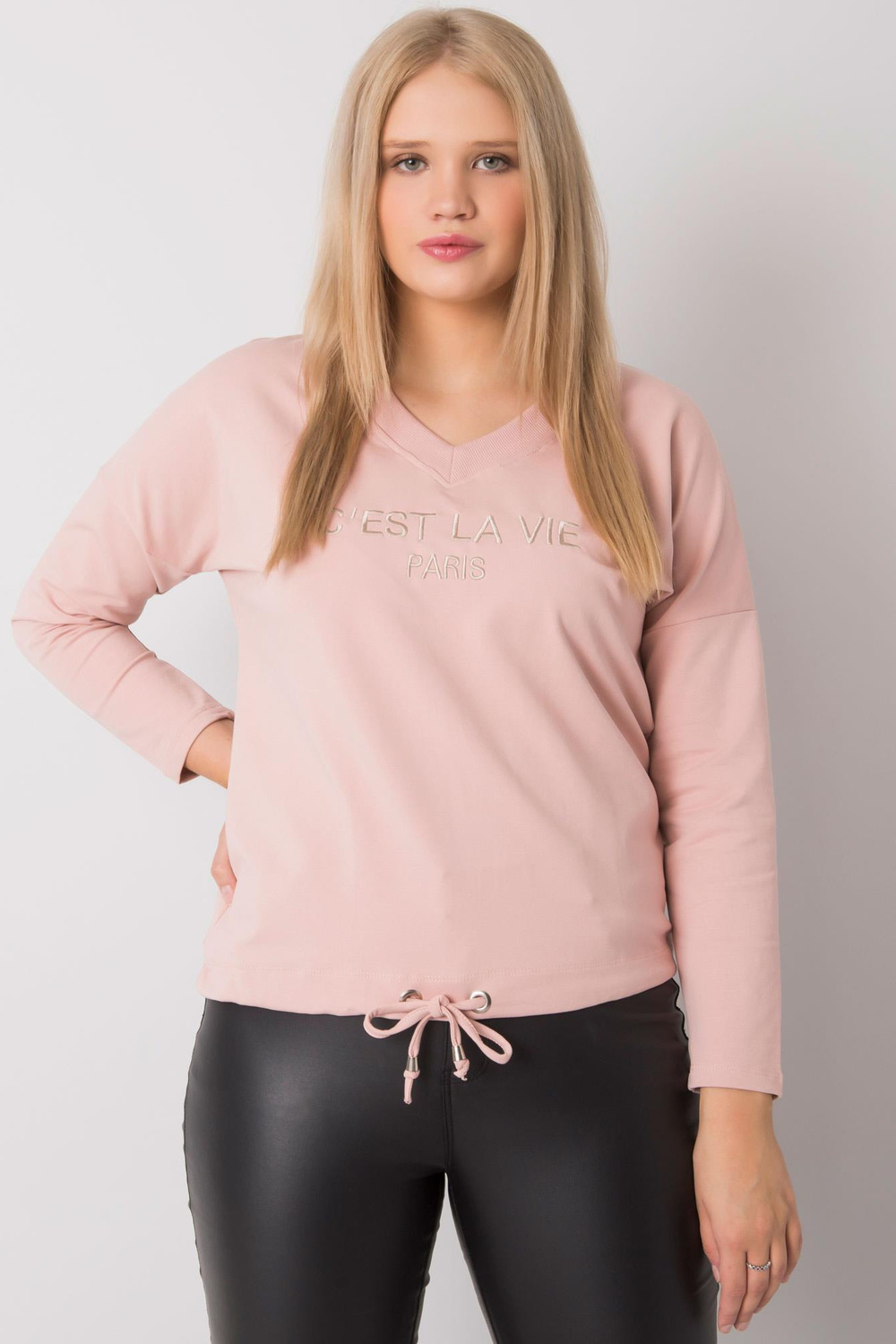 Modelis valkā izmēru viens izmērs. Modeļa izmēri: augums 177 cm, krūtis 100 cm, viduklis 80 cm, gurni 110 cm.