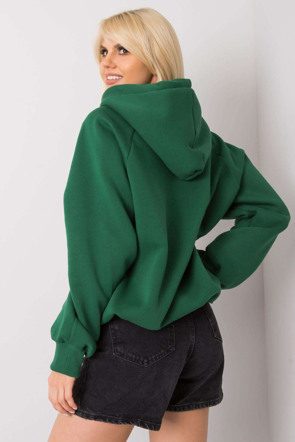 Debijas zaļā polsterētā kapuce. piedevas: sildošs materiālssastāvs: 70% kokvilna, 30% poliesters mazgāšanas metode: veļas mašīna 30°C. Modelis valkā S/M izmēru. Modeļa izmēri: augums 175 cm, krūtis 85 cm, viduklis 63 cm, gurni 95 cm. Sviedru kreklu izmēri