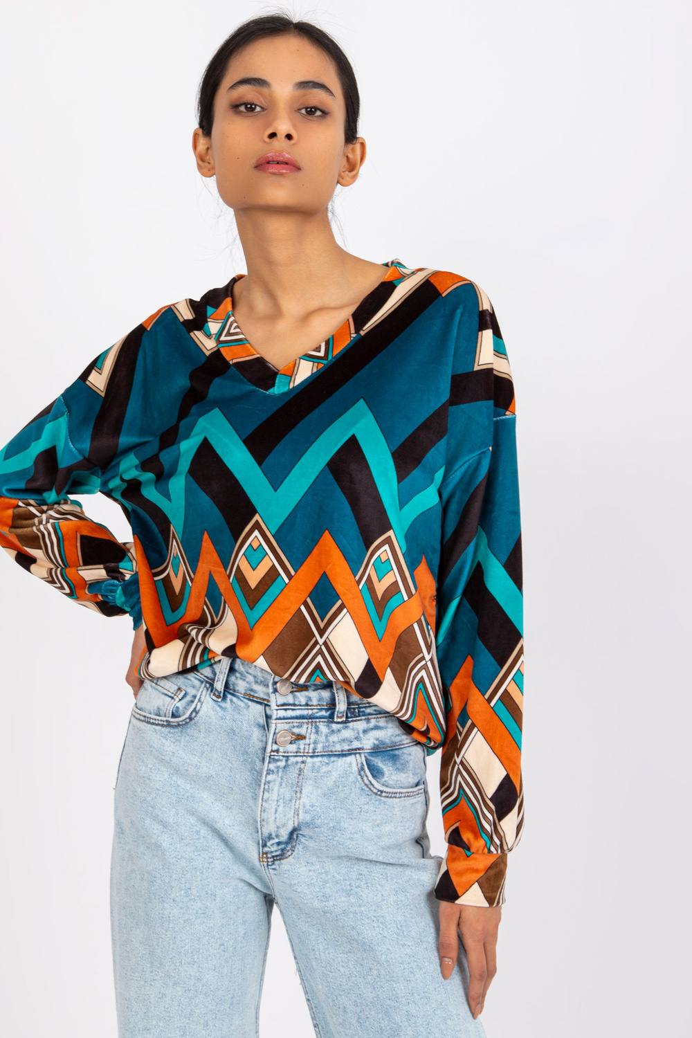 Jūras un oranža velūra blūze ar Lea apdrukām.