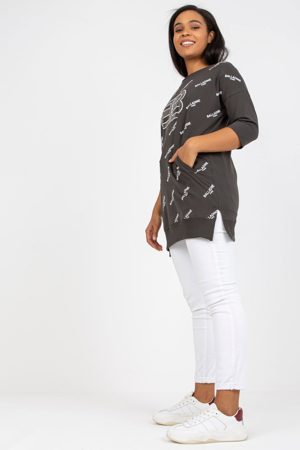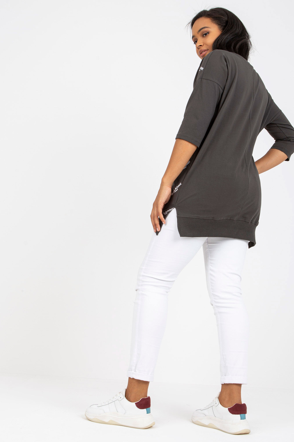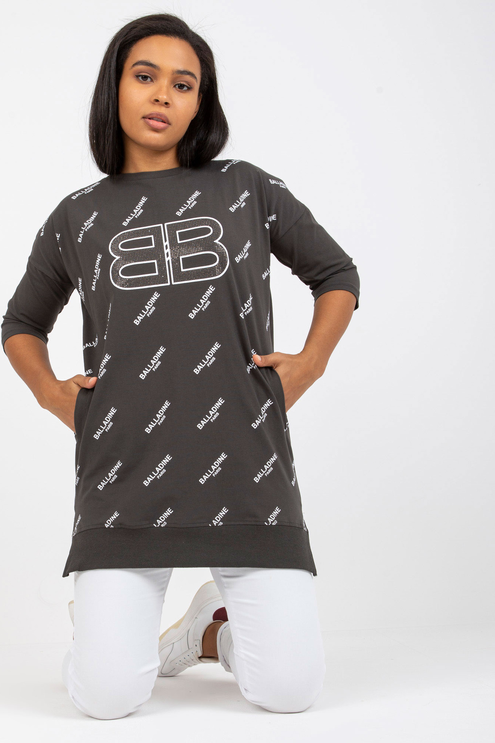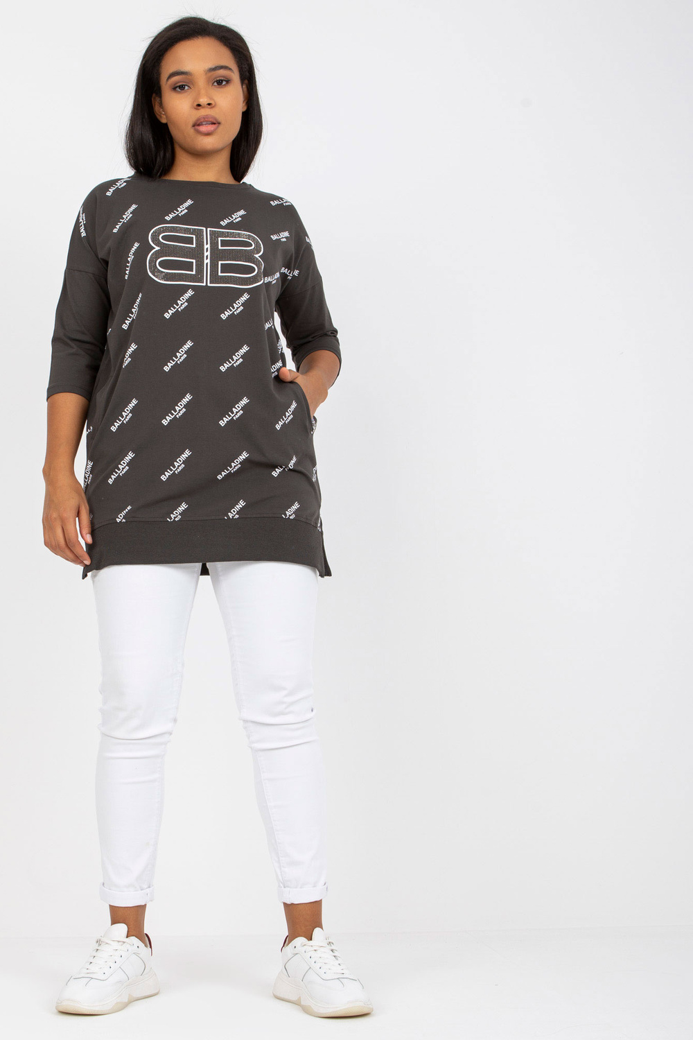 Khakiplus izmēra kokvilnas blūze ar kabatām. aksesuāri: kabatas materiālssastāvs: 90% kokvilna, 10% elastāns mazgāšanas metode: mazgāšana veļasmašīnā 30°C Produkta kods: RV-BZ-7036.02P dominējošais raksts: apdruka, aplikācijas Stils: ikdienišķs gadījums: ikdienišķs, ārā uz ci