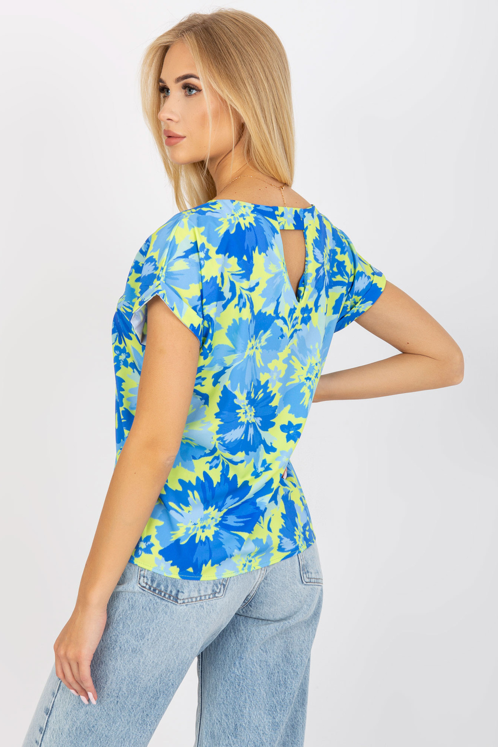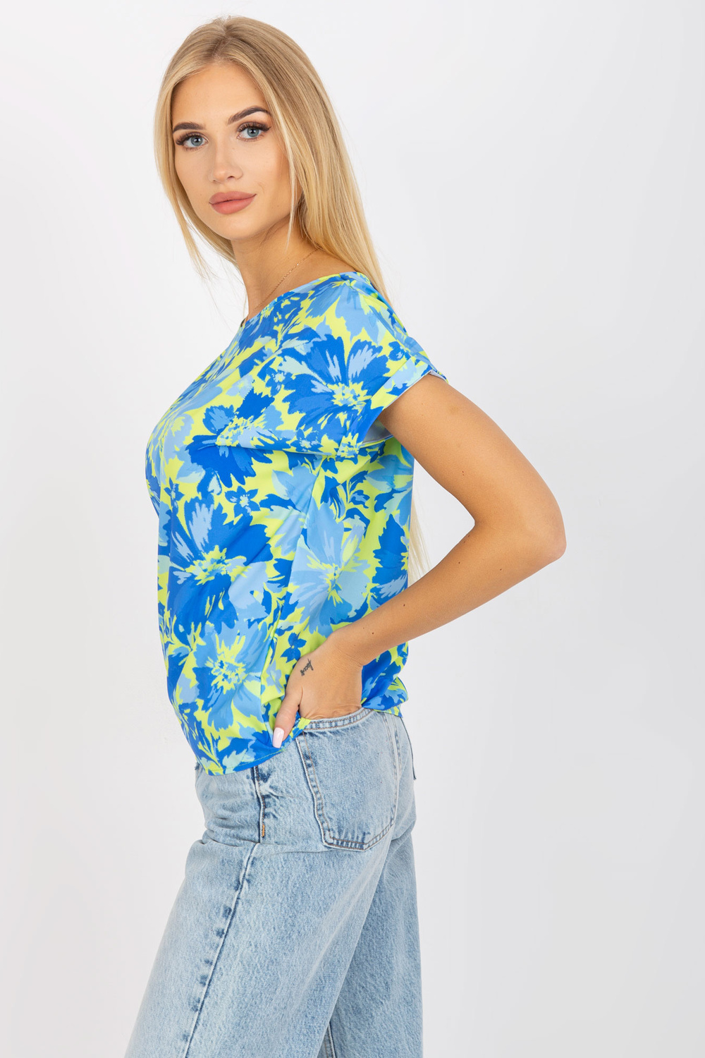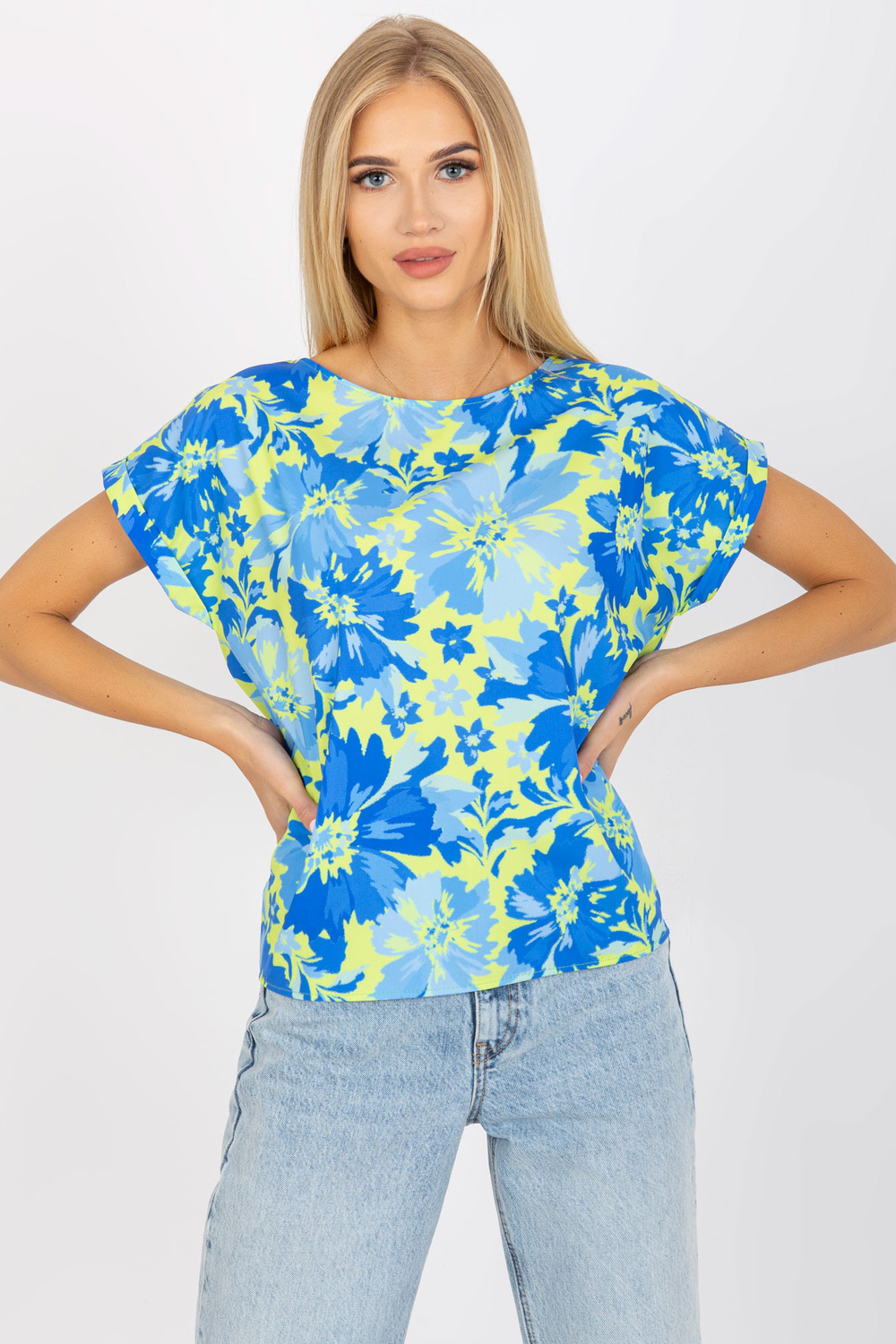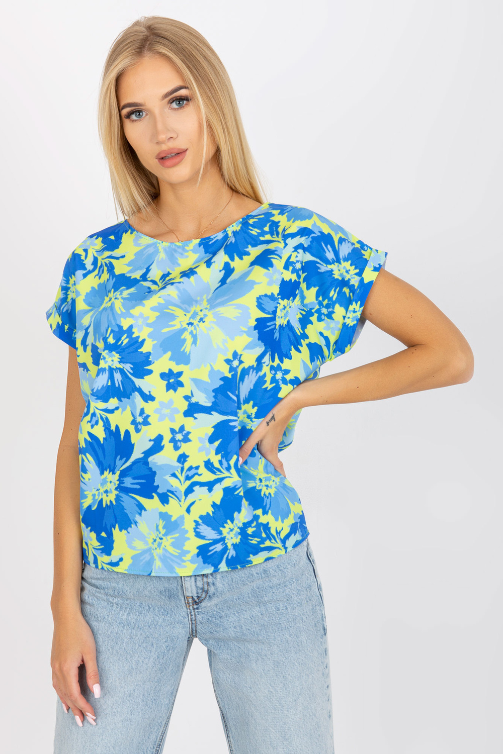 Zilā un dzeltena brīva blūze ar RUE PARIS apdruku.