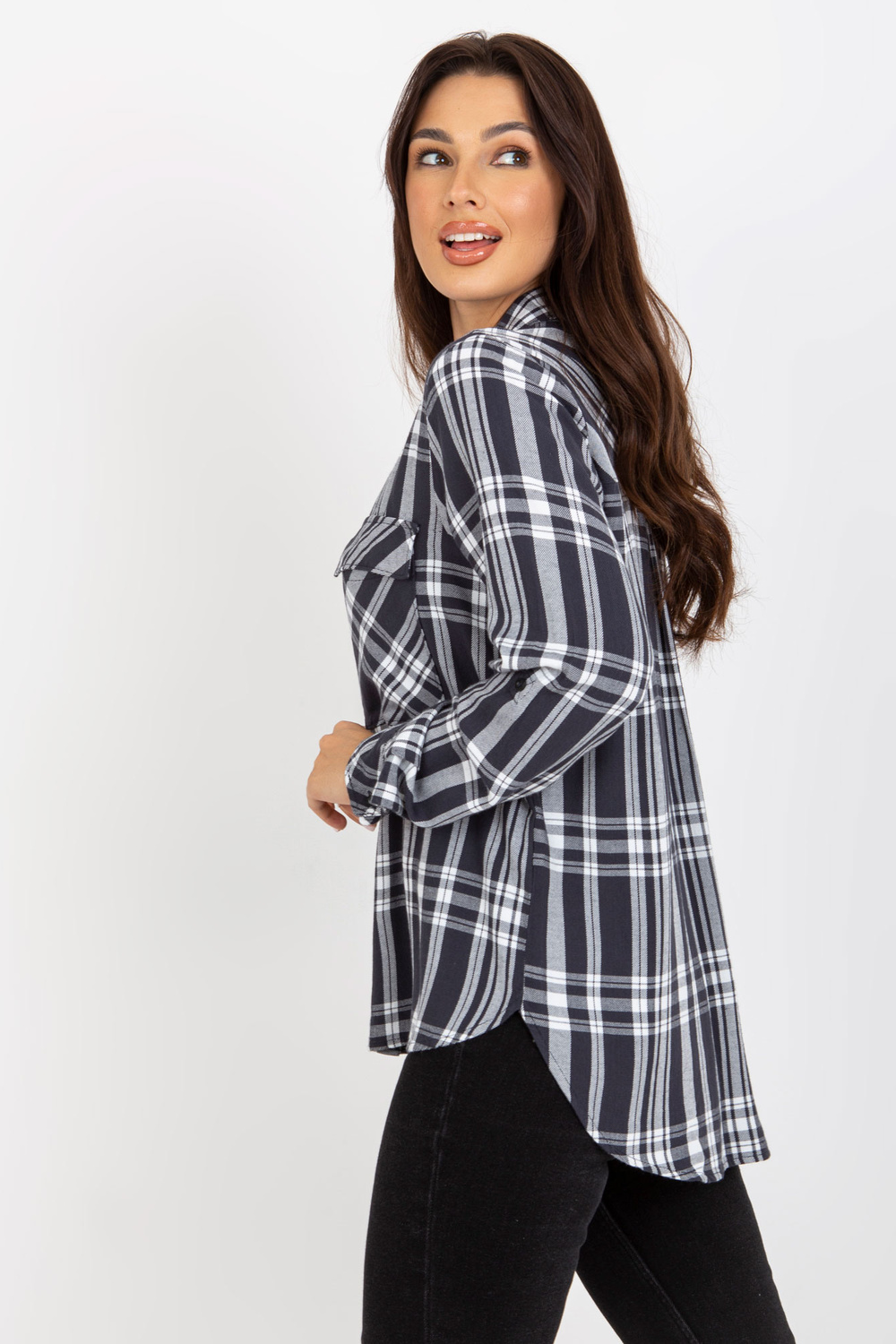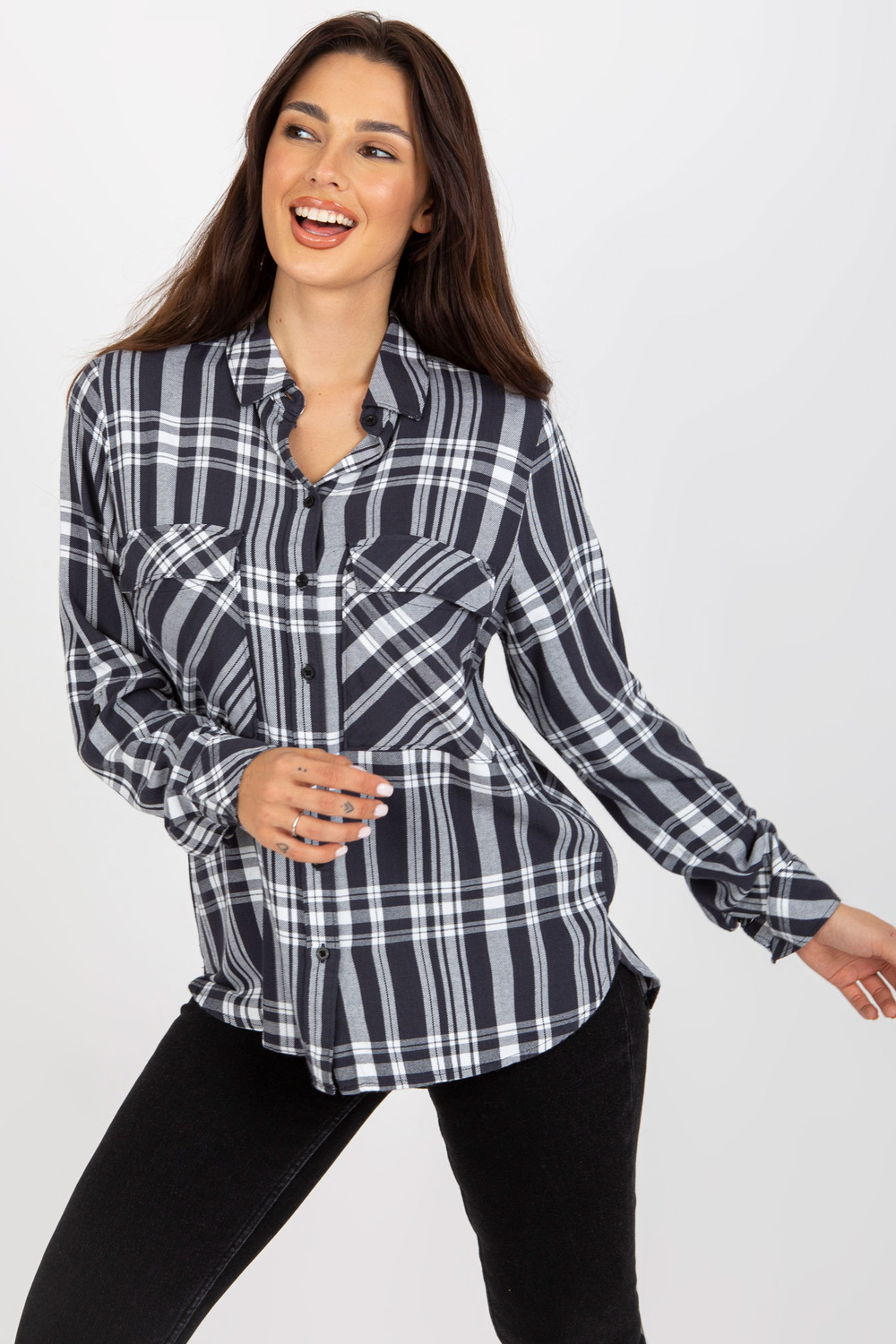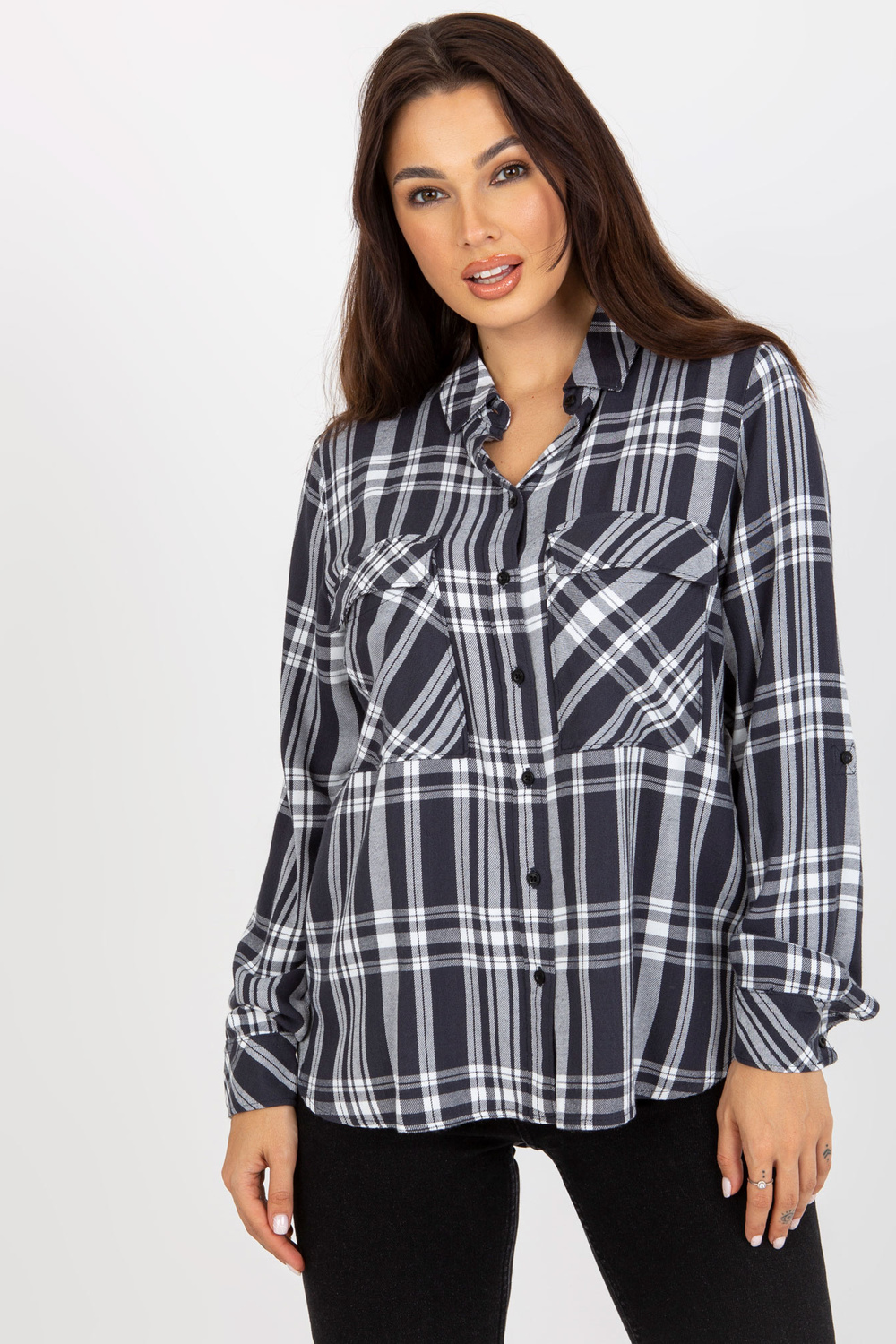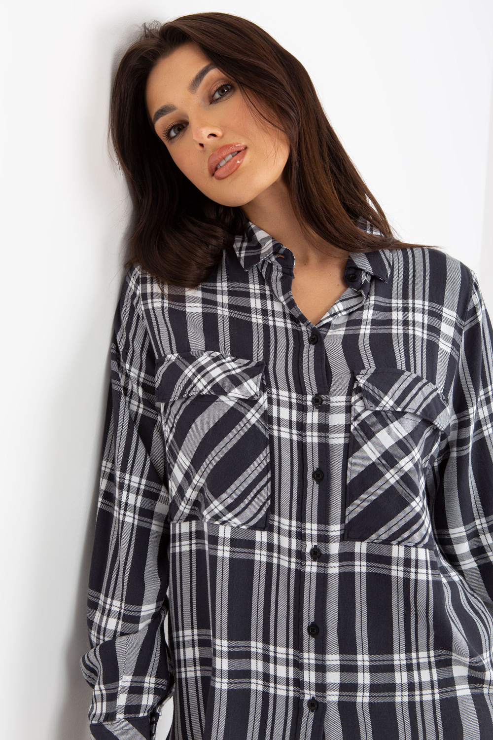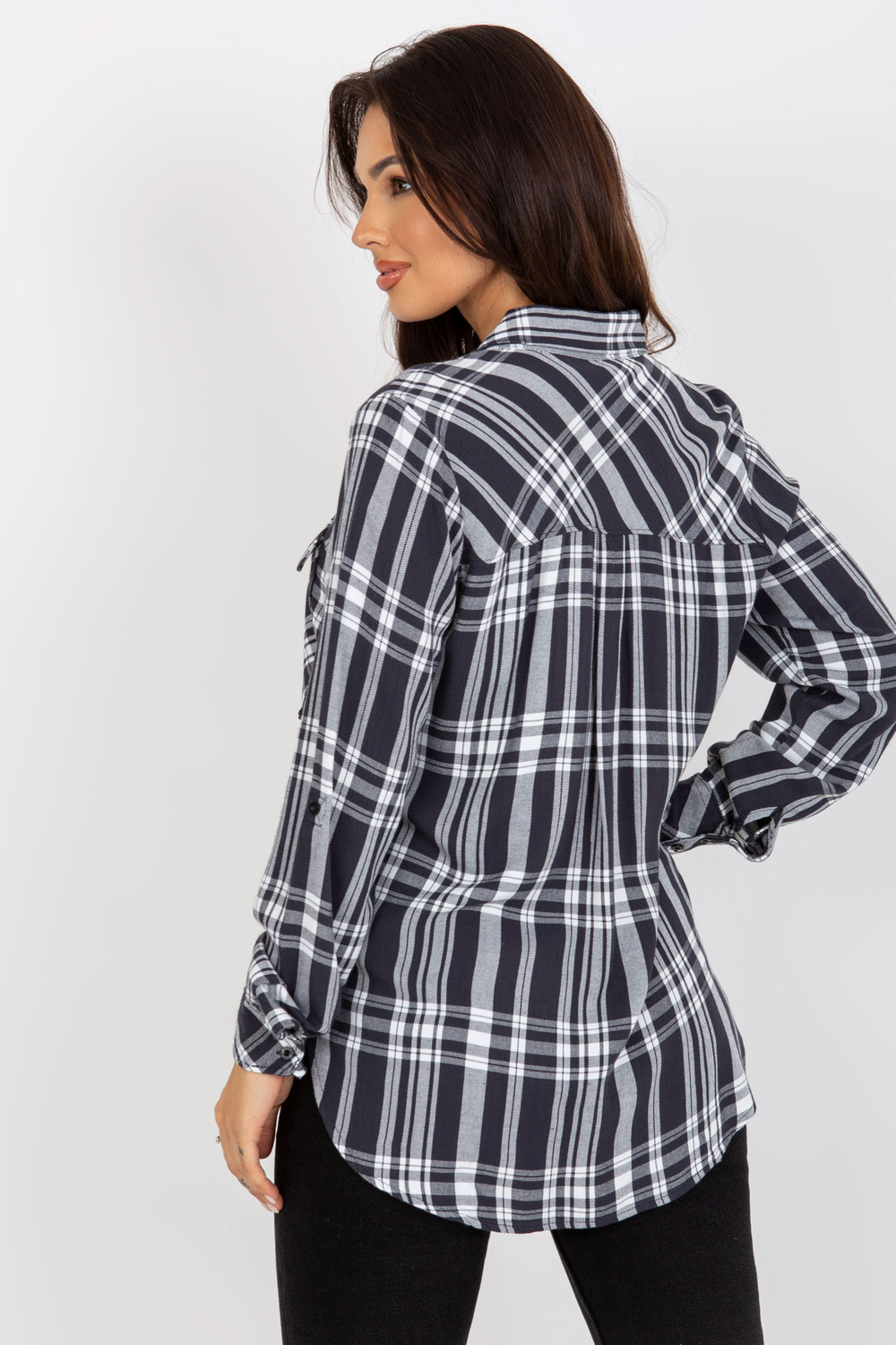 Tumši pelēks sieviešu rūtains krekls ar kabatām .