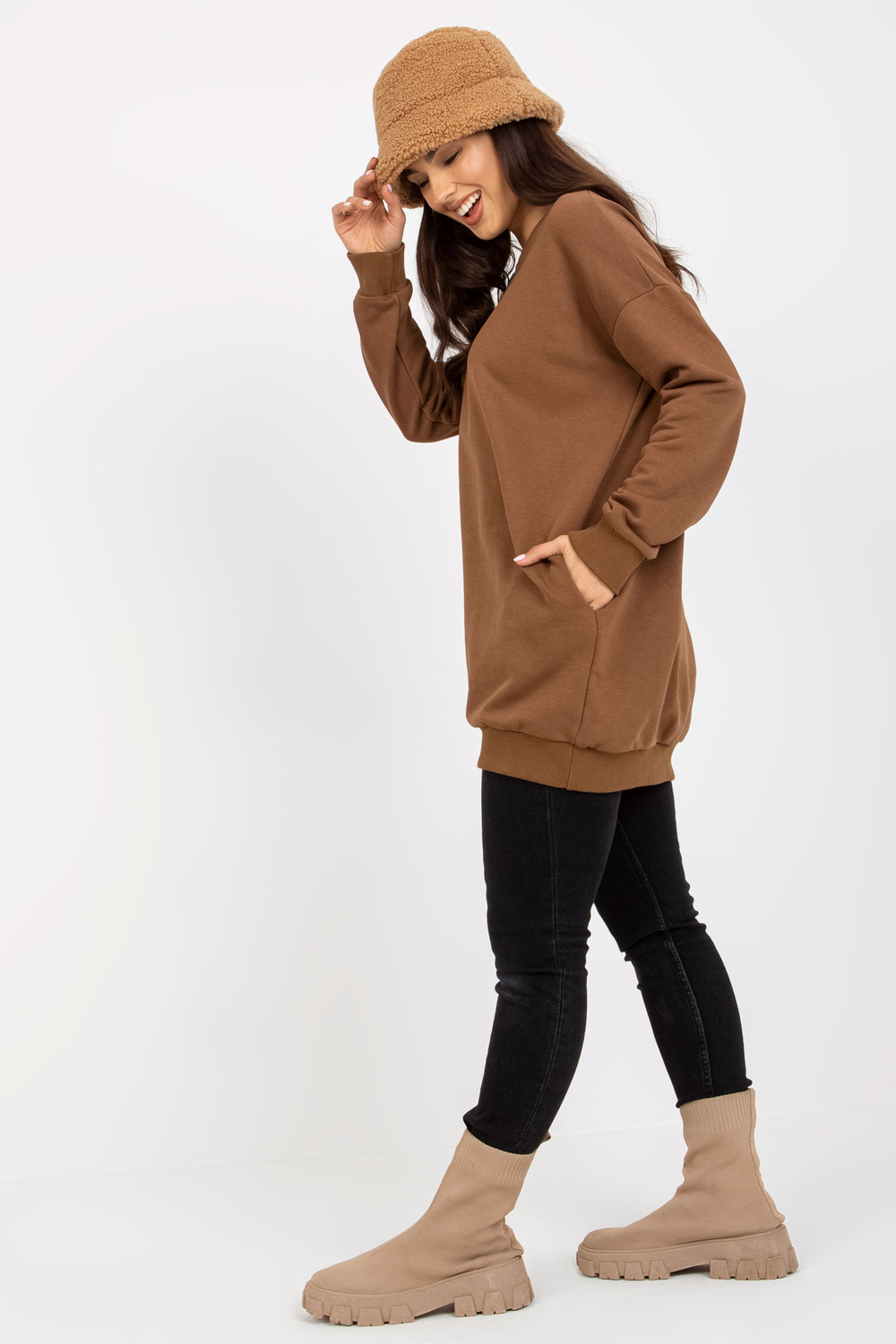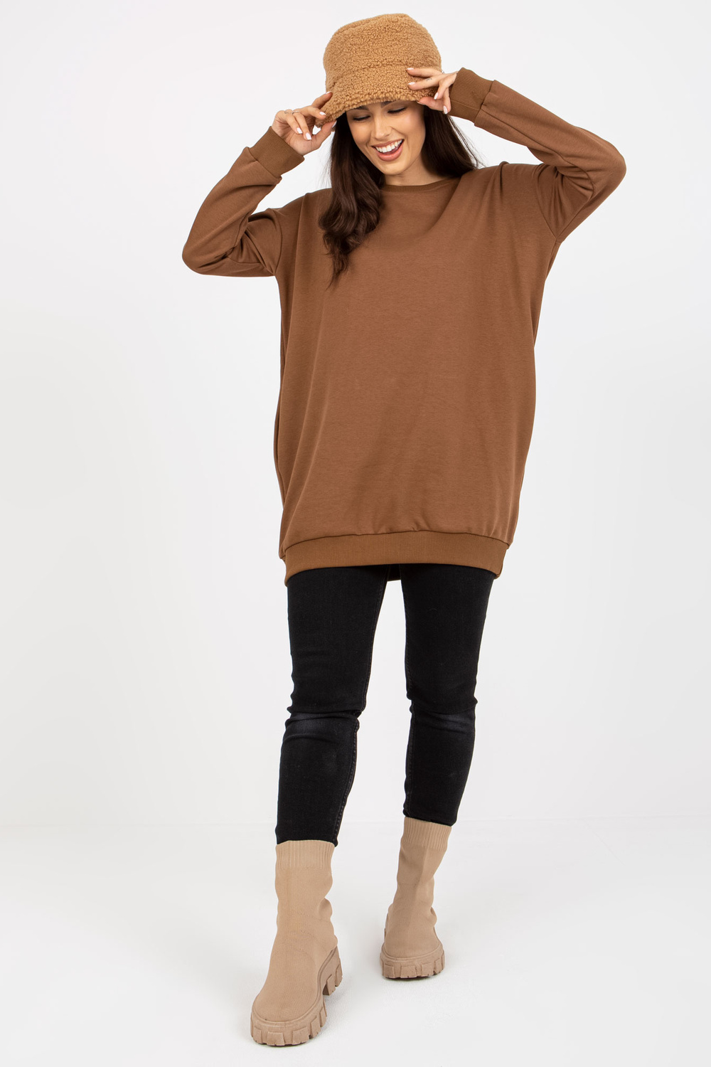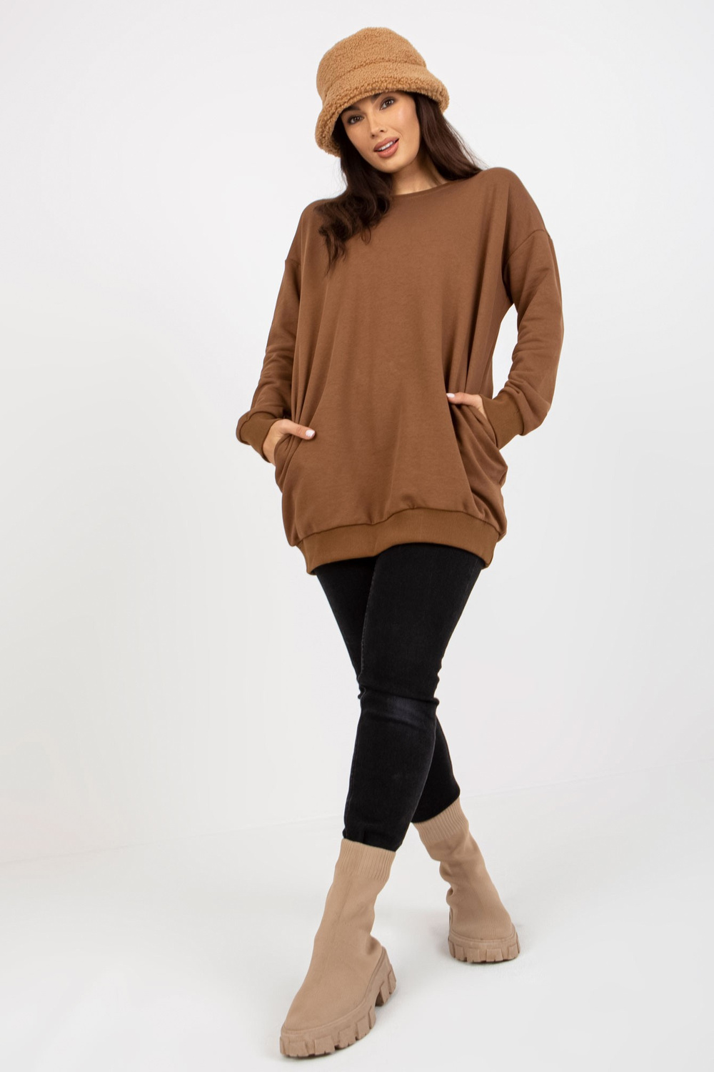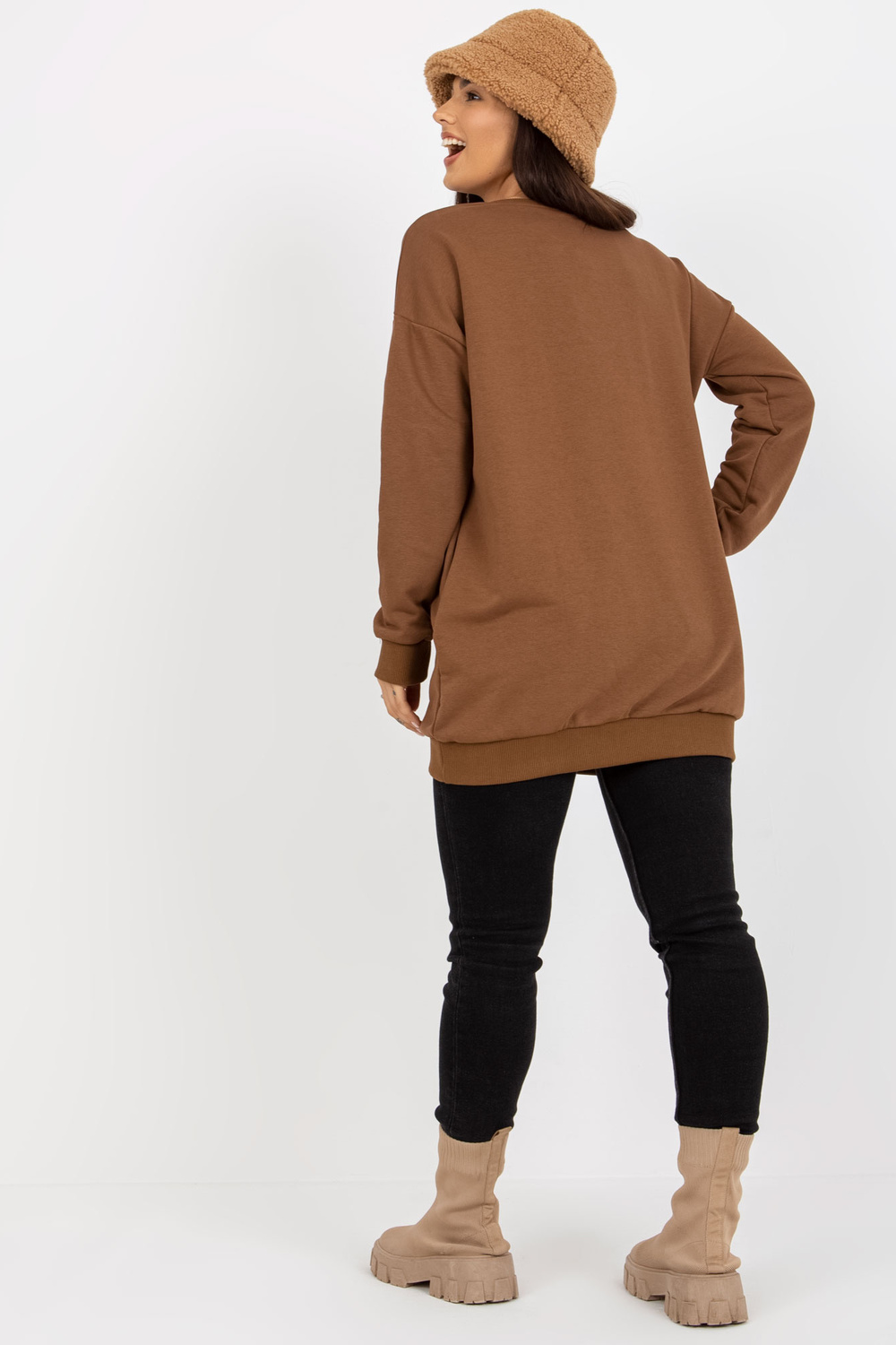 Die Maße des Sweatshirts no einer Größe werden flach gemessen: Breite unter den Achseln - 64 cm, Ärmellänge - 58 cm, Gesamtlänge - 80 cm.