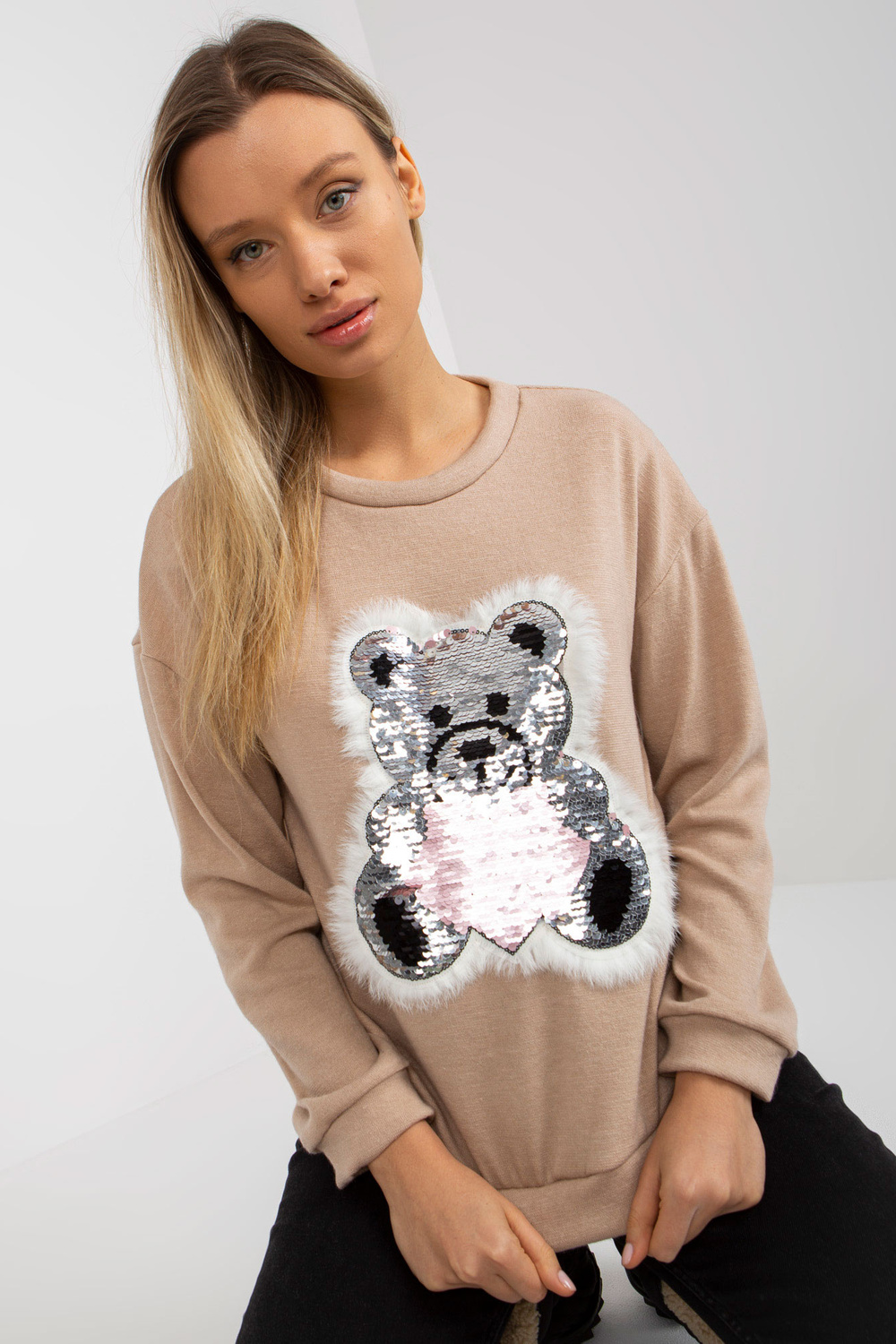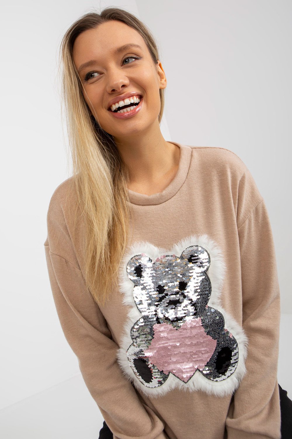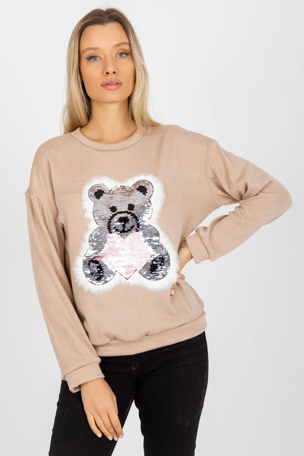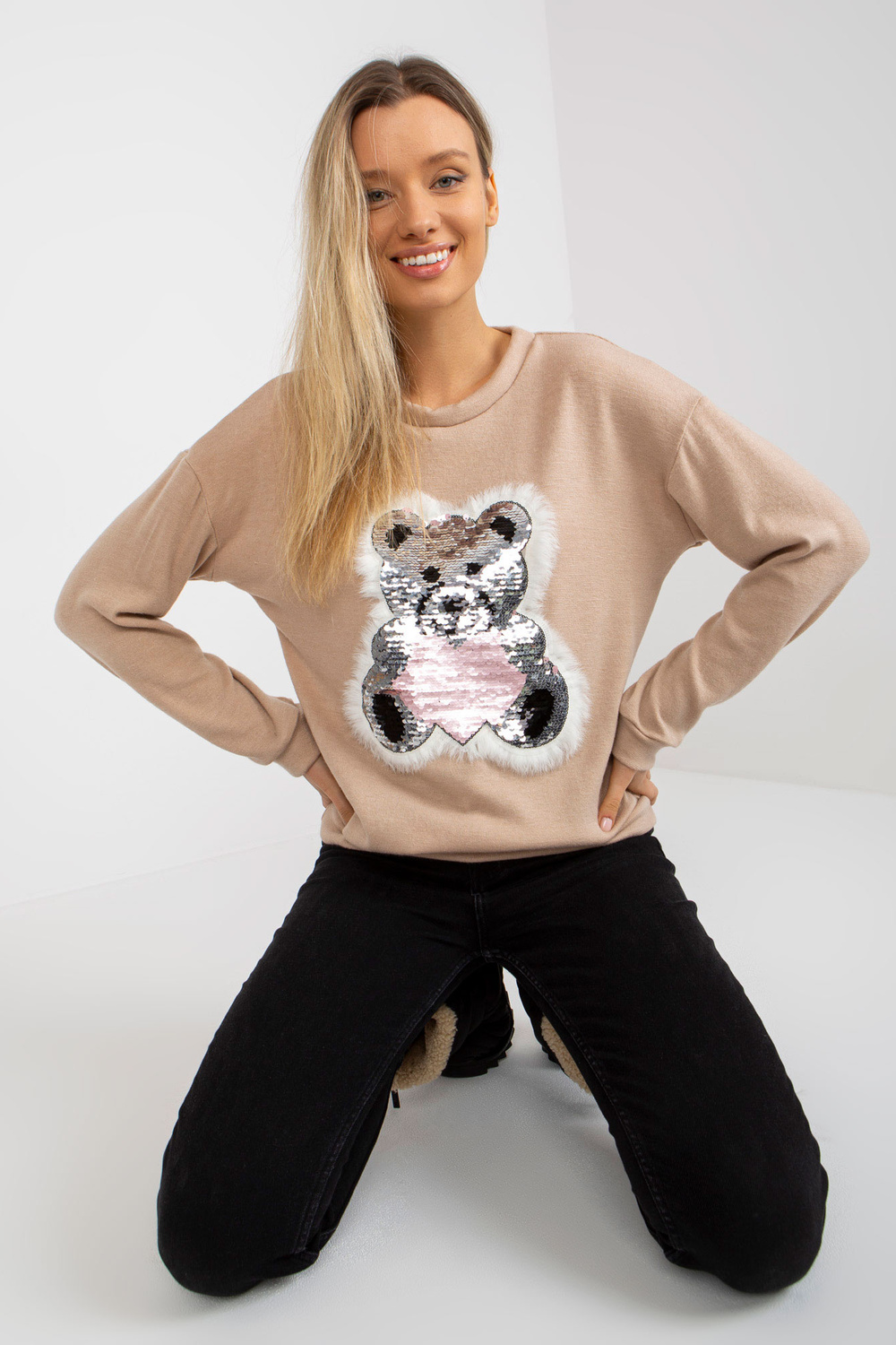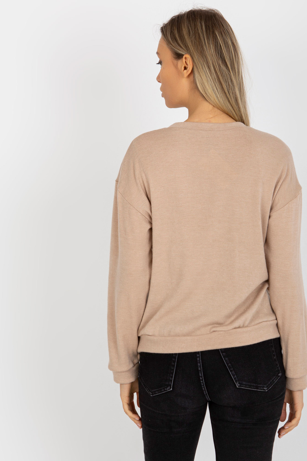 Bēšs klasisks sieviešu džemperis ar fliteru aplikāciju.