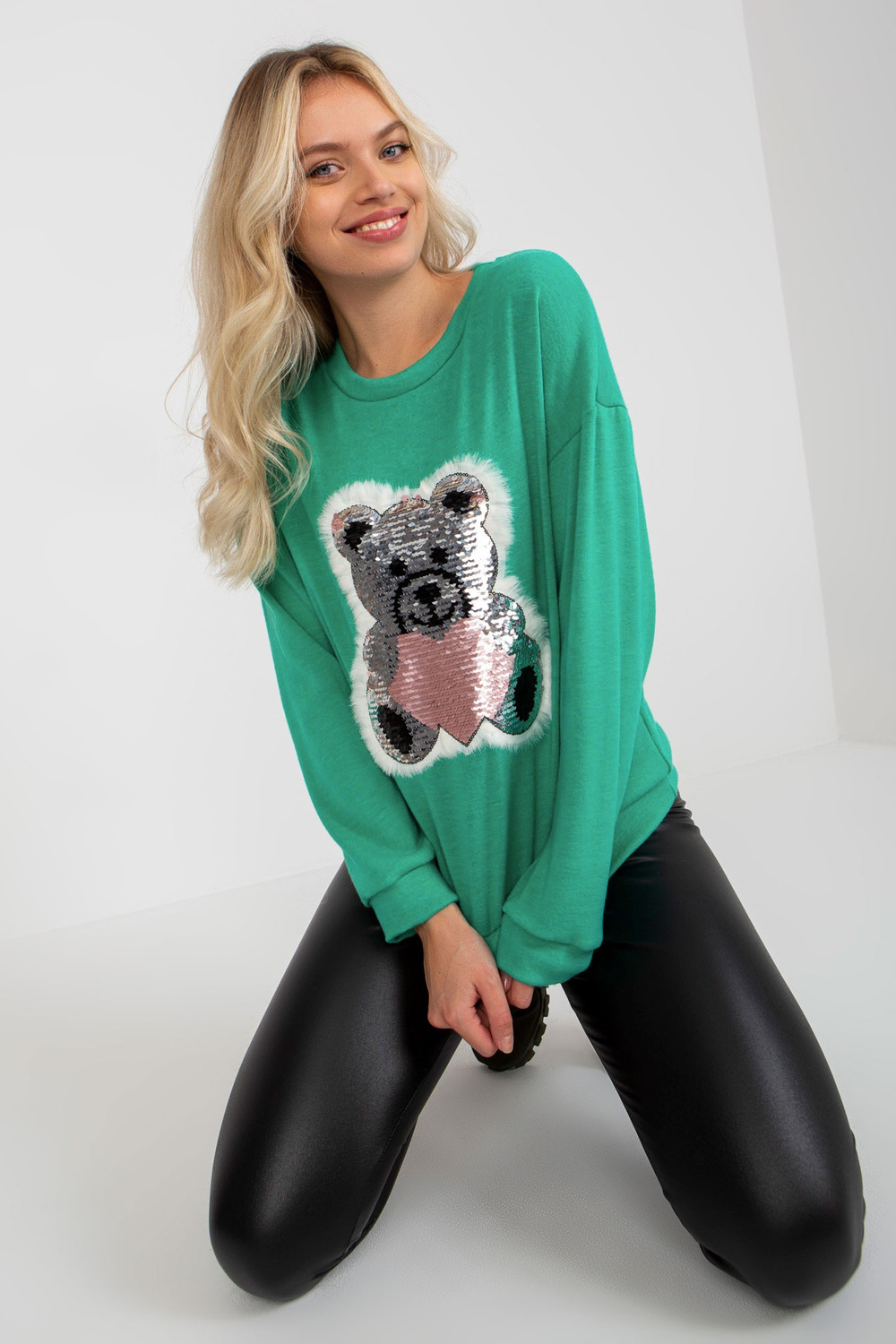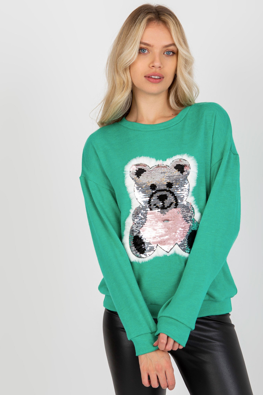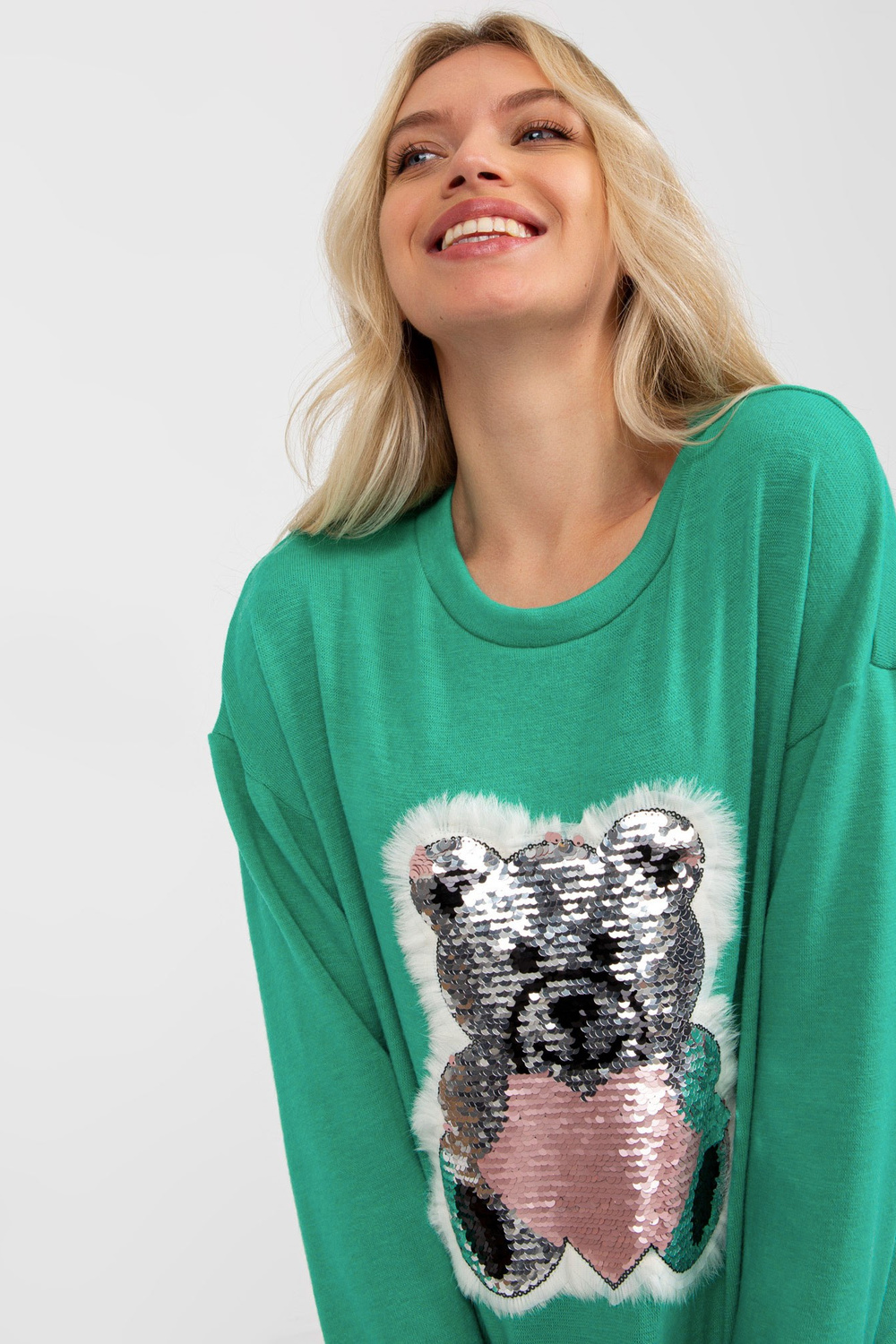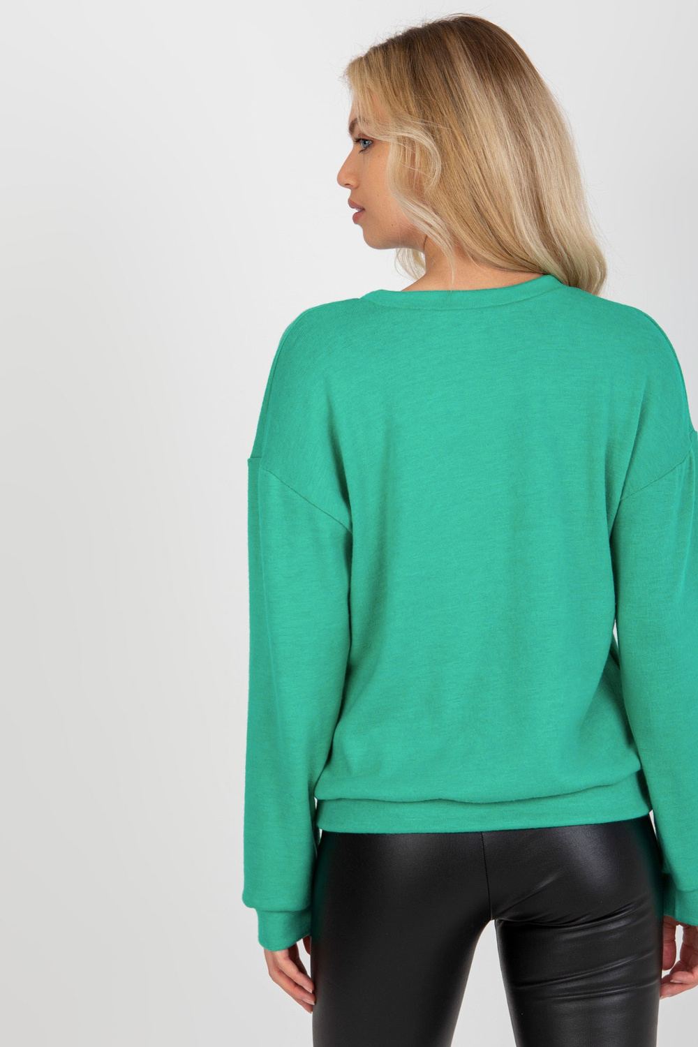 Tirkīza klasisks sieviešu džemperis ar fliteru aplikāciju.