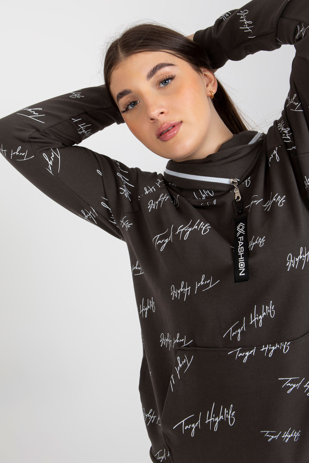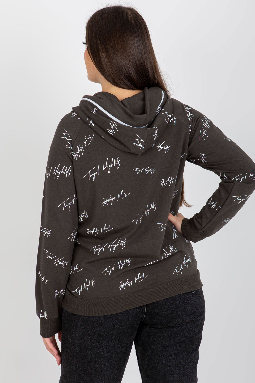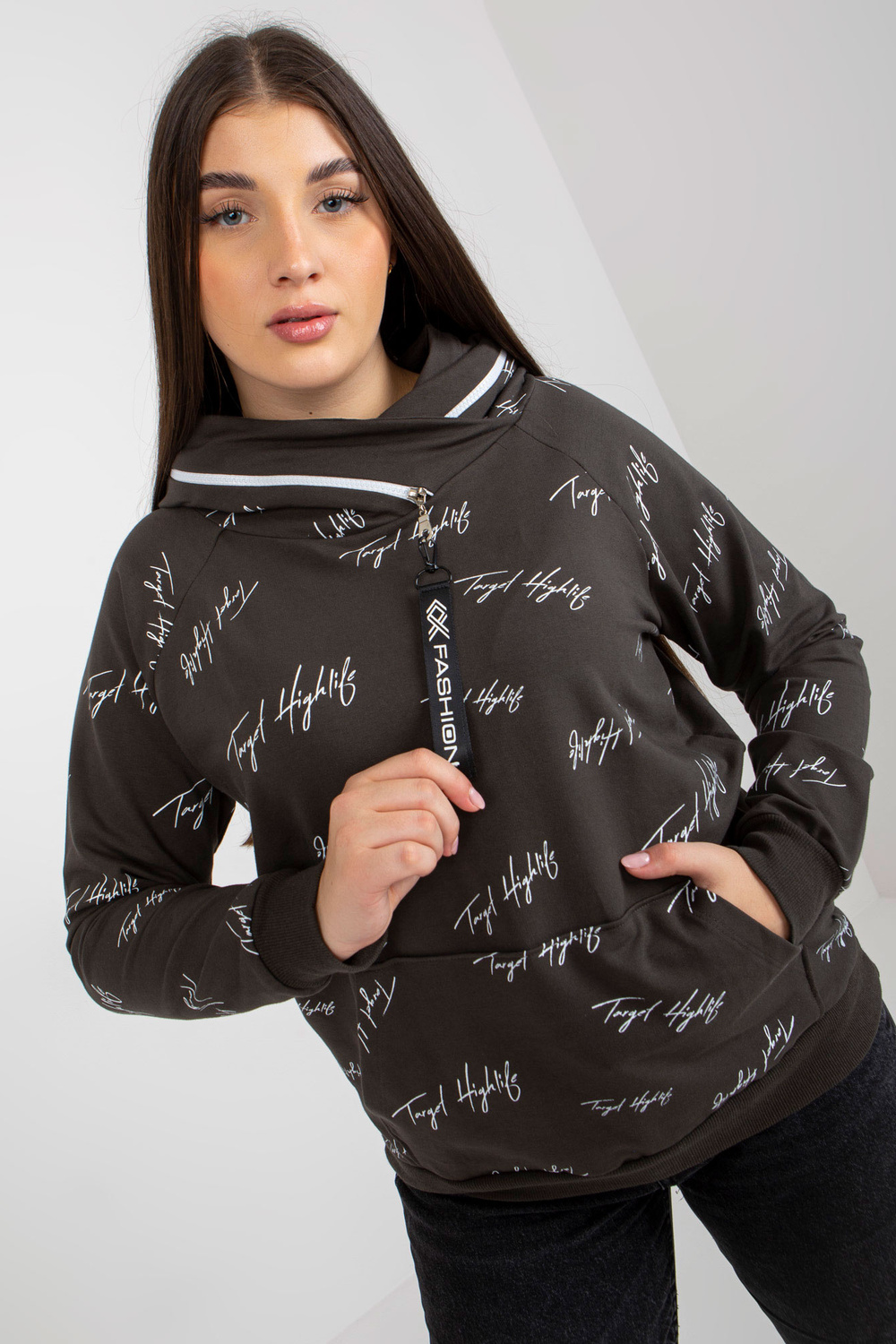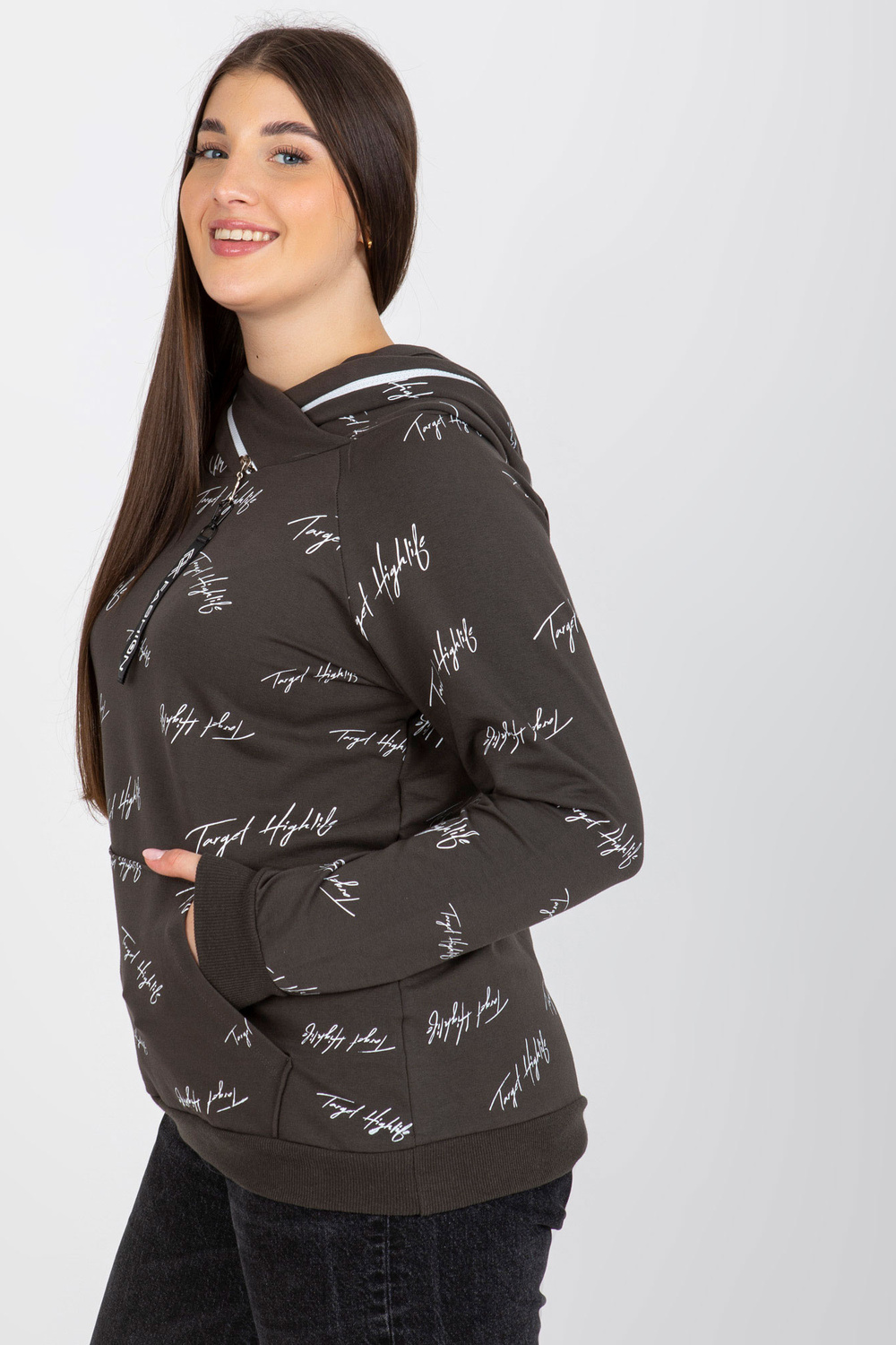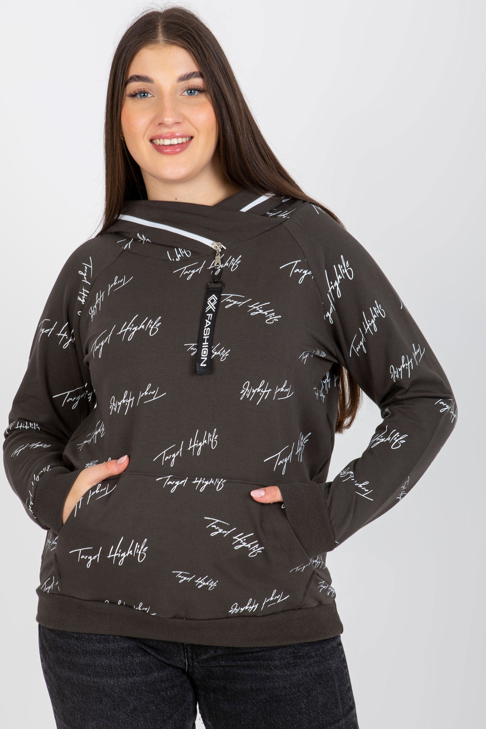 Khaki krāsas sieviešu liela izmēra sporta krekls ar kapuci un subtitriem.