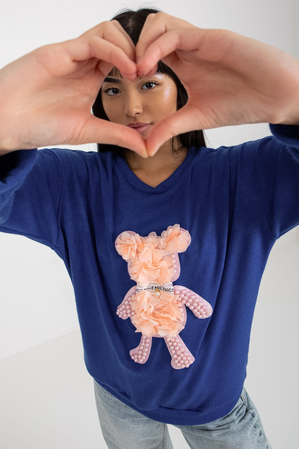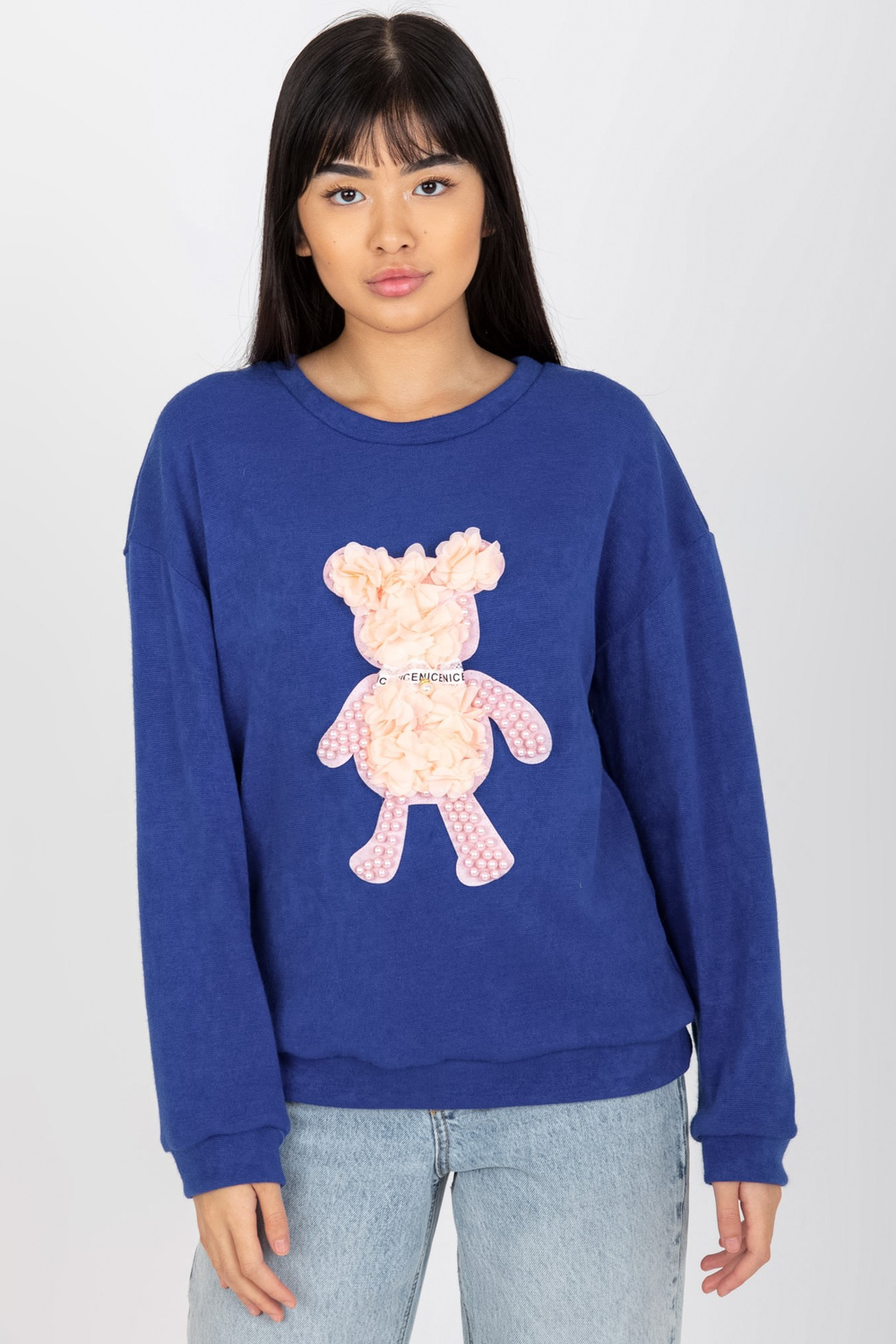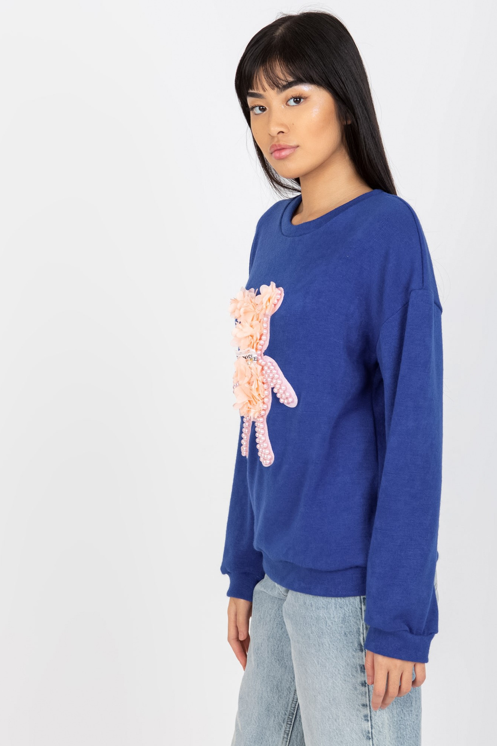 Tumši zils klasisks sieviešu džemperis ar 3D aplikāciju.
