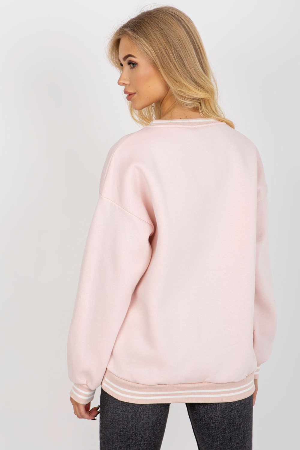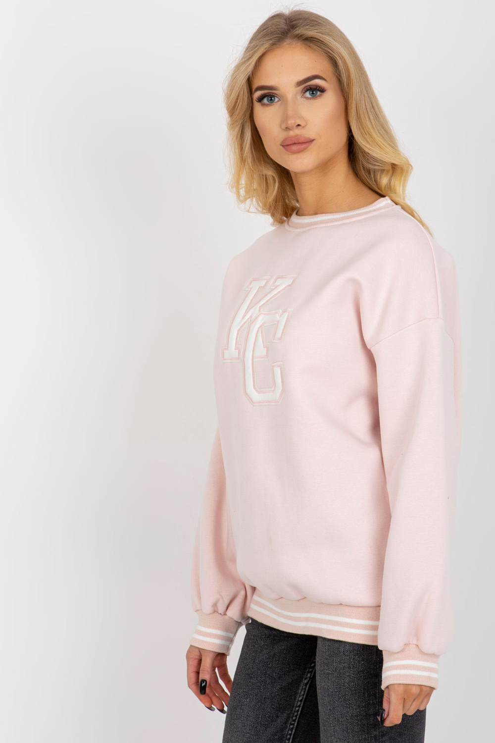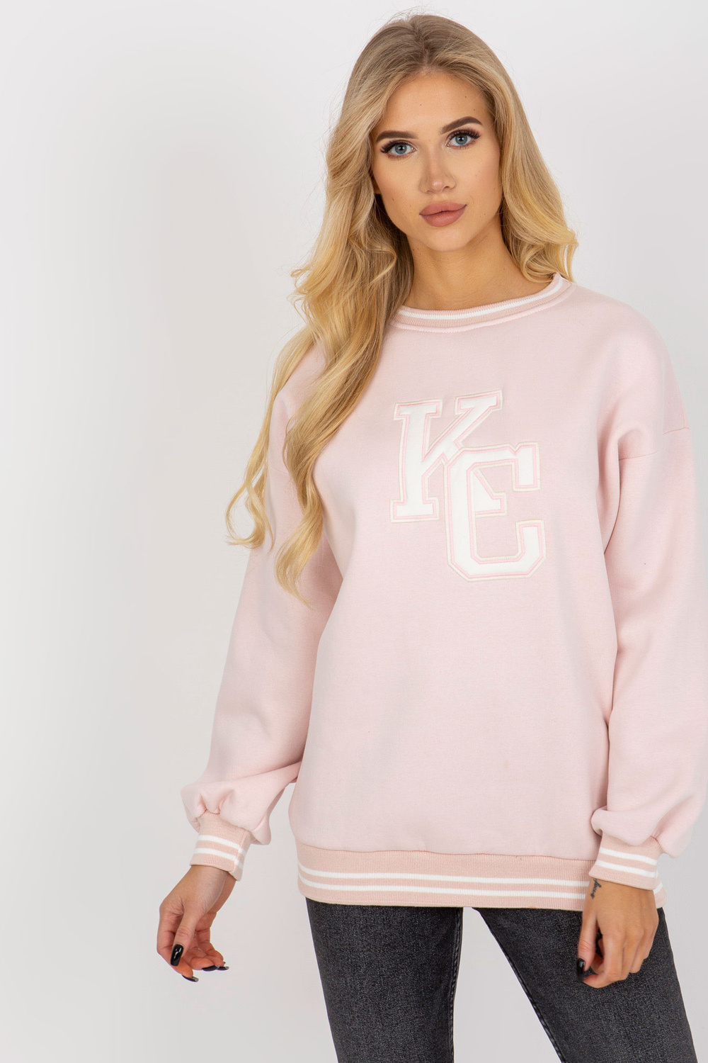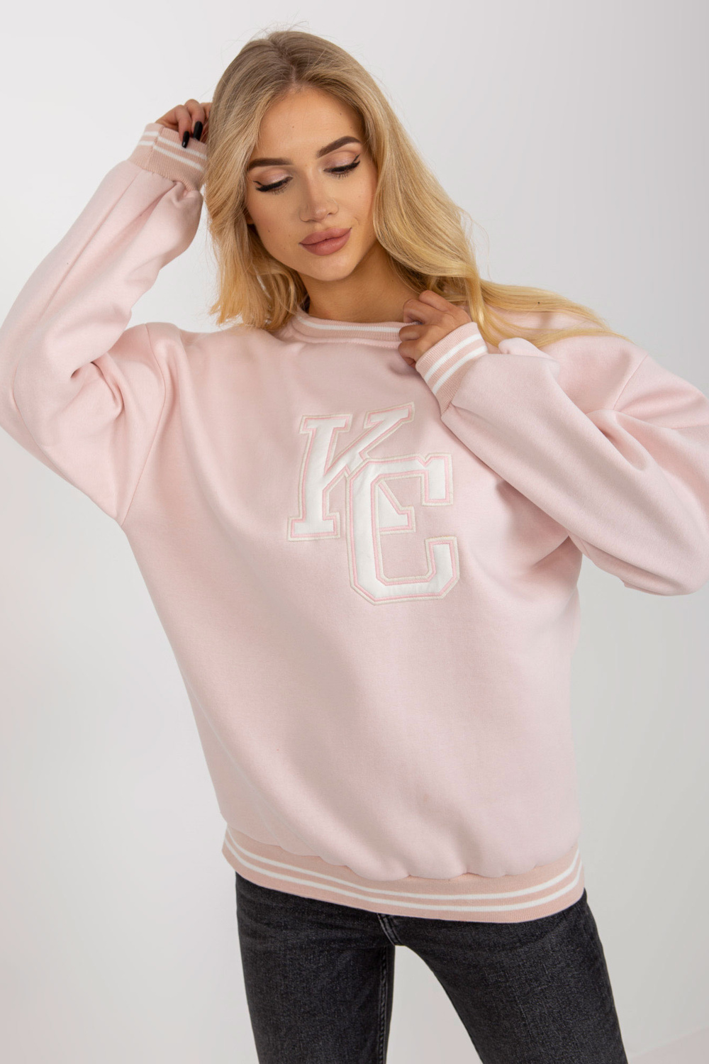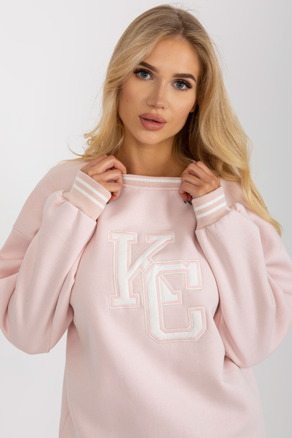 Gaiši rozā polsterēts sporta krekls bez kapuces ar ielāpu. Produkta kods: EM-BL-617-KC.86P Dominējošais raksts: izšuvums Stils: ikdienišķs gadījums: ikdienišķs, pastaigā, ārpus pilsētas Modele valkā viena izmēra izmēru. Modeļa izmēri: augums 175 cm, krūtis
