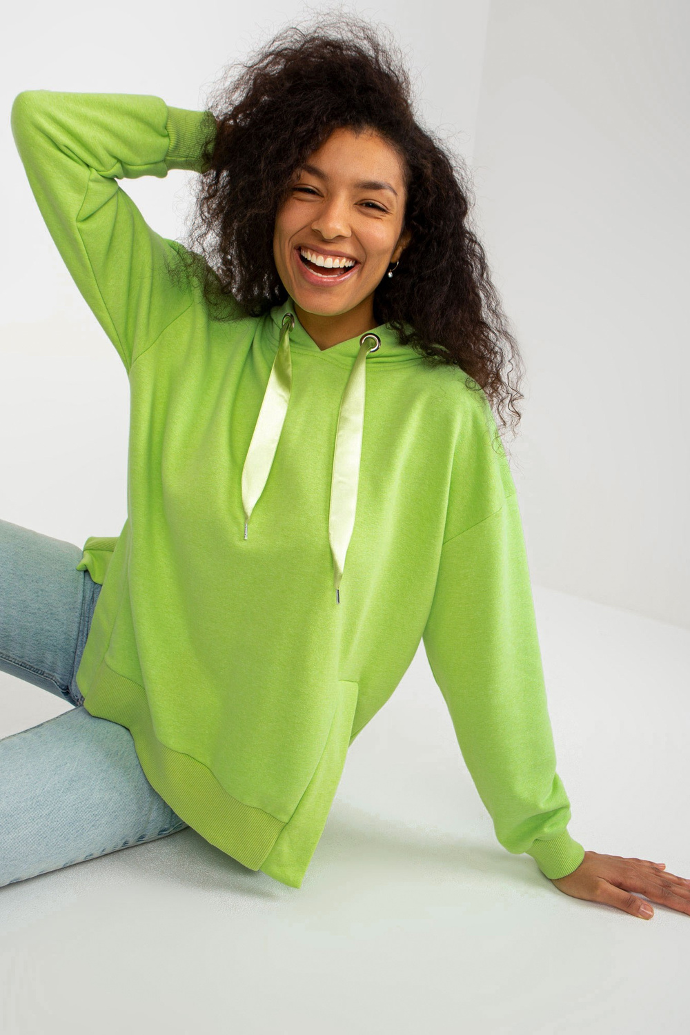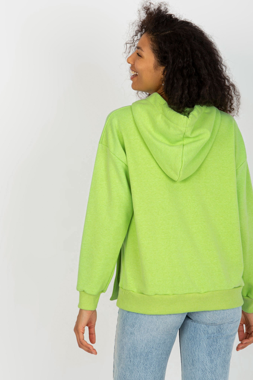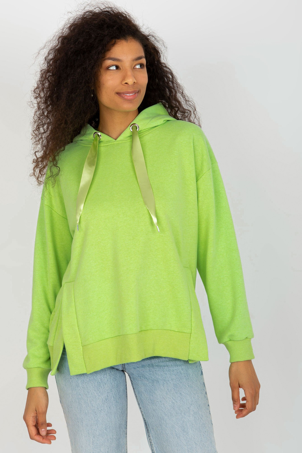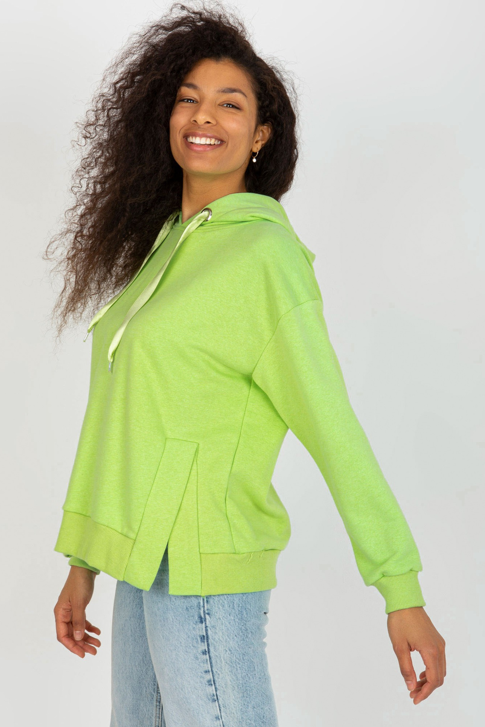 Gaiši zaļš sporta krekls ar kapuci un šķēlumiem.
